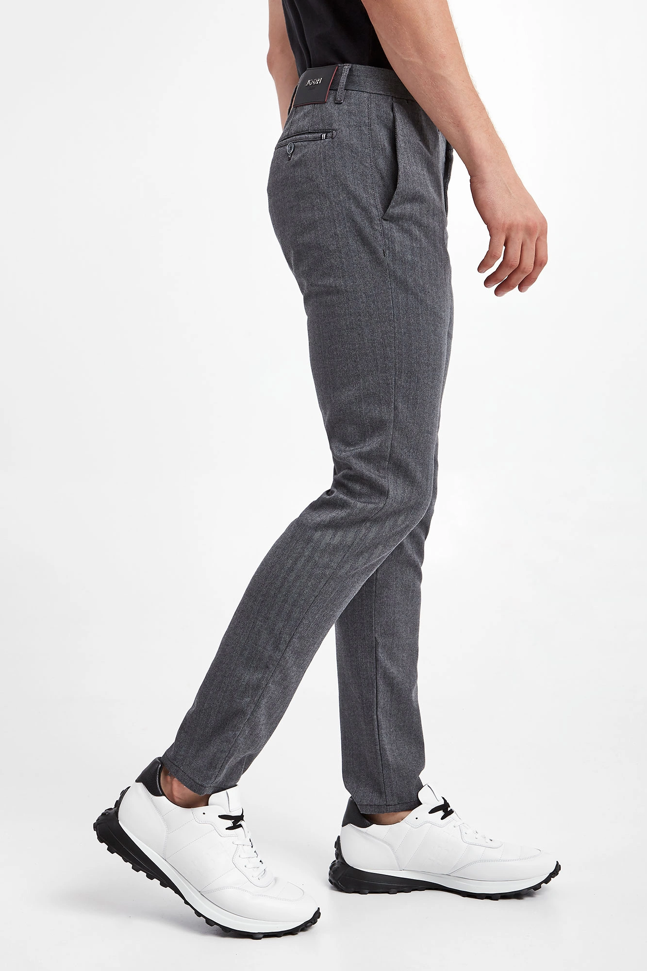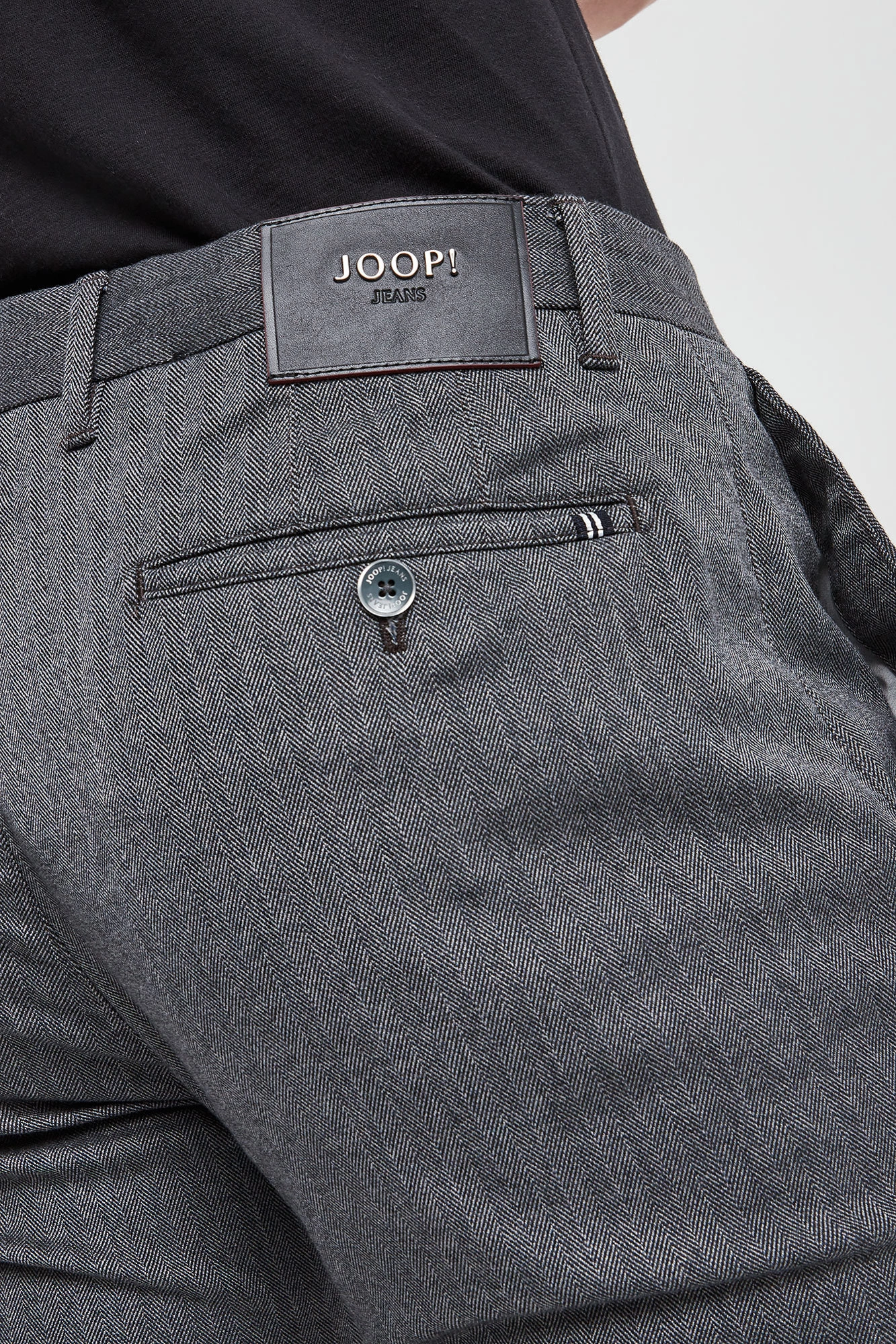Spodnie marki Joop! Jeans w szarym kolorze. Na całości wzór w jodełkę. Fason typu slim. Zapinane za pomocą zamka i sygnowanego guzika. Model z pięcioma kieszeniami. Tylne zapinane. W pasie szlufki. Nogawki zakończone lamówką. Wykonane z przyjemnej w dotyku tkaniny.