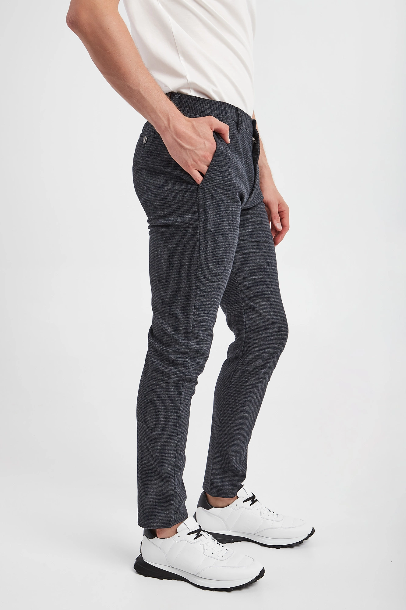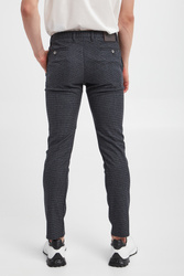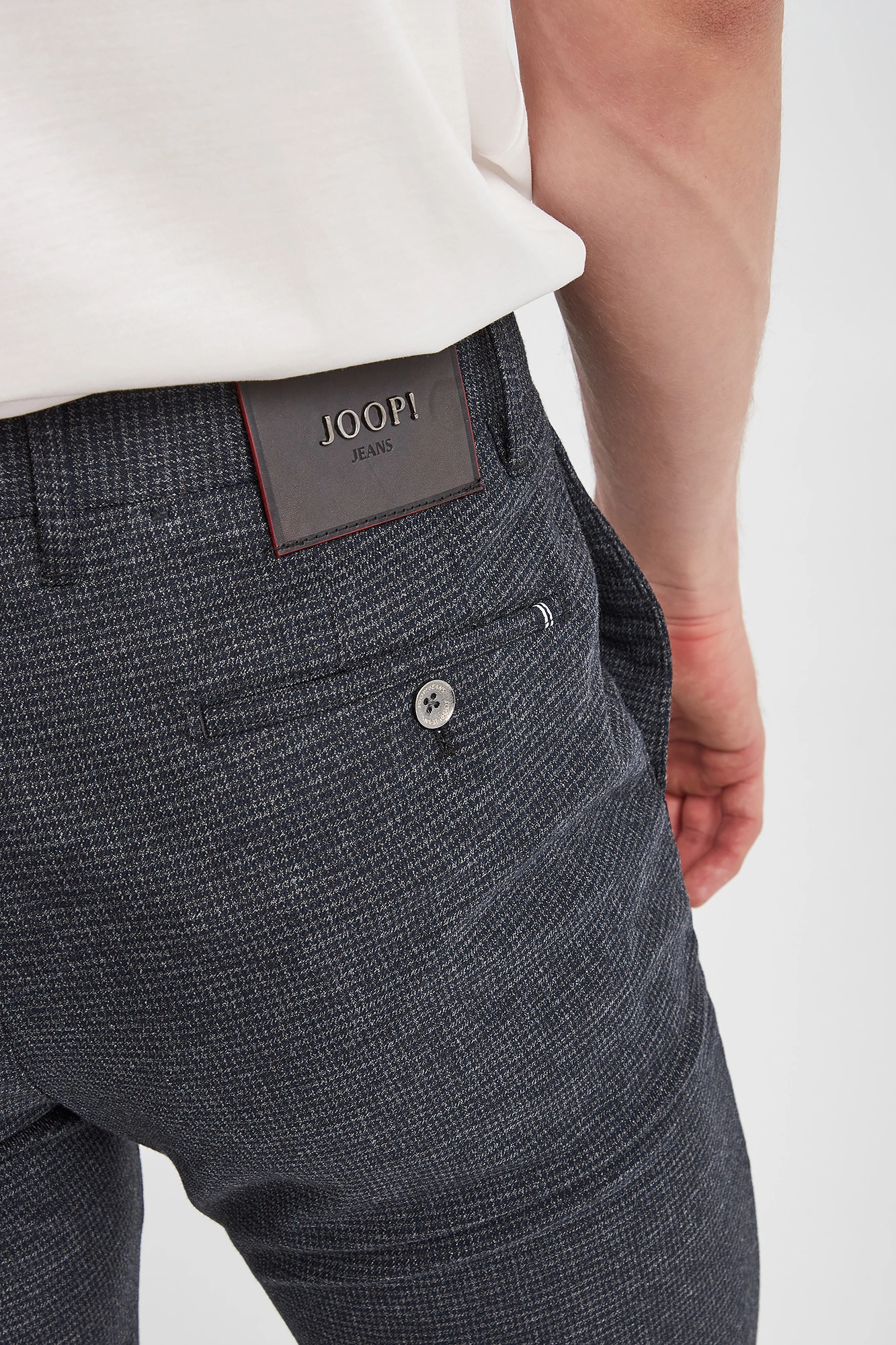 Spodnie marki Joop! Jeans w granatowo-szarą, niewielką pepitkę. Fason typu slim. Zapinane za pomocą zamka i sygnowanego guzika. Model z pięcioma kieszeniami. Tylne zapinane. W pasie szlufki. Nogawki zakończone lamówką. Wykonane z przyjemnej w dotyku tkaniny.