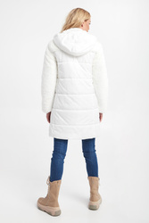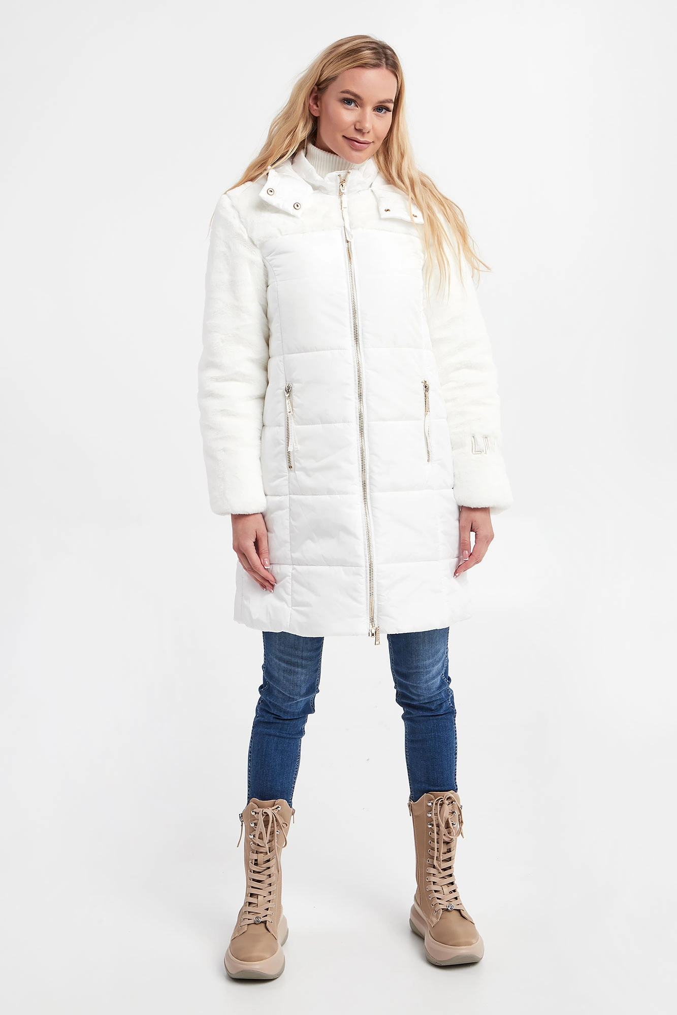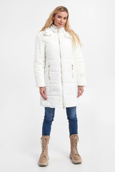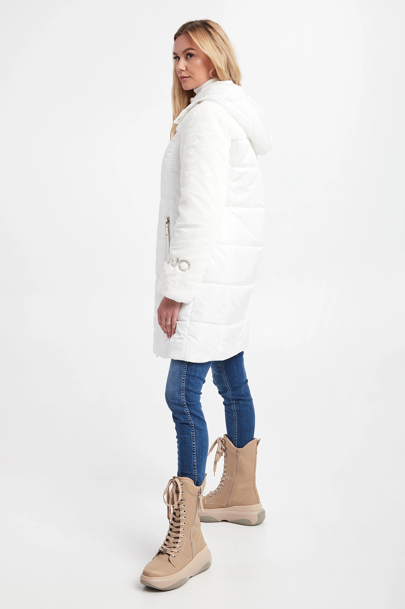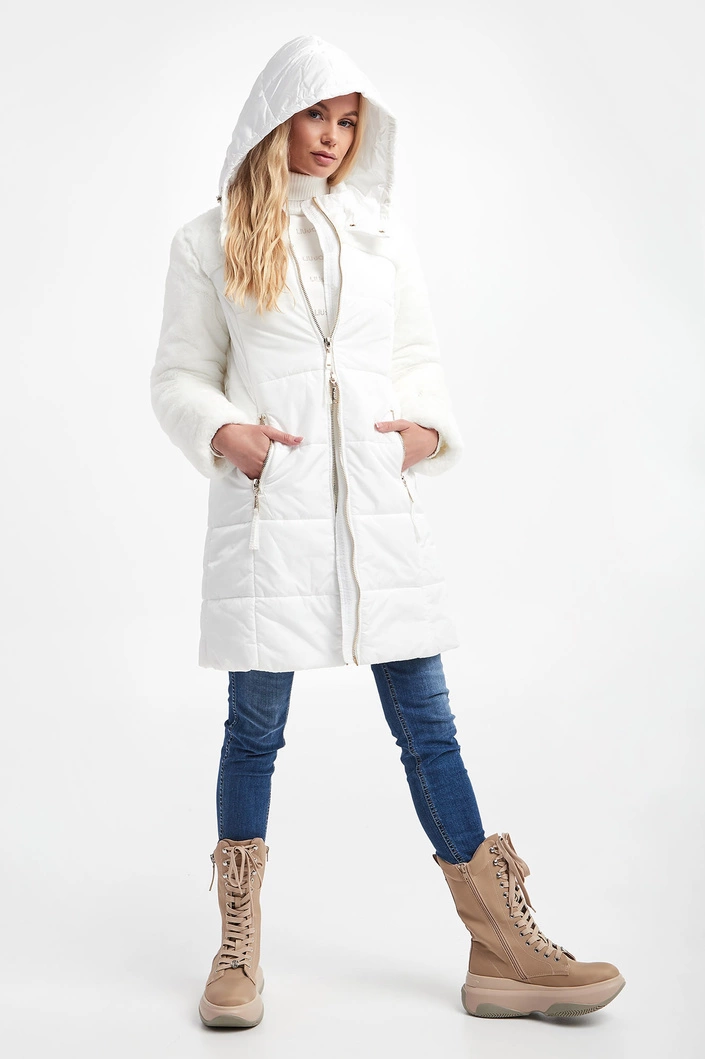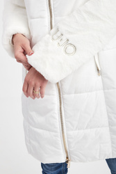 Pikowana kurtka z kapturem marki Liu Jo Sport w kolorze ecru. Zapinana na dwukierunkowy zamek z sygnowanymi zawieszkami oraz napy. Rękawy i górna część wykończone miękkim futerkiem syntetycznym. Na jednym z rękawów haft w postaci nazwy marki, wykończony metalizowaną nicią. Model z dwoma kieszeniami. Przy kapturze ściągacz ze stoperami. W zestawie pasek. Sygnowany, z klamrą, w kontrastowym kolorze. Fason typu regular.