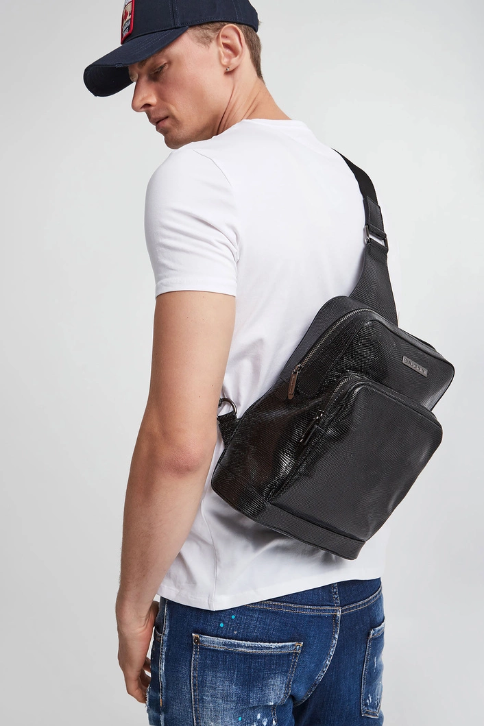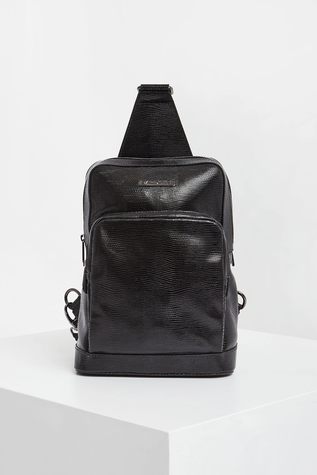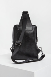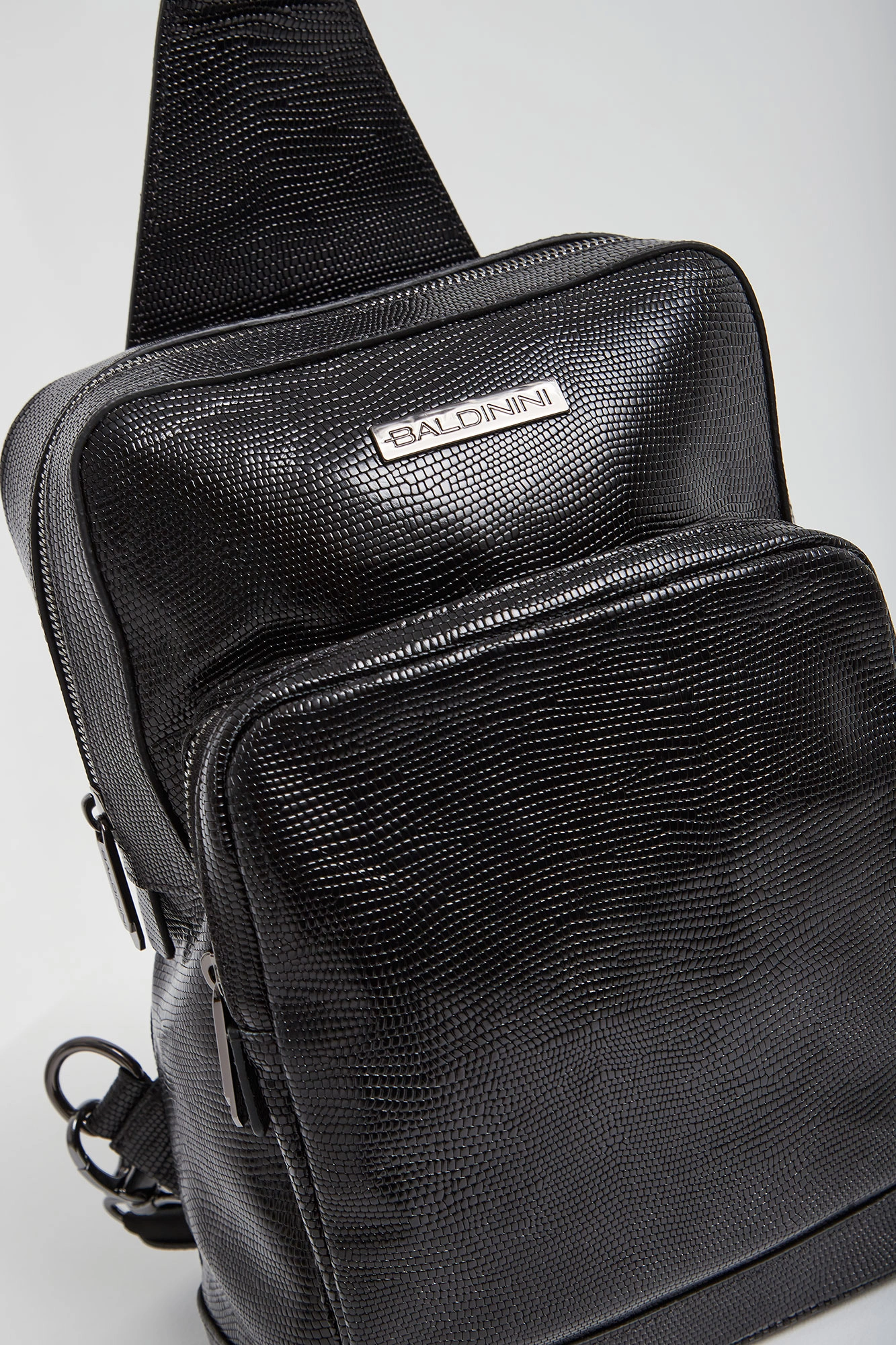 Plecak na jedno ramię marki Baldinini w czarnym kolorze. Na całości tłoczony wzór. Jednokomorowy. Z przodu metalowa aplikacja w kształcie nazwy marki i dodatkowa kieszeń. Zapinany za pomocą zamków błyskawicznych w srebrnym kolorze. Do noszenia na regulowanym, materiałowym pasku. Wykonany z naturalnej skóry.