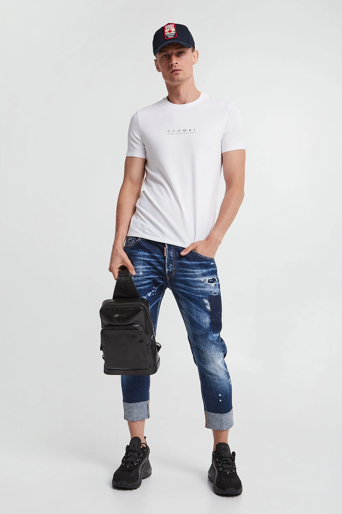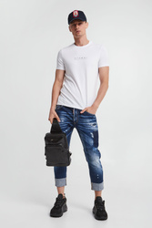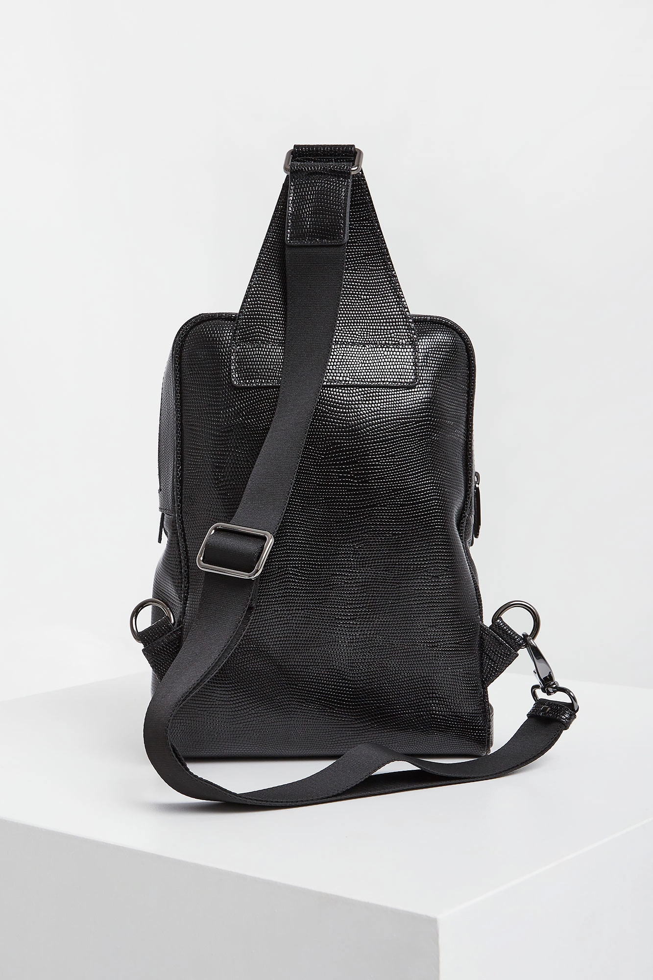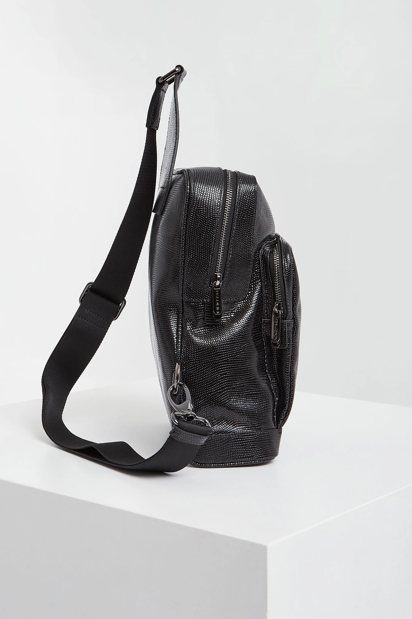 Plecak na jedno ramię marki Baldinini w czarnym kolorze. Na całości tłoczony wzór. Jednokomorowy. Z przodu metalowa aplikacja w kształcie nazwy marki i dodatkowa kieszeń. Zapinany za pomocą zamków błyskawicznych w srebrnym kolorze. Do noszenia na regulowanym, materiałowym pasku. Wykonany z naturalnej skóry.