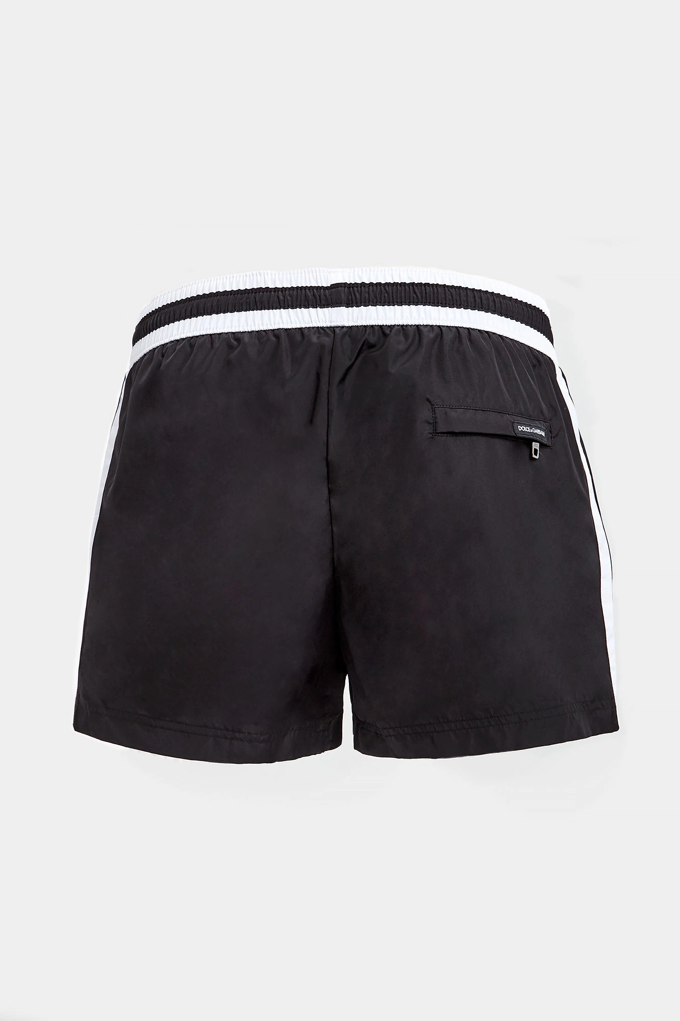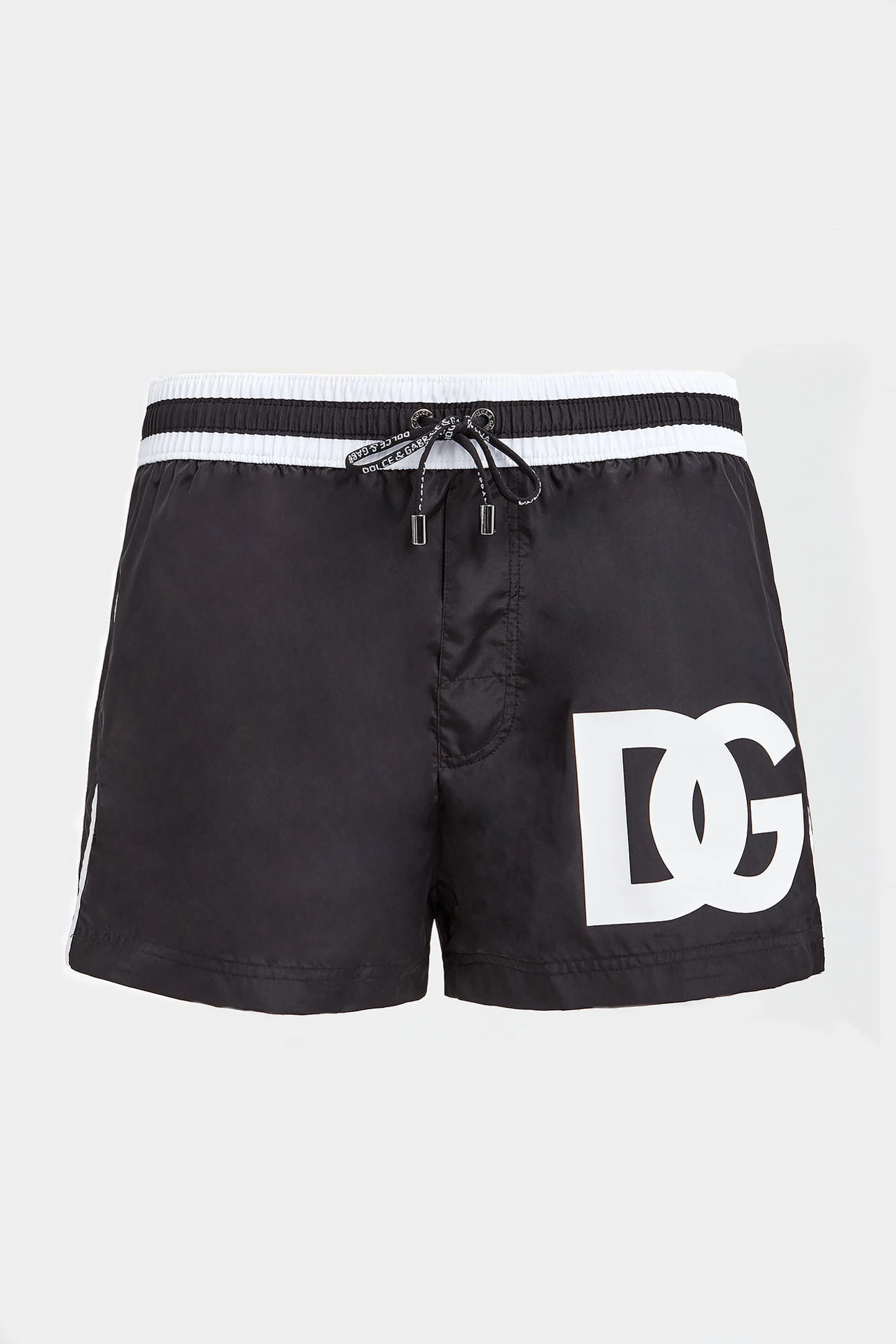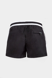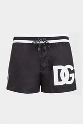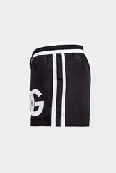 Szorty kąpielowe marki Dolce & Gabbana w czarnym kolorze. W talii elastyczny ściągacz w czarno-białym kolorze, regulowany za pomocą sygnowanych troczków. Z przodu duży nadruk z monogramem marki w białym kolorze. Z tyłu zapinana za pomocą zamka kieszeń. Fason typu regular.