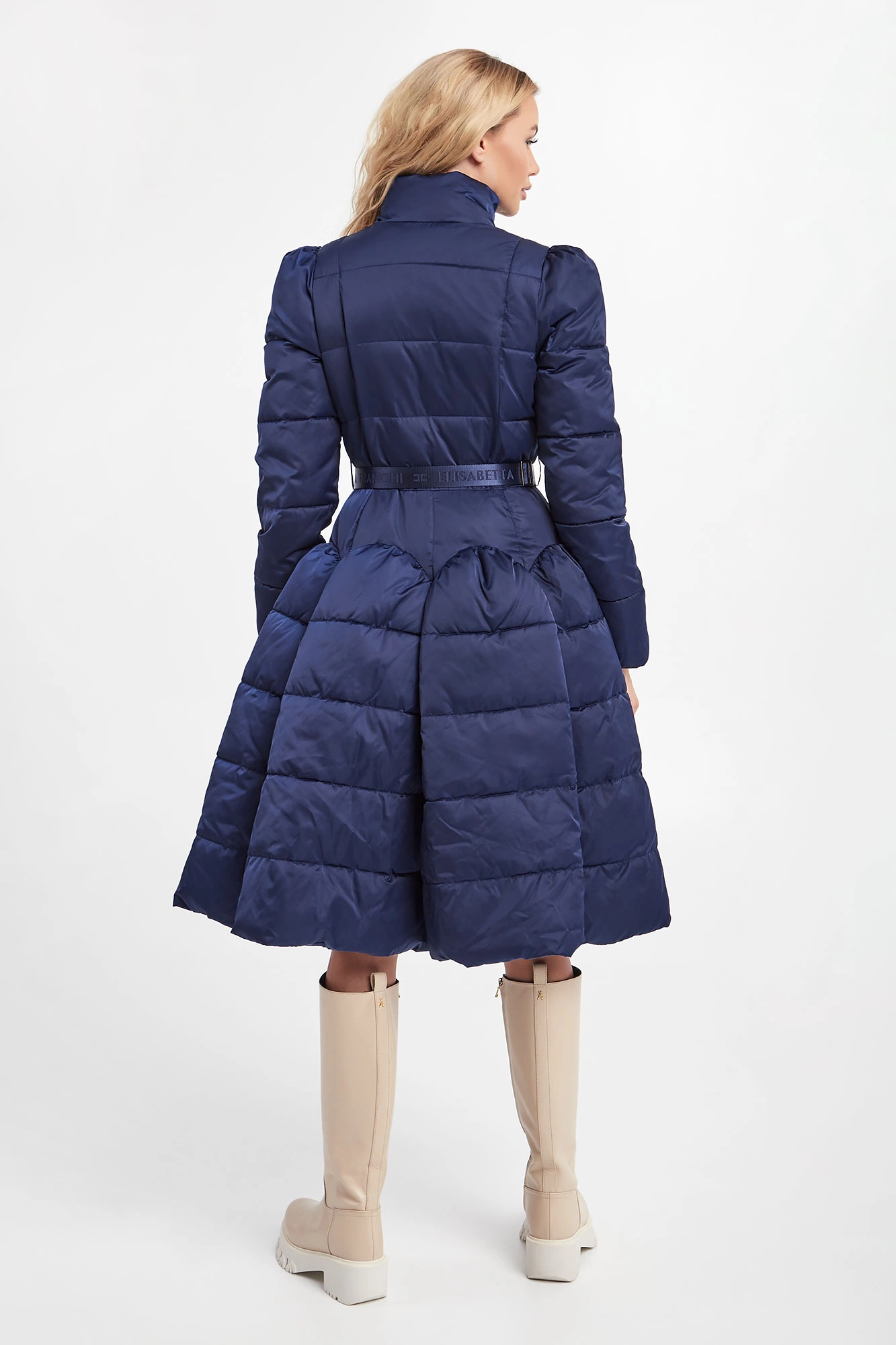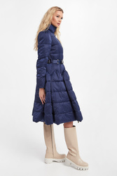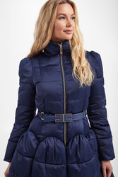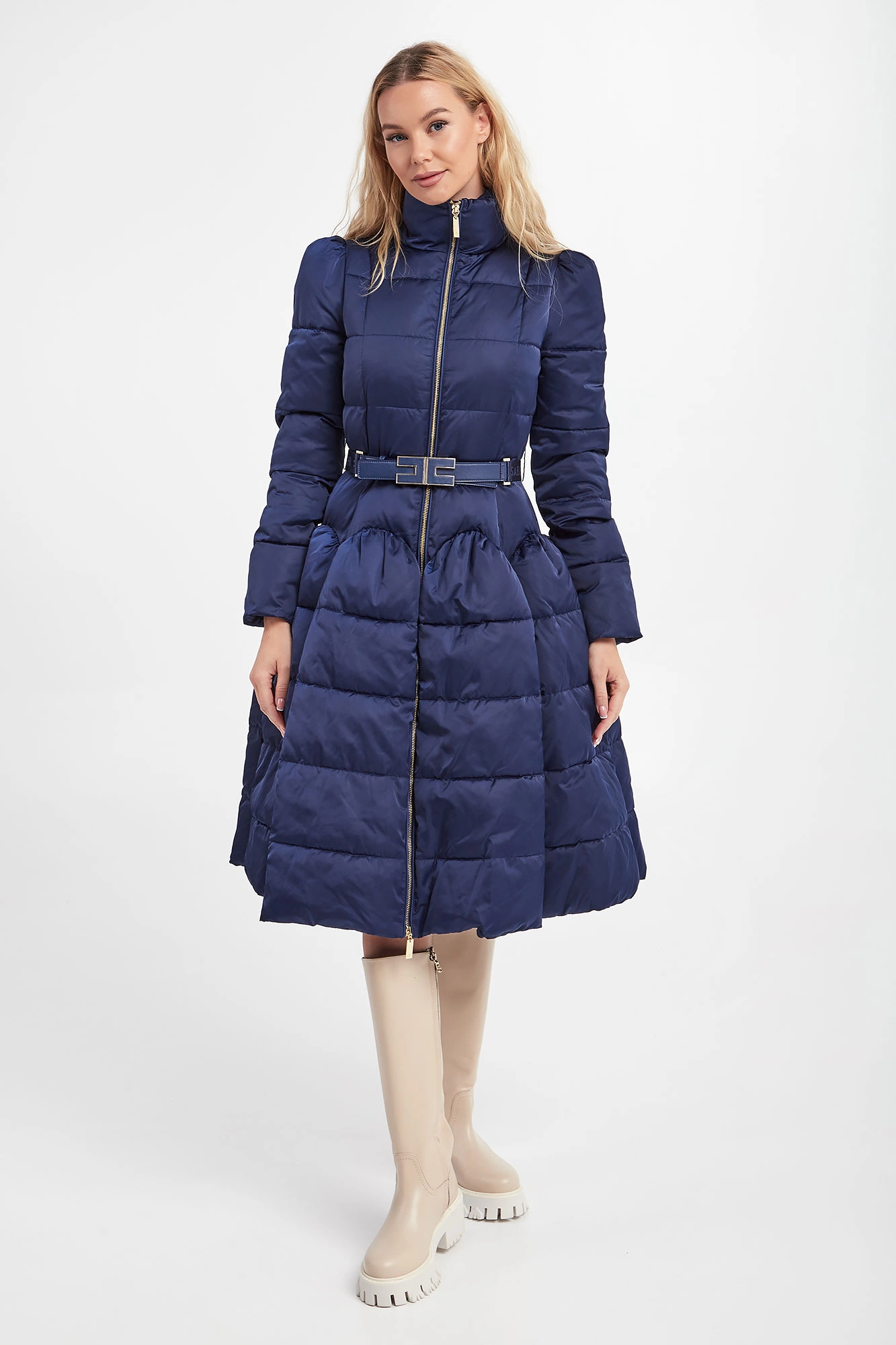 Pikowany płaszcz ze stójką marki Elisabetta Fracnhi w granatowym kolorze. Zapinany na dwukierunkowy zamek z sygnowanymi zawieszkami. Lekko bufiaste rękawy zakończone ściągaczem. W talii szlufki i sygnowany pasek z klamrą z logo marki. Po bokach dwie kieszenie na zamek. Dół rozkloszowany, układa się w szeroką falbanę. Fason typu slim.