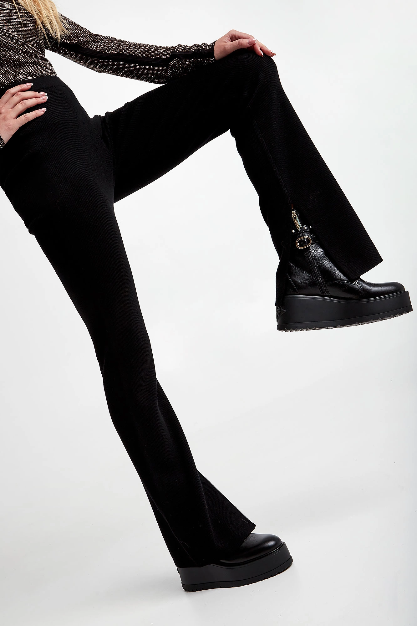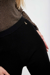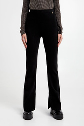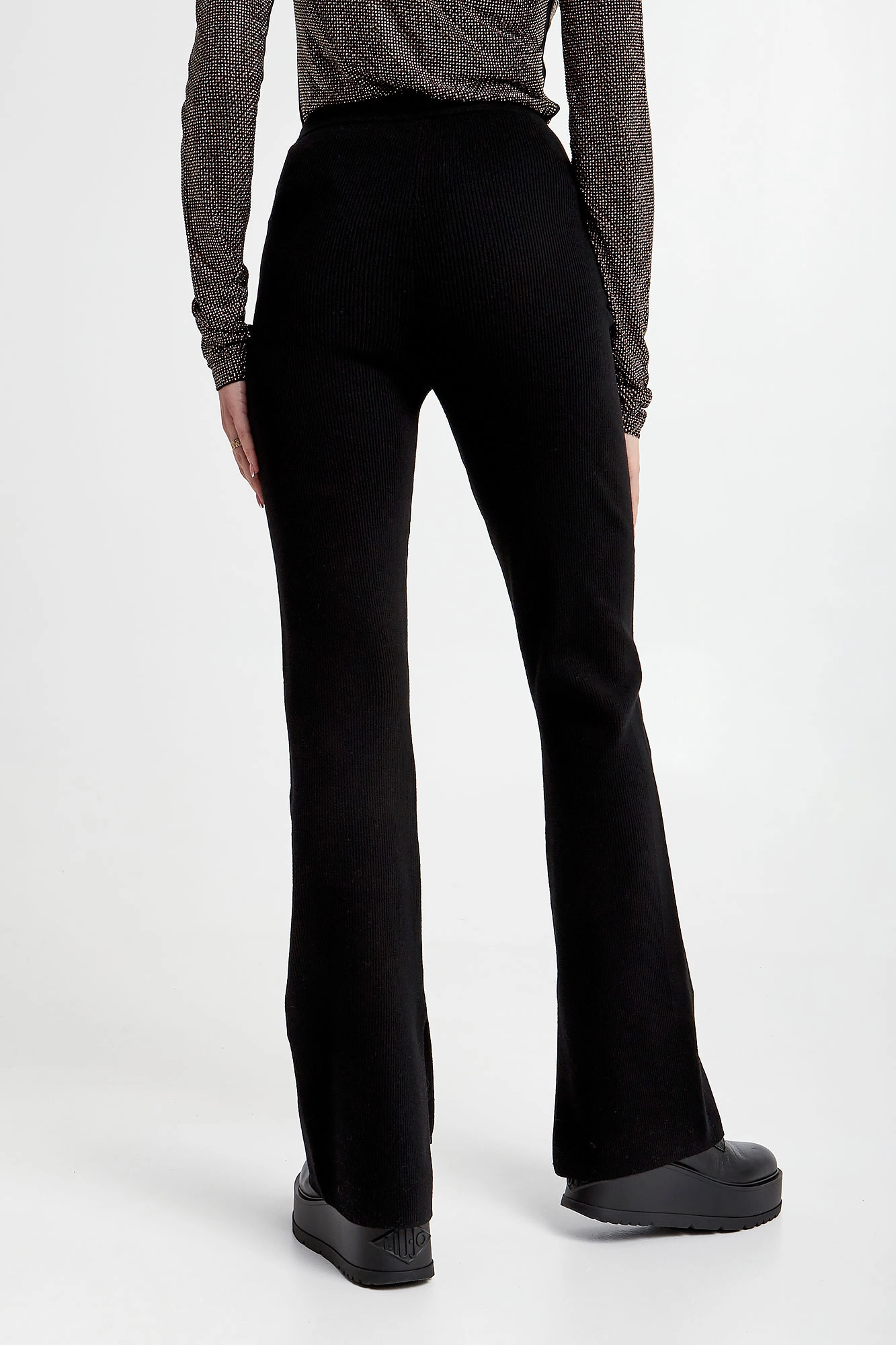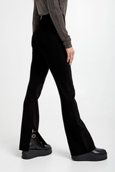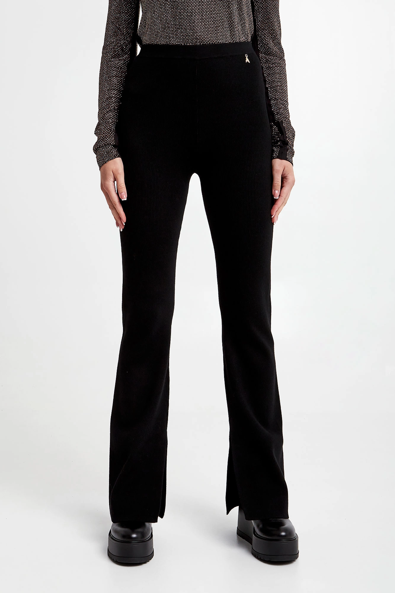 Wełniane spodnie marki Patrizia Pepe w czarnym kolorze. Na całości prążki, a po bokach lampasy z drobnymi prążkami. U dołu nogawek, po wewnętrznej stronie rozcięcia. Na froncie zawieszka z owadzim logo w złotym kolorze. W pasie elastyczny ściągacz. Fason typu flared, z wysokim stanem.
