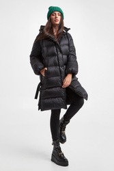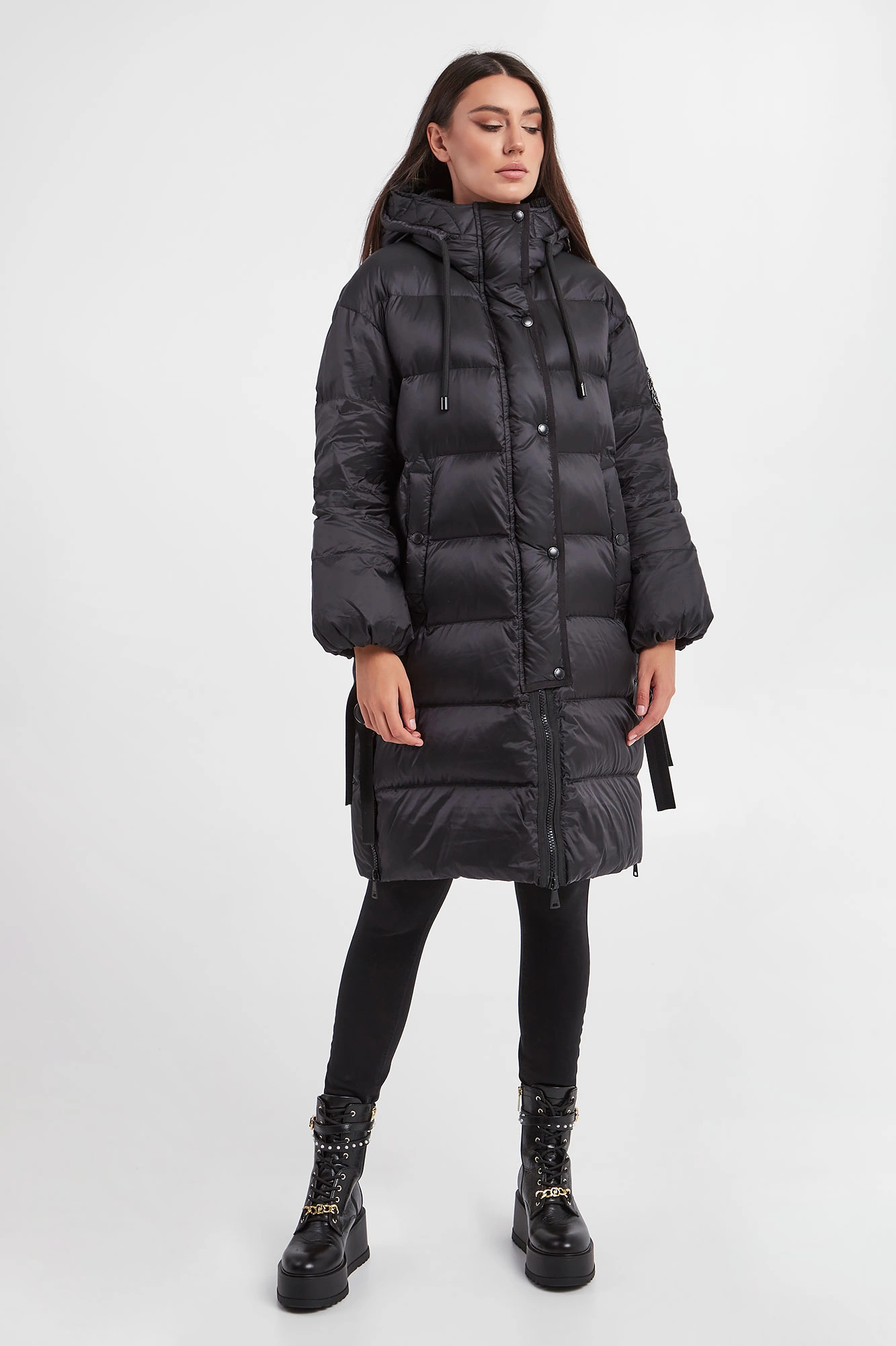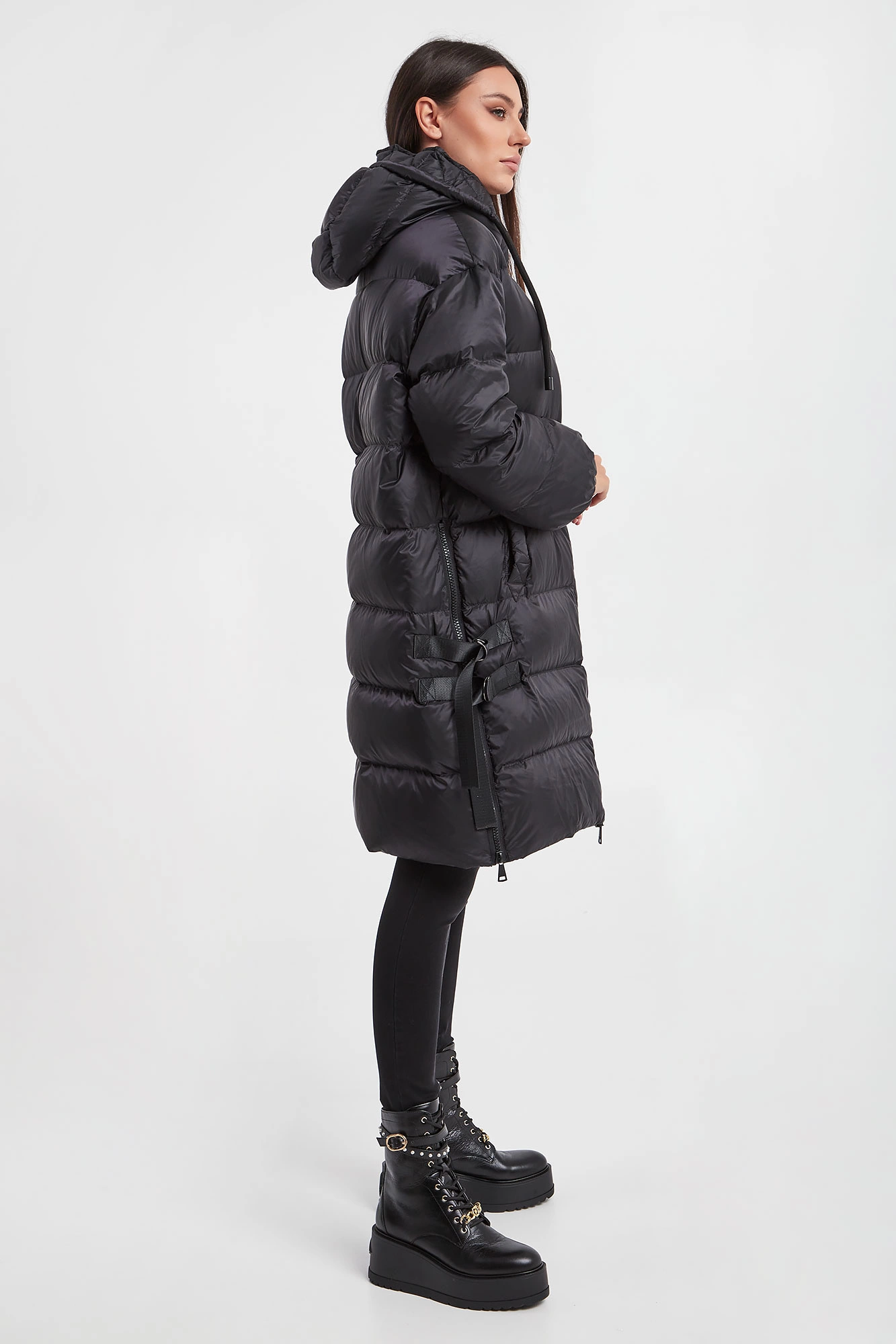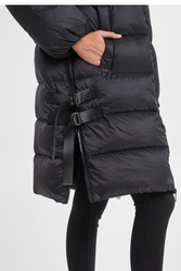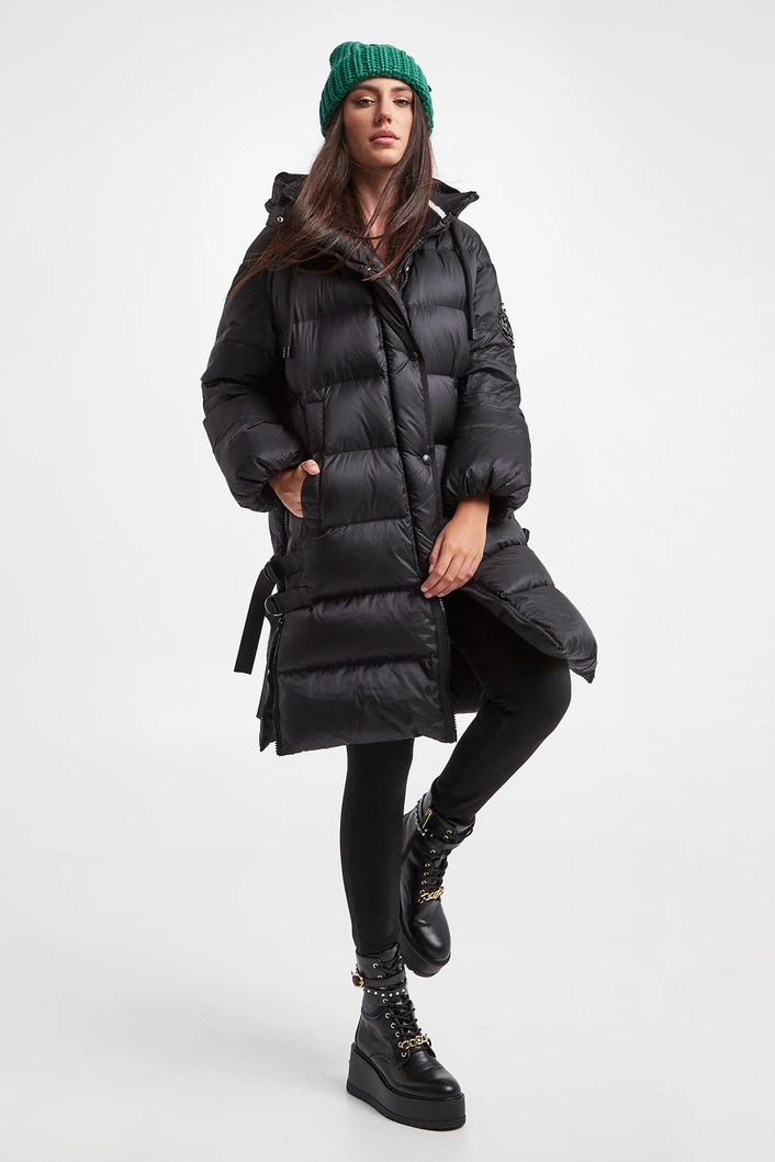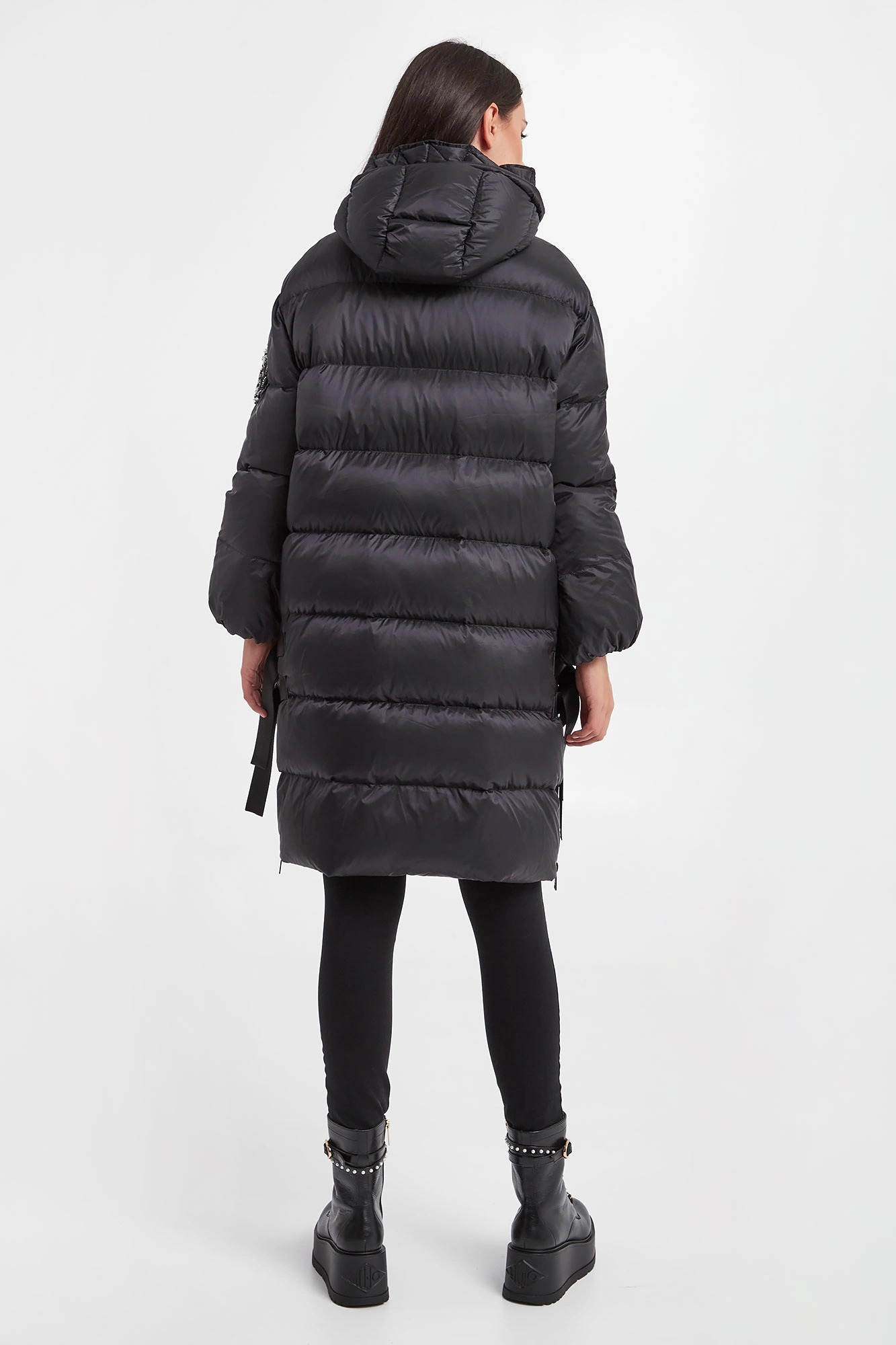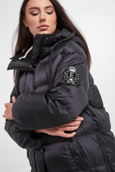 Puchowy pikowany płaszcz marki Ermmano Firenze w czarnym kolorze. Z kapturem. Zapinany za pomocą dwustronnego zamka oraz nap. Na rękawie ozdobne logo marki wykonane z kryształków i koralików. Kołnierz ze stójką wykończony biało-czarnym, prążkowanym ściągaczem. Dwie boczne zamykane kieszenie. Boki rozpinane i zapinane za pomocą pasków. Rękawy zakończone ściągaczami. Kaptur regulowany za pomocą troczków. Wypełnienie naturalne. Fason typu relaxed.