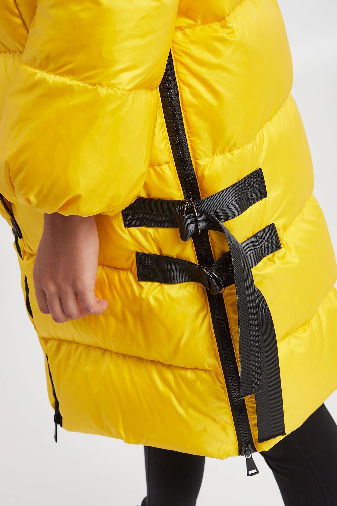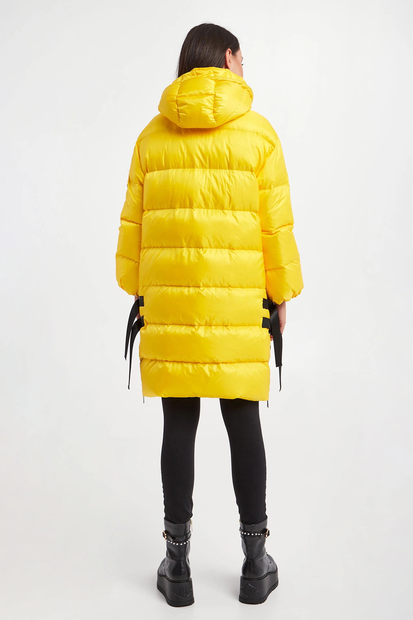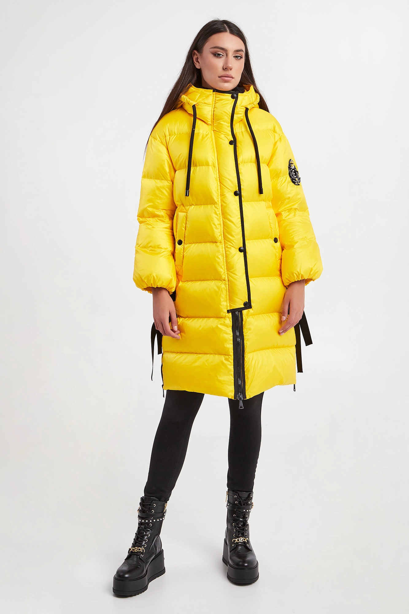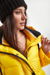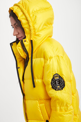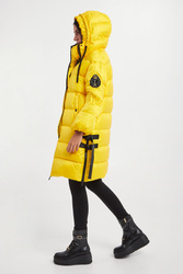 Puchowy pikowany płaszcz marki Ermmano Firenze w żółtym kolorze. Z kapturem. Zapinany za pomocą dwustronnego zamka oraz nap. Na rękawie ozdobne logo marki wykonane z kryształków i koralików. Kołnierz ze stójką wykończony biało-czarnym, prążkowanym ściągaczem. Dwie boczne zamykane kieszenie. Boki rozpinane i zapinane za pomocą pasków. Rękawy zakończone ściągaczami. Kaptur regulowany za pomocą kontrastujących troczków. Wypełnienie naturalne. Fason typu relaxed.