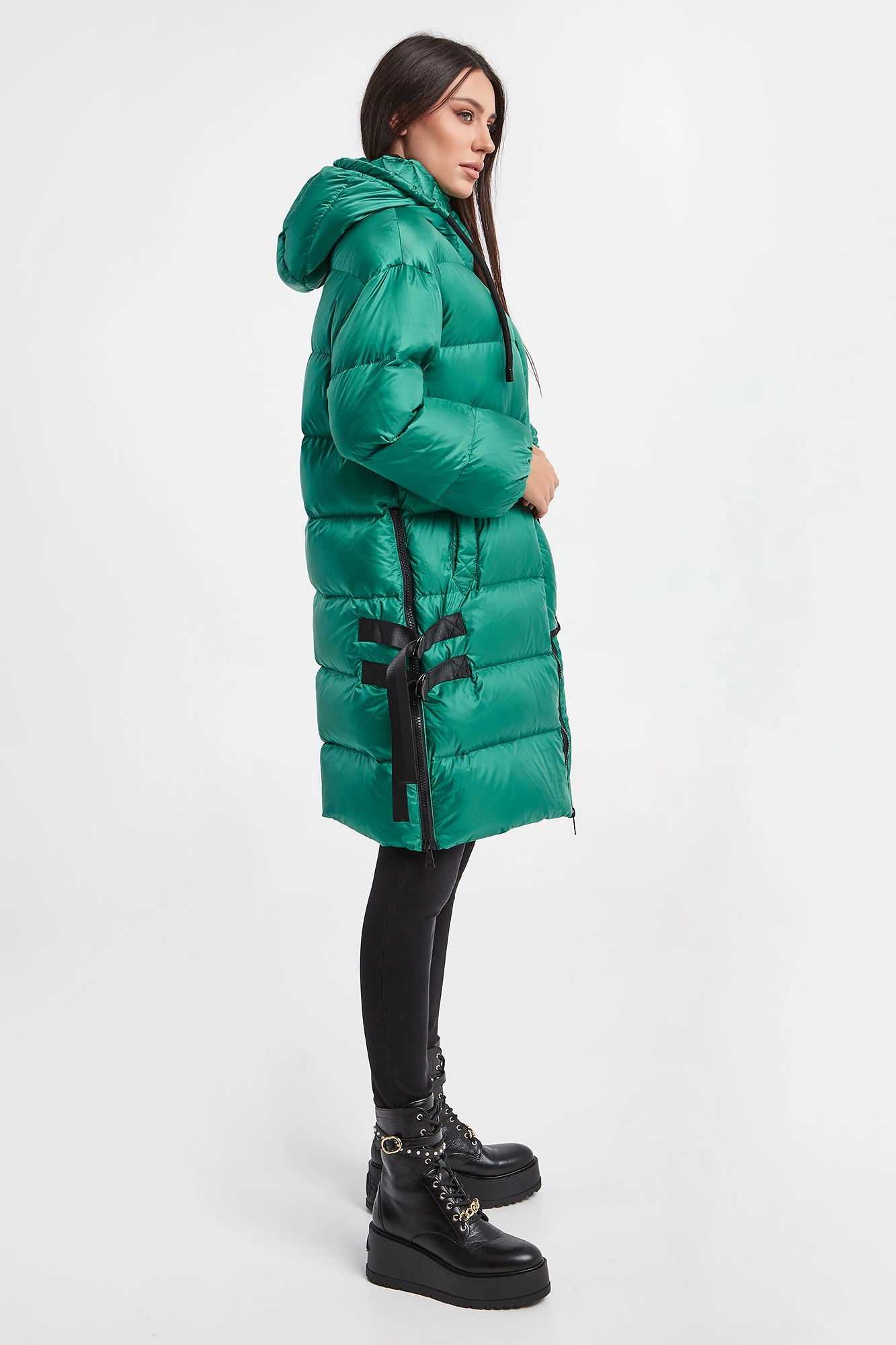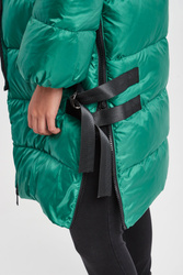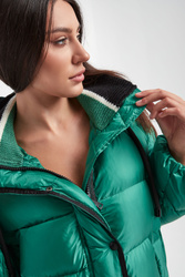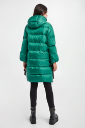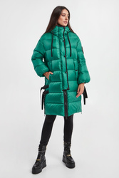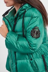 Puchowy pikowany płaszcz marki Ermmano Firenze w zielonym kolorze. Z kapturem. Zapinany za pomocą dwustronnego zamka oraz nap. Na rękawie ozdobne logo marki wykonane z kryształków i koralików. Kołnierz ze stójką wykończony biało-czarnym, prążkowanym ściągaczem. Dwie boczne zamykane kieszenie. Boki rozpinane i zapinane za pomocą pasków. Rękawy zakończone ściągaczami. Kaptur regulowany za pomocą troczków. Wypełnienie naturalne. Fason typu relaxed.
