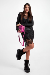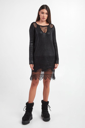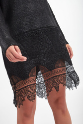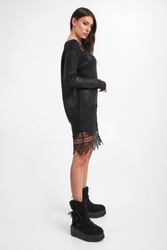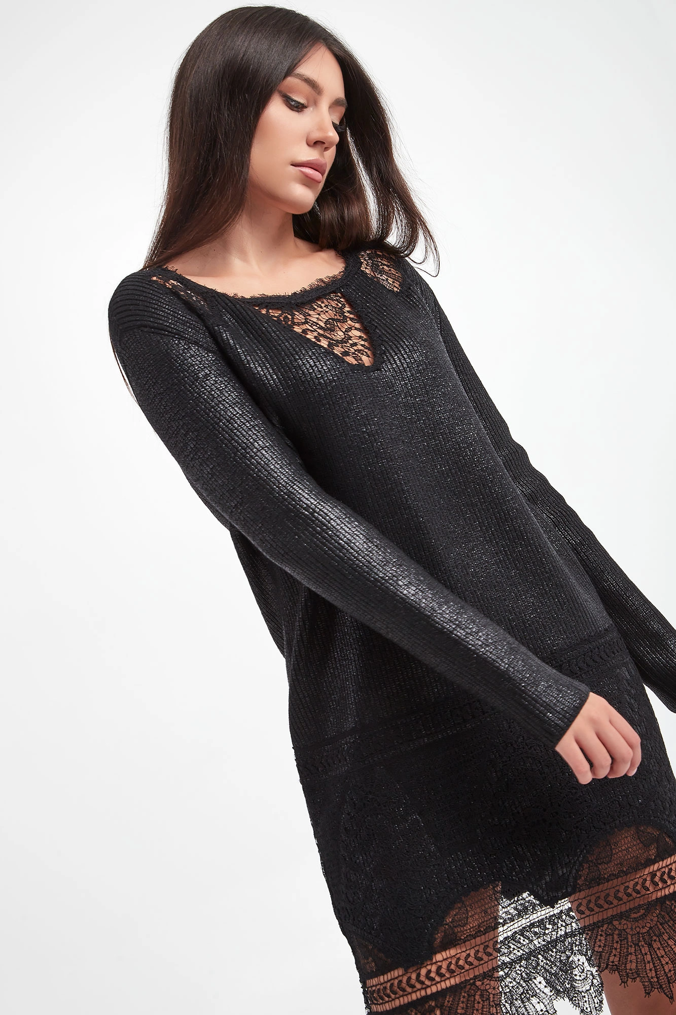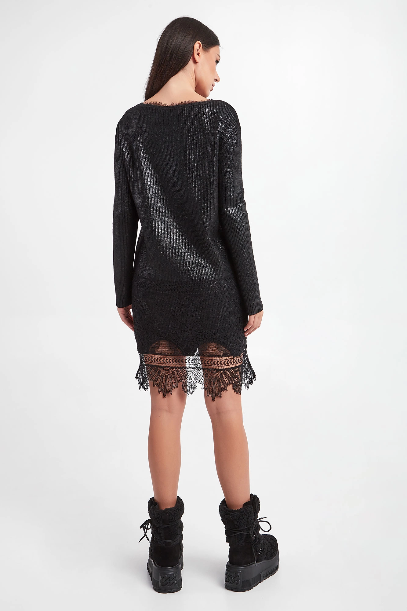 Sukienka marki Ermanno Firenze w czarnym kolorze. Całość wykończona metalizowaną nicią. Dekolt i dół wykończone ozdobną koronką. Fason relaxed o długości mini. Obniżona linia ramion. Długie rękawy. Dekolt typu o-neck.