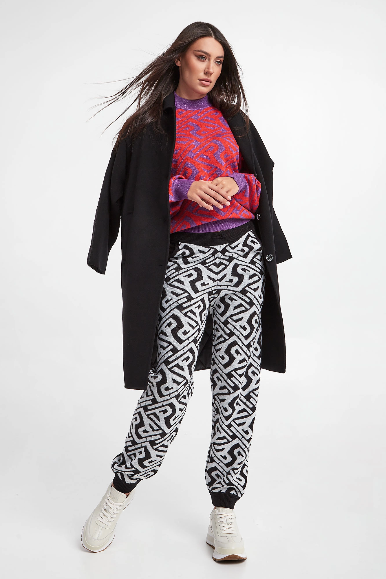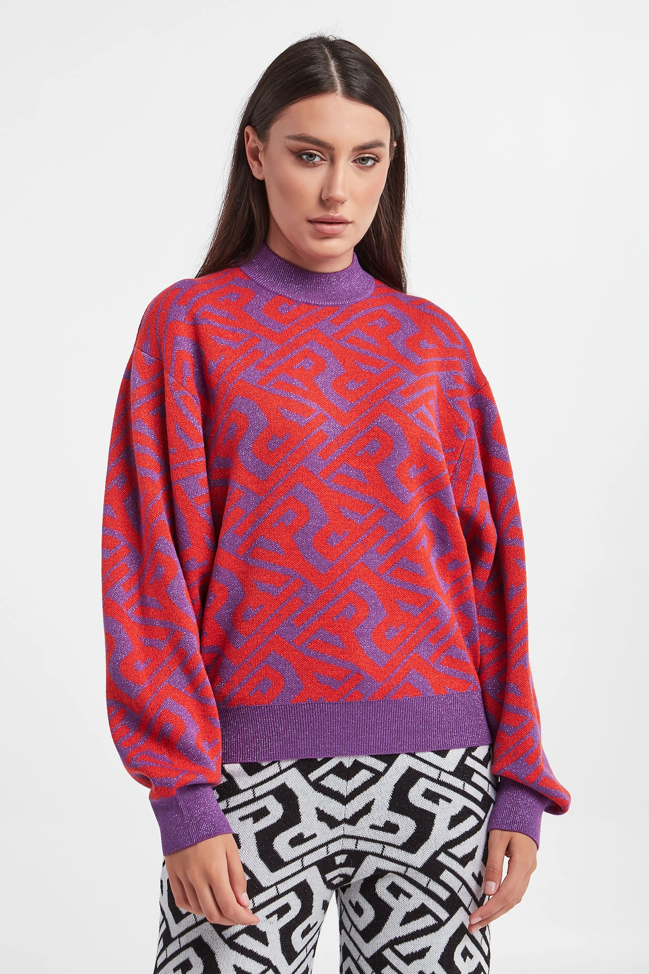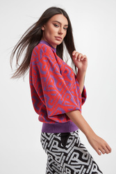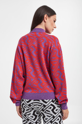 Sweter marki Ice Play w czerwono-fioletowym kolorze. Na całości wzór z monogramem marki. Przeszyty połyskującą nicią. Dekolt ze stójką, długie rękawy i dół wykończone ściągaczami. Obniżona linia ramion. Fason typu relaxed. Wykonany z mieszanki tkanin z dodatkiem wełny.
