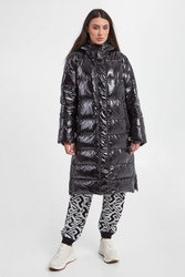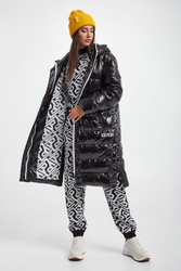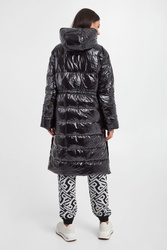 Pikowany płaszcz z kapturem marki Ice Play w czarnym kolorze. Zapinany za pomocą dwukierunkowego zamka w białym kolorze oraz nap. Dwie boczne, zamykane kieszenie. Z przodu nadruk z nazwą marki w białym kolorze. Kaptur regulowany za pomocą sygnowanych troczków ze stoperem. Zapinany po boku na napy. Wyściółka z biało-czarnym nadrukiem z nazwą marki. Fason typu relaxed. Wypełnienie wykonane z naturalnego puchu oraz pierza.