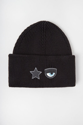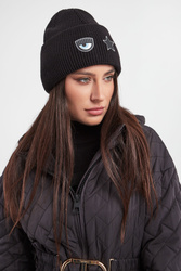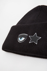 Wełniana czapka marki Chiara Ferragni w czarnym kolorze. Na całości prążki. Zakończona szerokim wywinięciem z aplikacją w postaci oka i gwiazdki - symboli charakterystycznych dla marki. Idealna propozycja na zimniejsze dni.