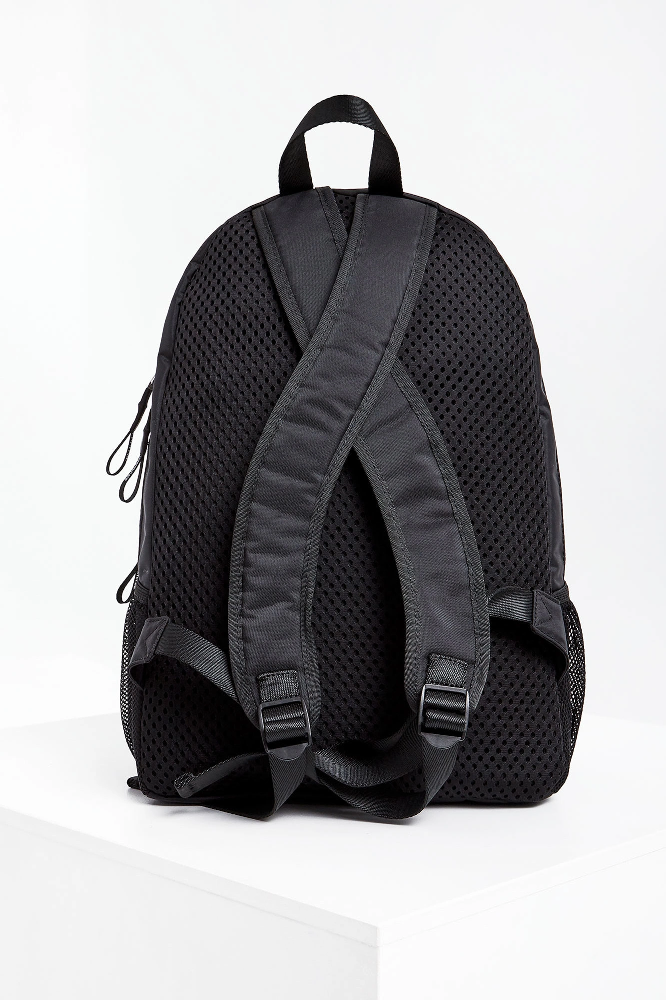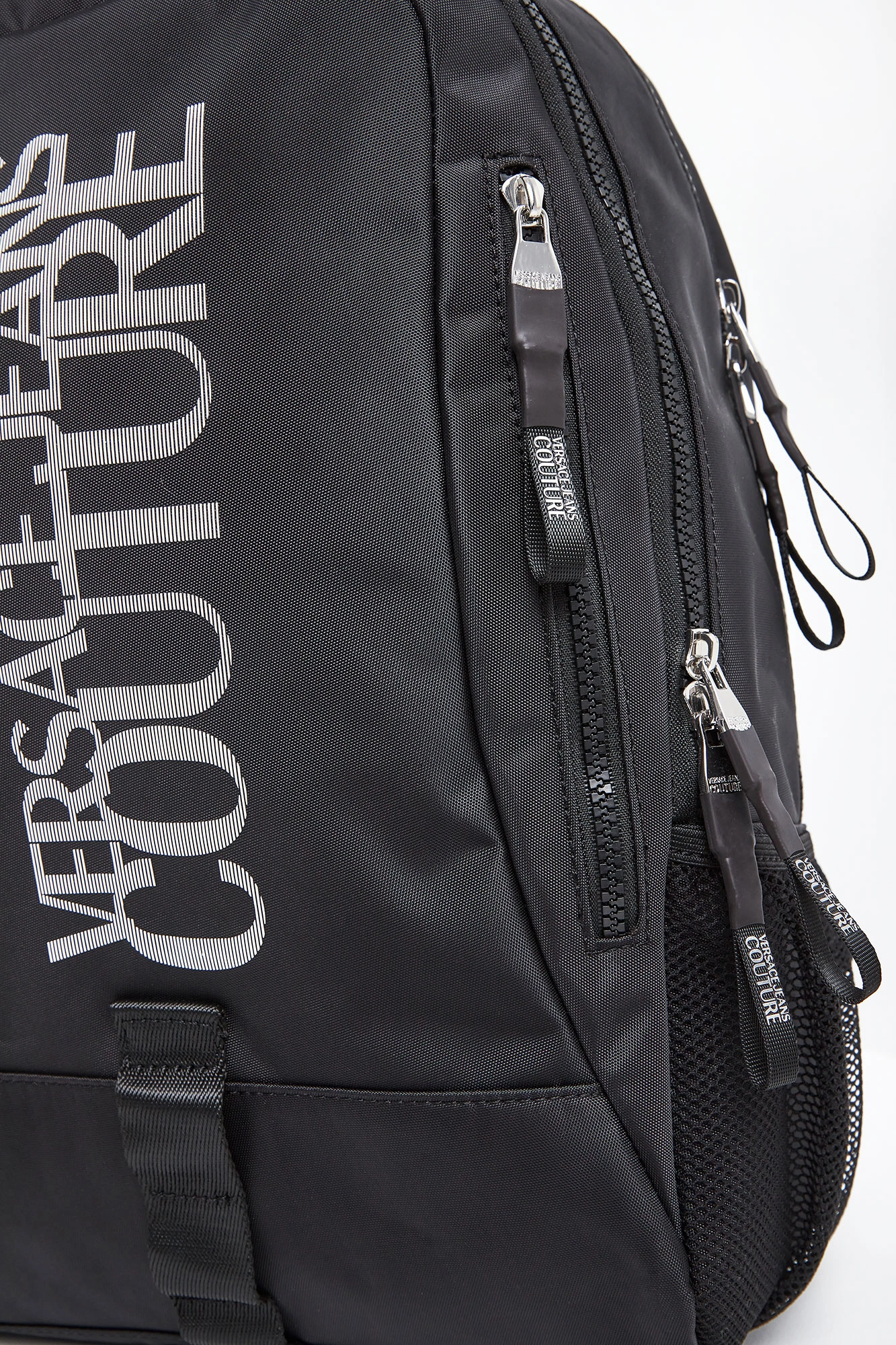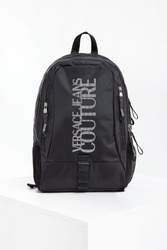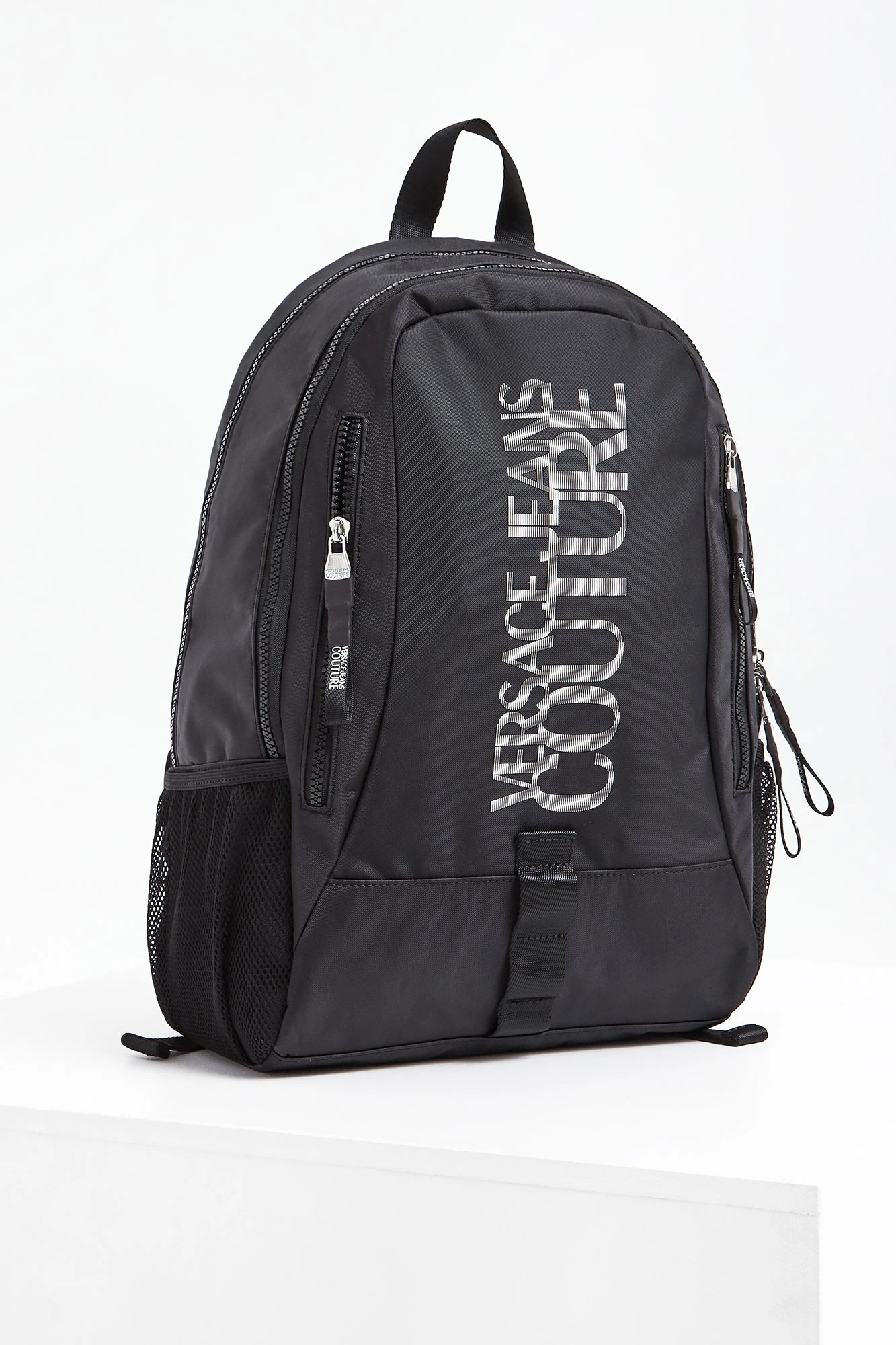 Plecak marki Versace Jeans Couture w czarnym kolorze. Dwukomorowy. Na całości biały nadruk z nazwą marki. Zapinana za pomocą zamka z sygnowanym suwakiem. Do noszenia na materiałowych, regulowanych szelkach. Z przodu gumowany nadruk i dwie dodatkowe kieszenie. Z niewielkim uchwytem. Wewnątrz dodatkowa kieszeń i sygnowana wyściółka.