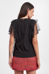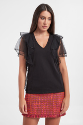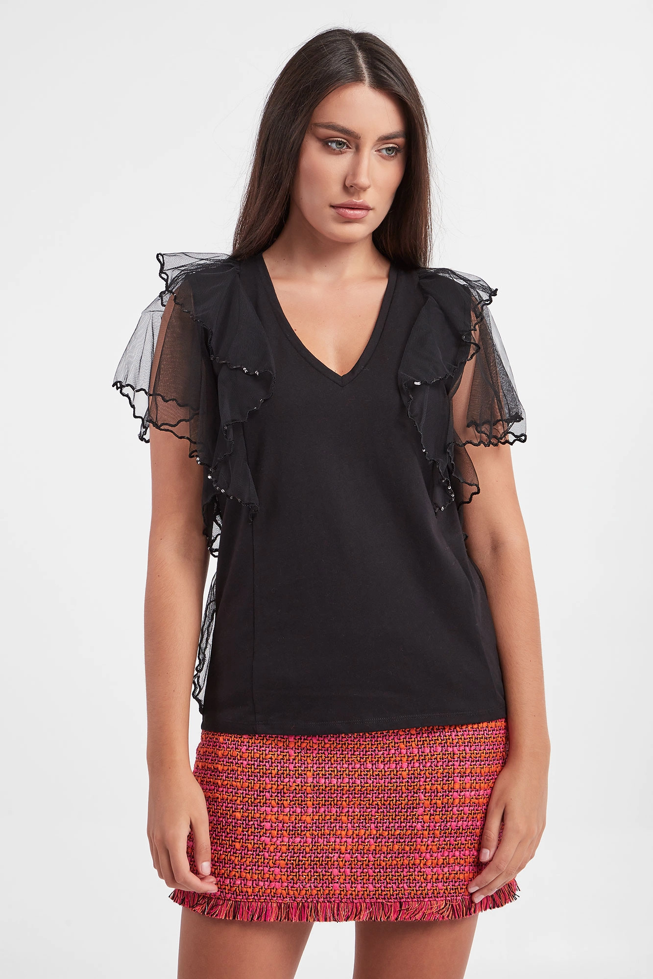 Top marki Twinset w czarnym kolorze. Dekolt typu v-neck zakończony wąskim ściągaczem. Ramiona ozdobione warstwami tiulu zakończonymi niewielkimi, połyskującymi cekinami. U dołu lamówka. Na linii karku złota zawieszka z logo. Fason typu regular. Wykonany z bawełnianej tkaniny z dodatkiem elastanu.