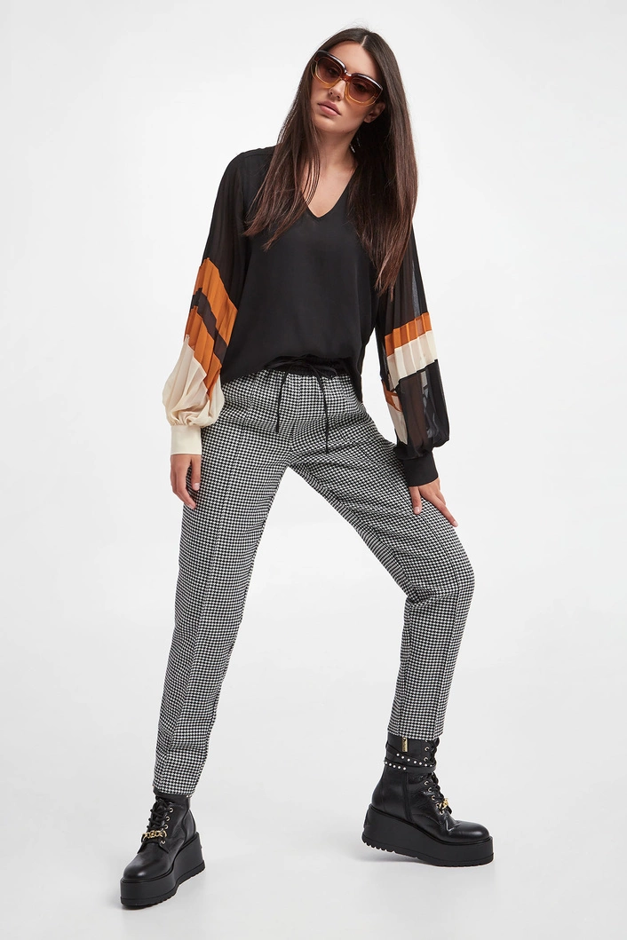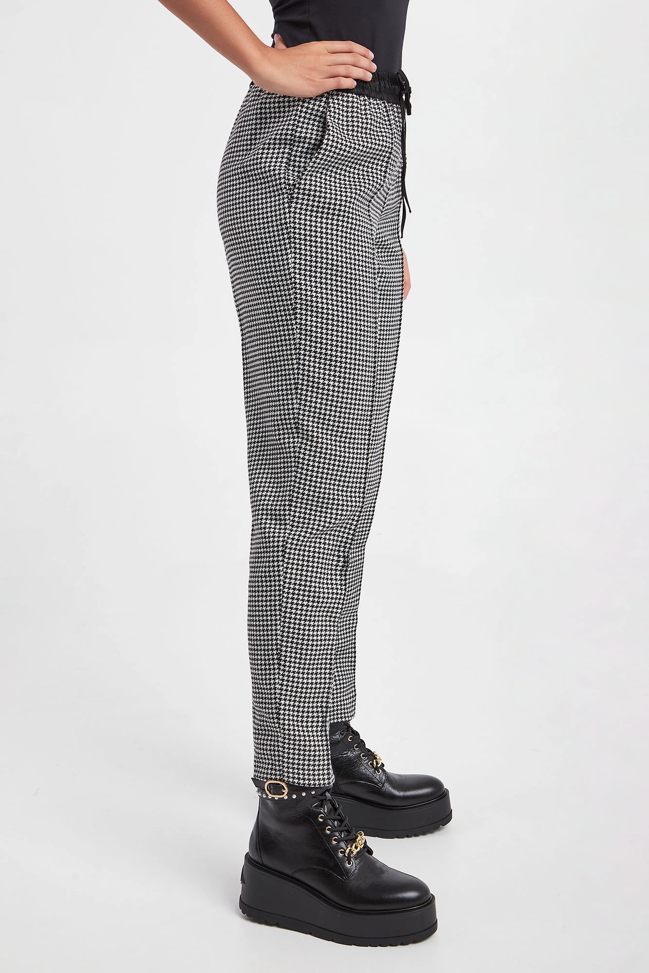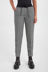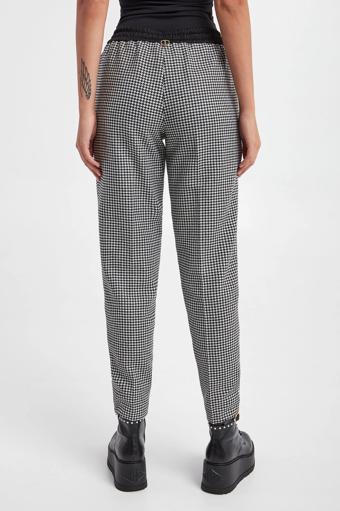 Wełniane spodnie marki Twinset w czarno-białą pepitkę. O kroju cygaretek. W pasie czarny ściągacz regulowany za pomocą troczków. Dwie boczne, wpuszczane kieszenie. Na nogawkach kant. Z tyłu złota zawieszka z logo. Połączenie klasyki z wygodą.