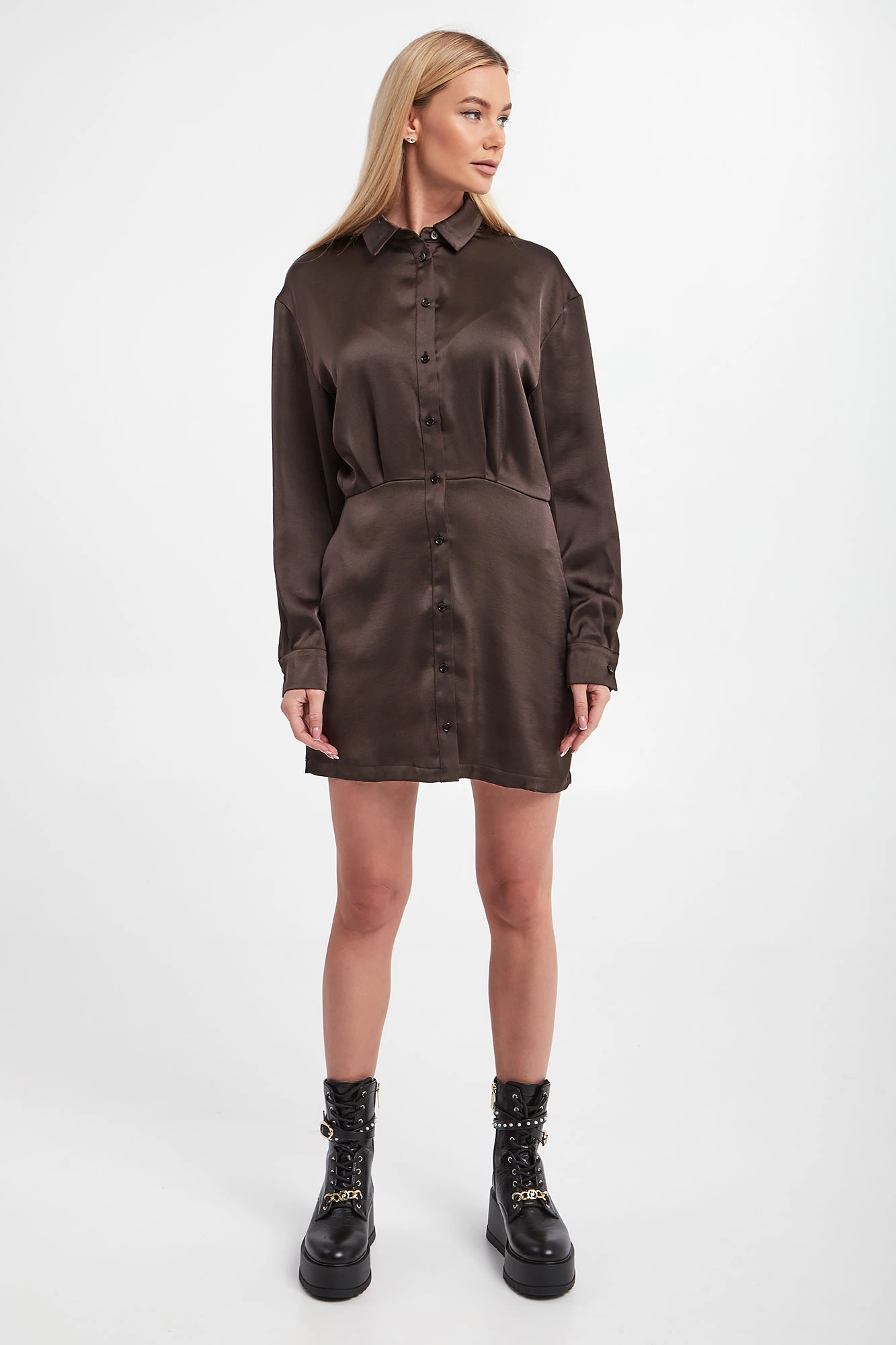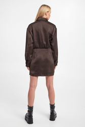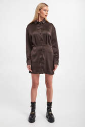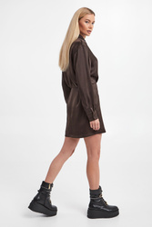Koszulowa sukienka marki Samsøe Samsøe w ciemnobrązowym kolorze. Zapinana na guziki, z klasycznym kołnierzykiem. Długie rękawy zakończone mankietami. Sukienka o prostym kroju z przeszyciem i delikatnym zwężeniem w talii. Sukienka wykonana jest z materiałów pochodzących z recyklingu. Fason typu regular, długość mini.