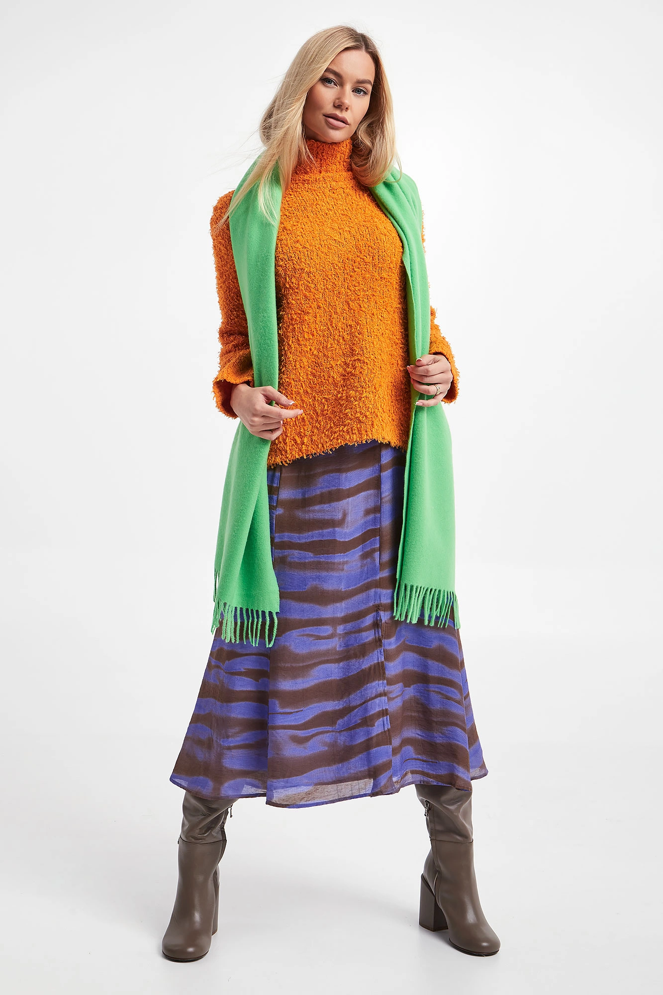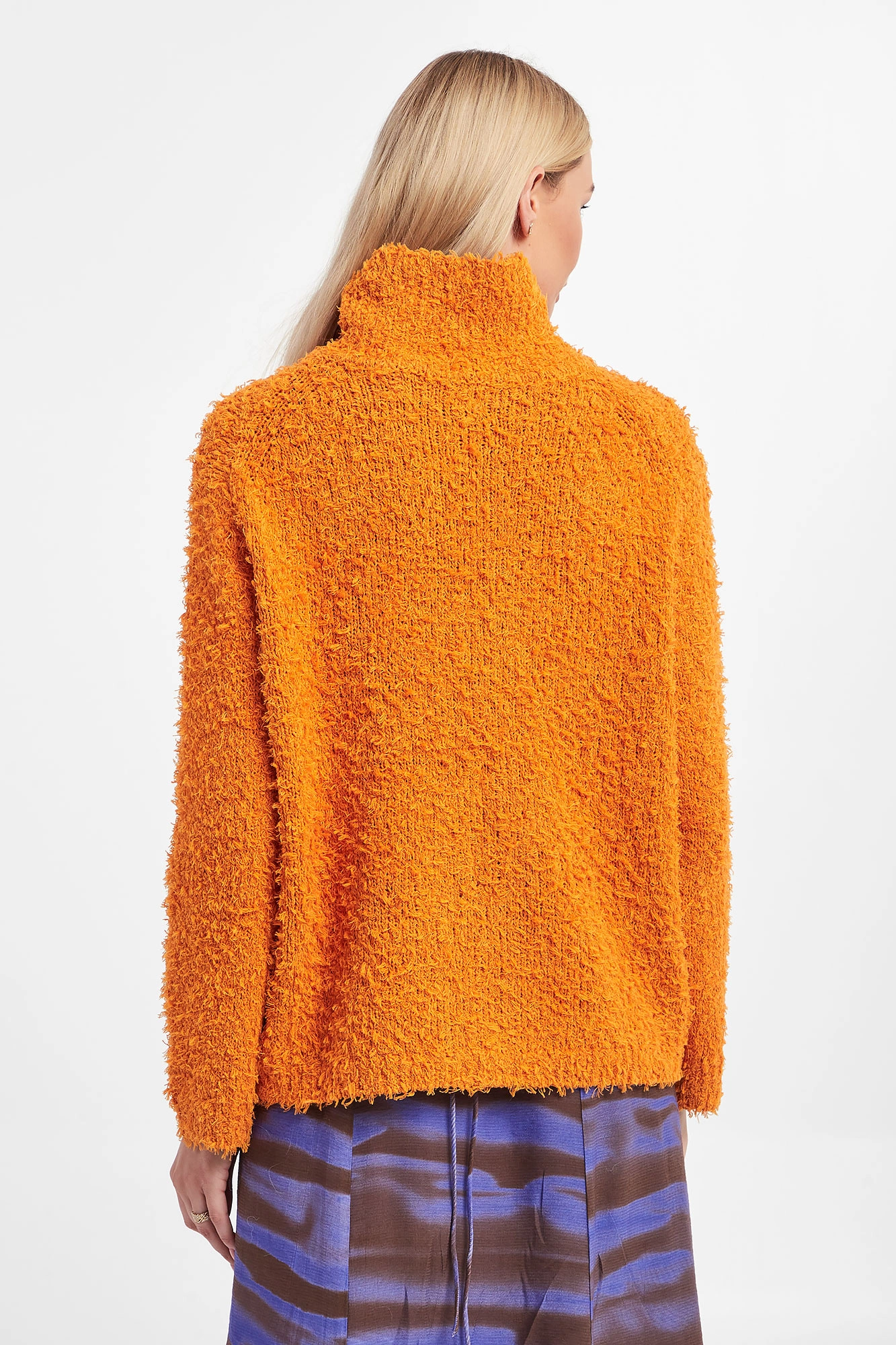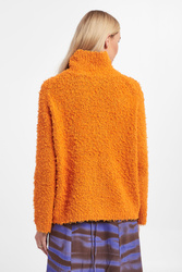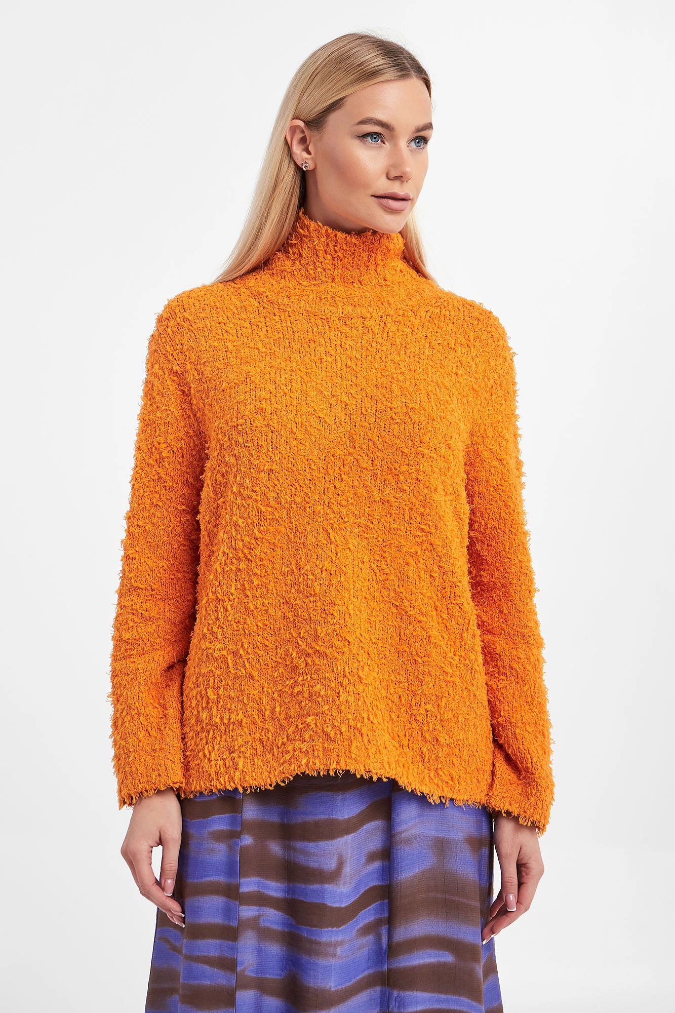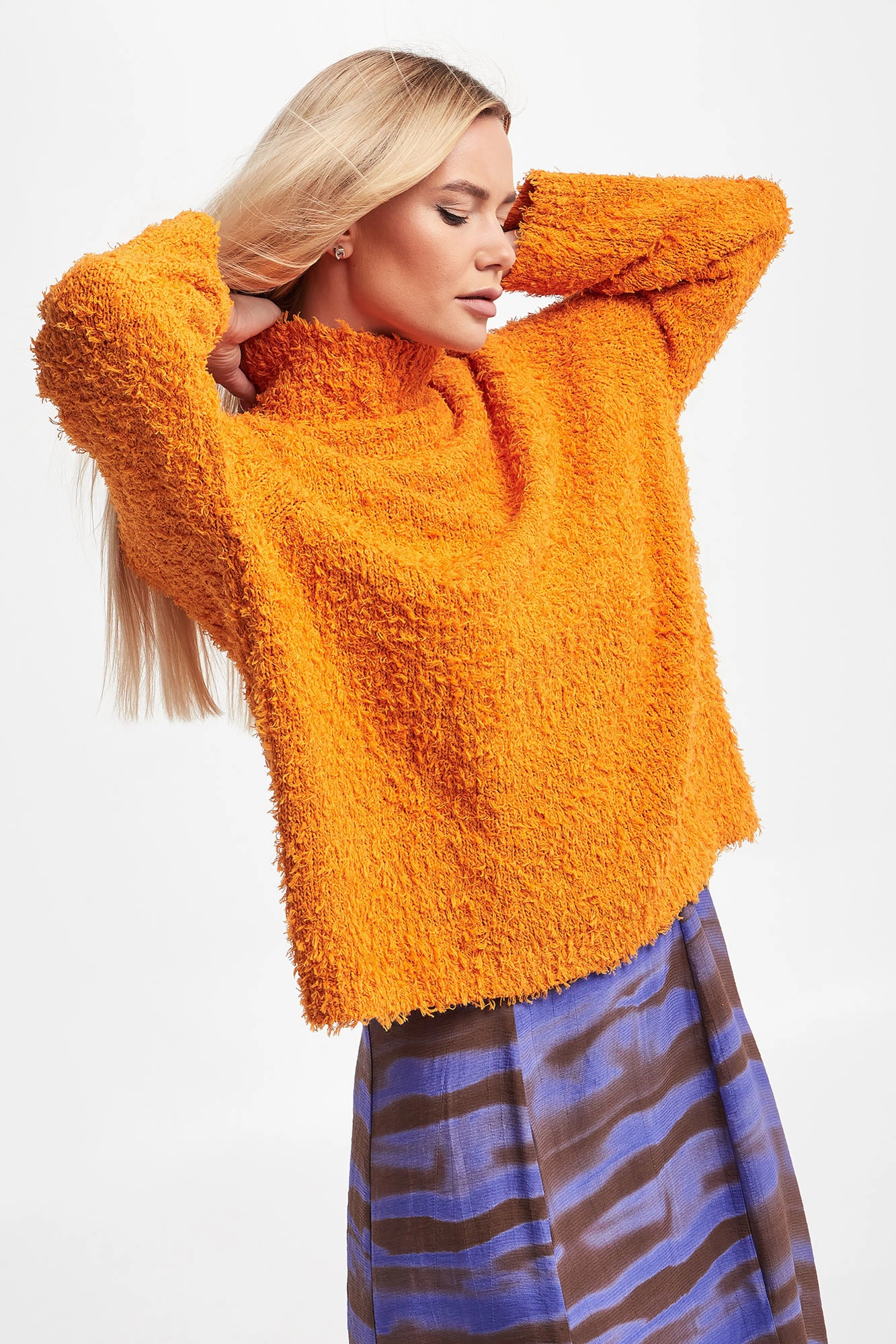 Bawełniany golf marki Samsøe Samsøe w pomarańczowym kolorze. Na całości prosty splot. Ciekawe wykończenie z nieregularnie rozmieszczonymi, wystającymi nitkami. Golf, dół i długie rękawy zakończone ściągaczem. Fason typu relaxed.
