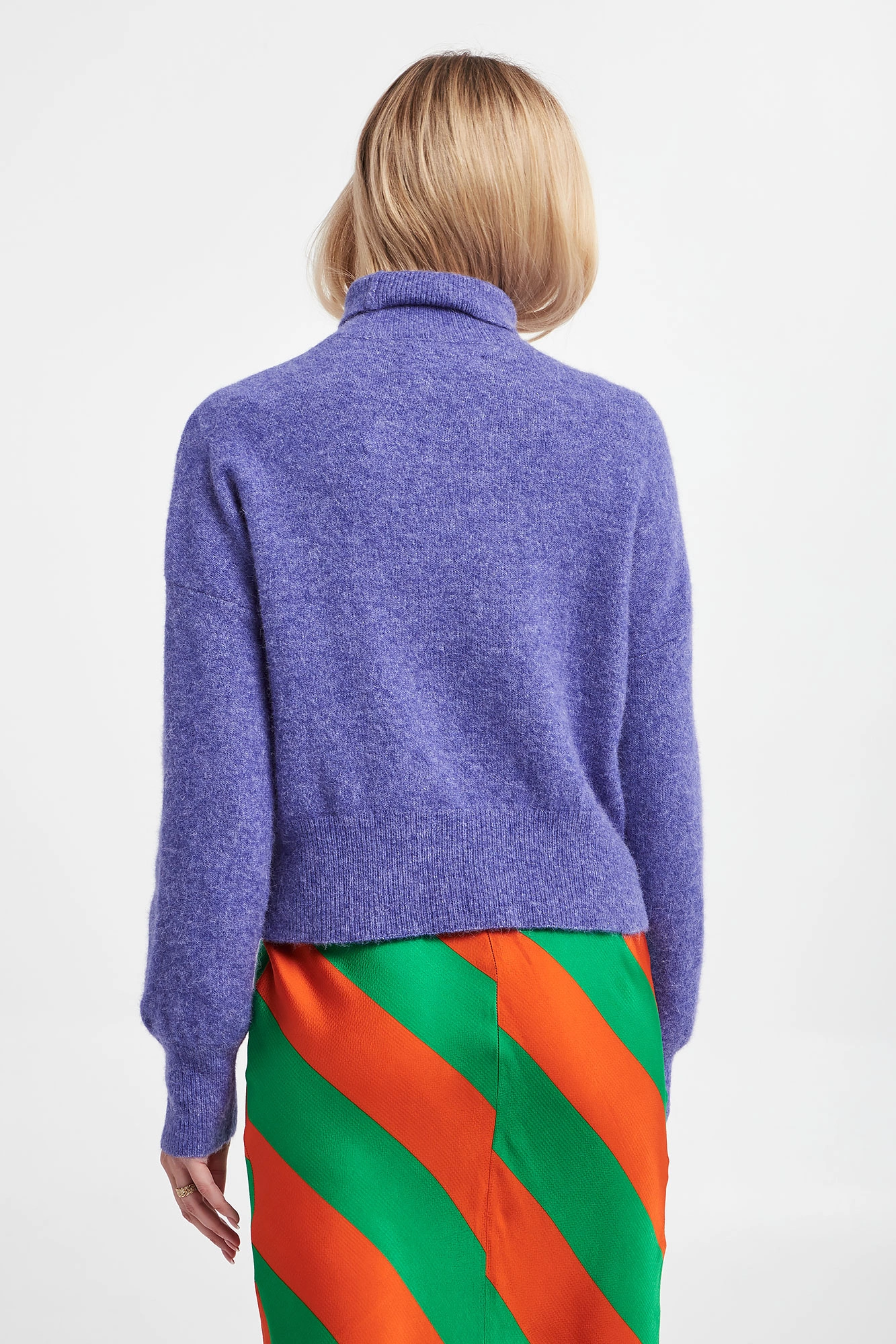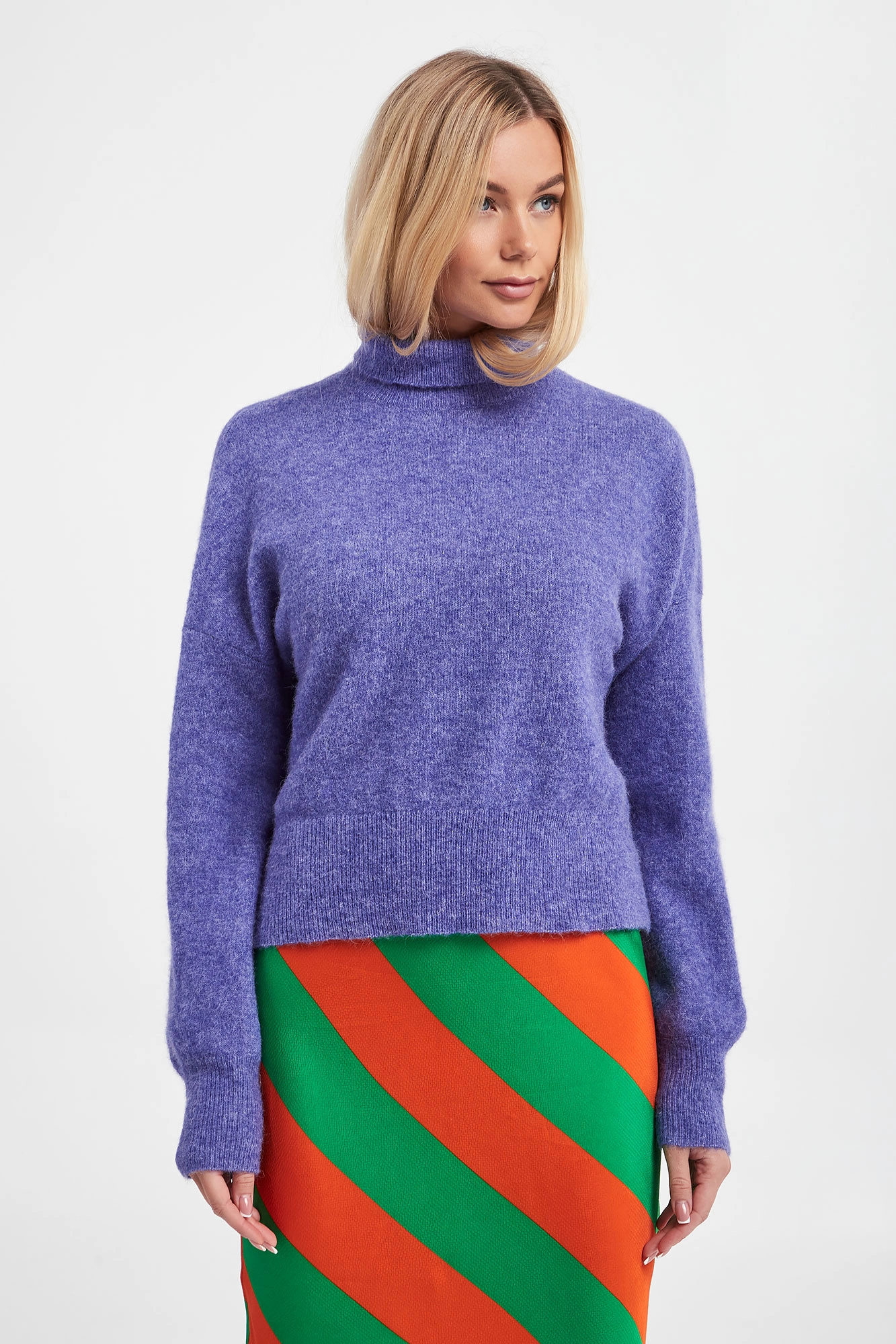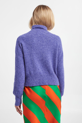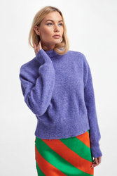 Golf marki Samsøe Samsøe w kolorze fioletowym. Obniżona linia ramion. Golf, długie rękawy i dół wykończone szerokim ściągaczem prążkowanym. W składzie niezwykle ciepłe włókna alpaki i wełny. Fason typu relaxed, o krótszym kroju. Idealna propozycja na chłodniejsze dni.