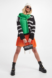 Sweter z alpaki marki Samsøe Samsøe w czarnym kolorze. Na całości paski w kontrastowym kolorze. Obniżona linia ramion. Dekolt o-neck, długie rękawy i dół wykończone ściągaczem prążkowanym. Fason typu oversize.