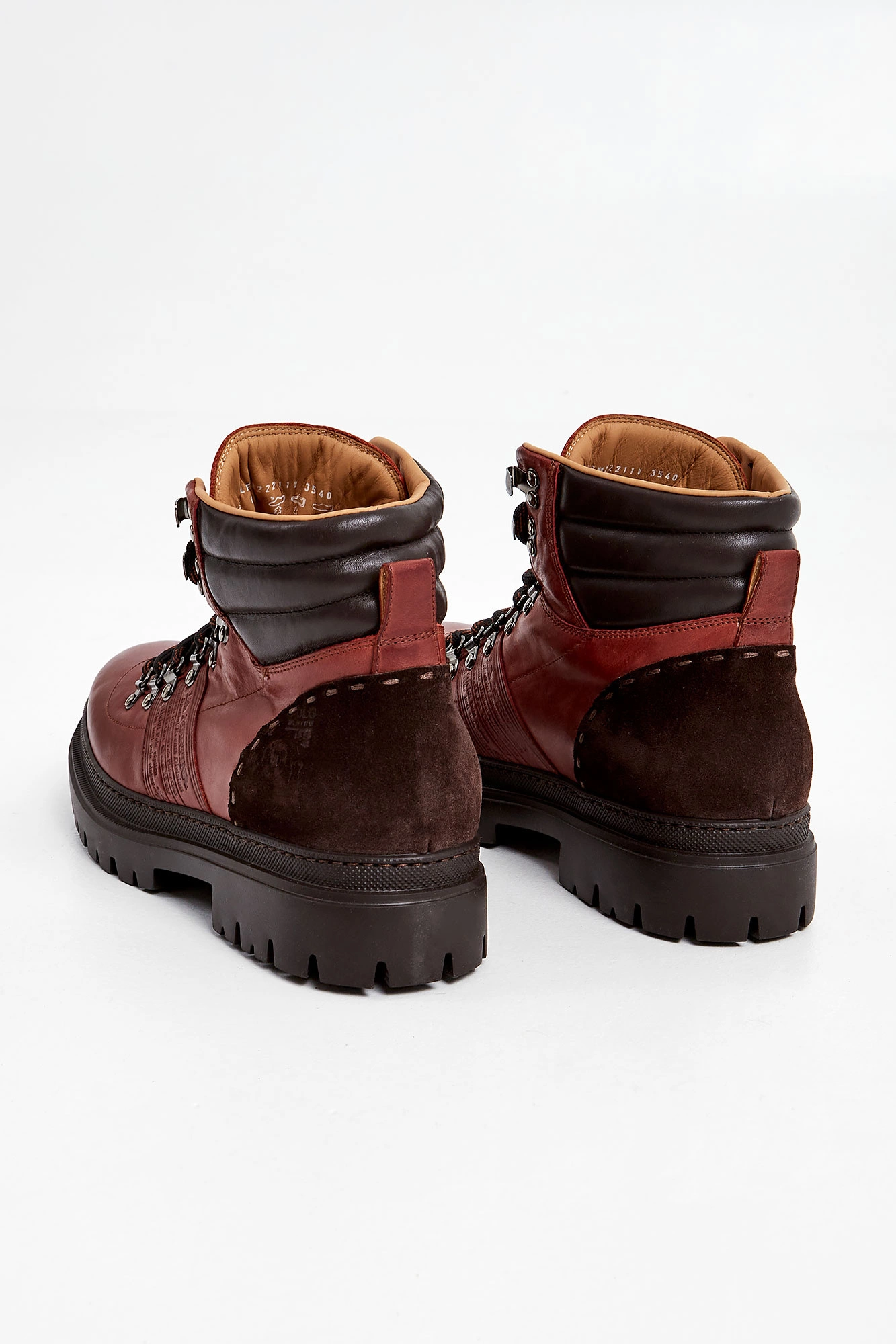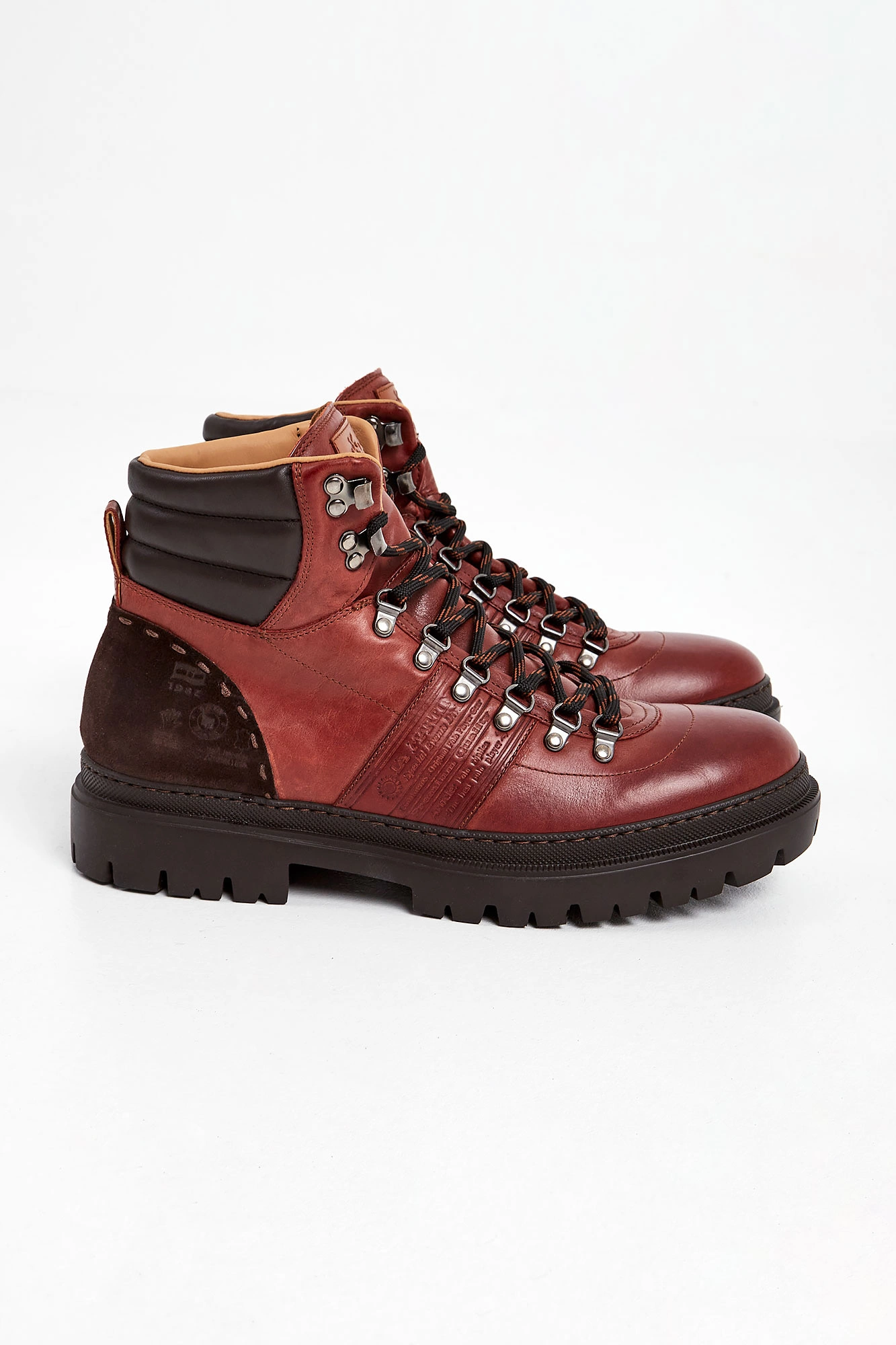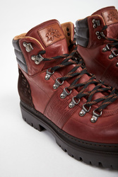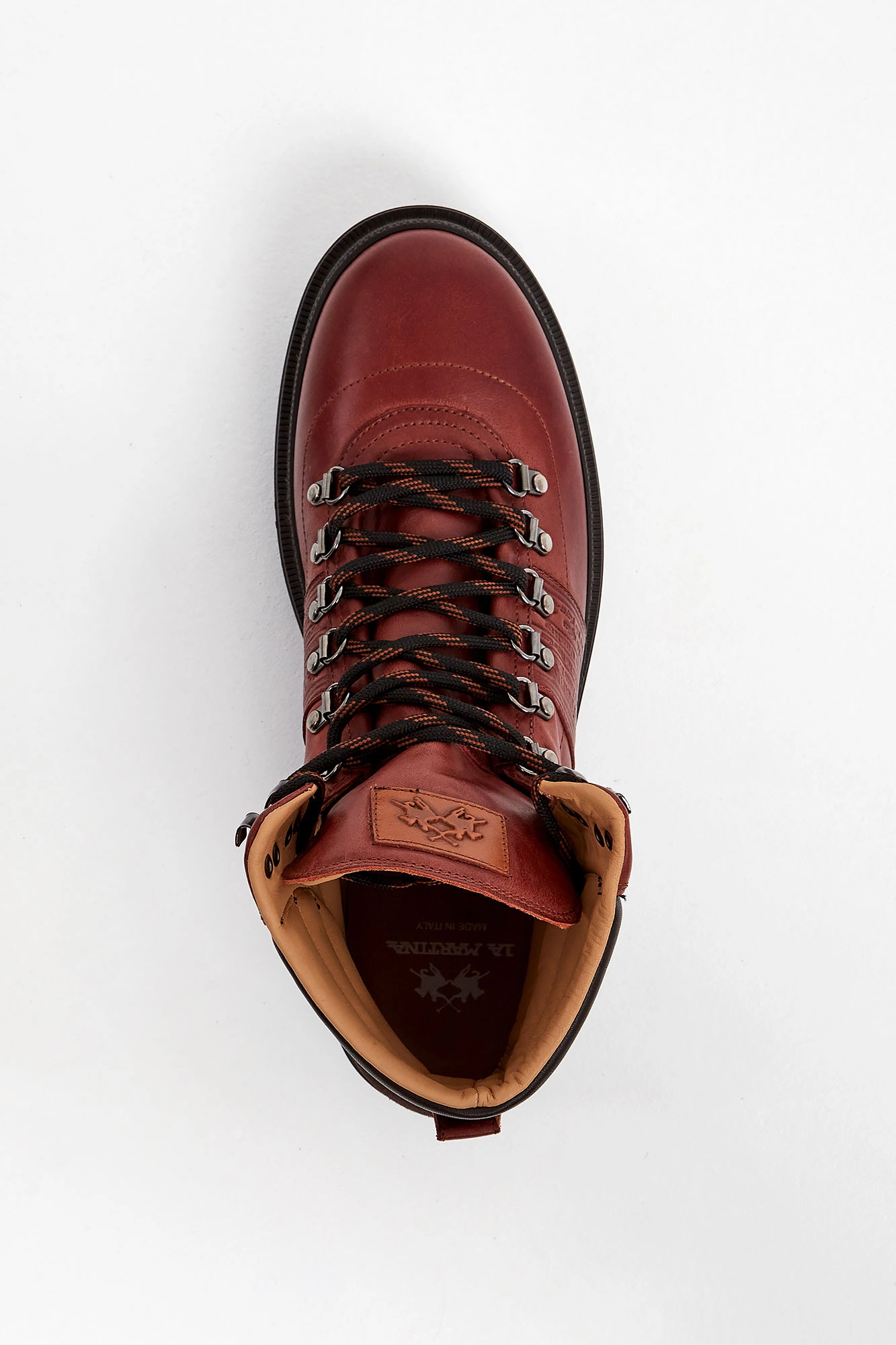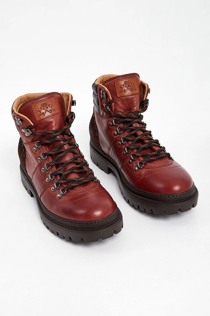 Skórzane trapery marki La Martina w brązowym kolorze. Sznurowane. Okrągły nosek. Tył pikowany. Na pięcie zamszowa wstawka. Po bokach pasy z tłoczonymi napisami. Język z tłoczonymi logo marki. Podeszwa profilowana, ciemnobrązowa.