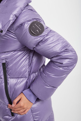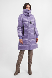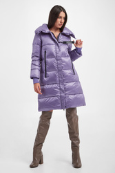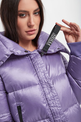 Puchowy płaszcz ze stójką marki Gianfranco Ferre w liliowym kolorze. Na całości poziome pikowania. Zapinana na podwójny zamek z odpinaną zawieszką oraz na napy. Na froncie dwie kieszenie podwójne, zapinane na zamek oraz ocieplane. Rękawy wykończone wywijanymi mankietami sztormowymi, które zapobiegają dostaniu się do środka zimnego powietrza. Na rękawie naszywka z logo. Fason typu relaxed.