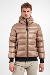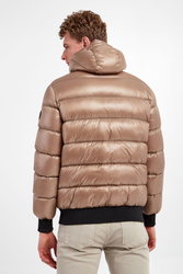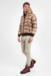 Pikowana kurtka puchowa marki Gianfranco Ferre w beżowym kolorze. Zapinana na dwukierunkowy zamek z sygnowaną, odpinaną zawieszką. Na lewym ramieniu okrągła plakietka z logo marki. Dwie ocieplane kieszenie na froncie i dodatkowo kieszonki wewnętrzne. Przy kapturze ściągacz ze stoperami. Rękawy i dół zakończone elastycznym ściągaczem. Fason typu regular.
