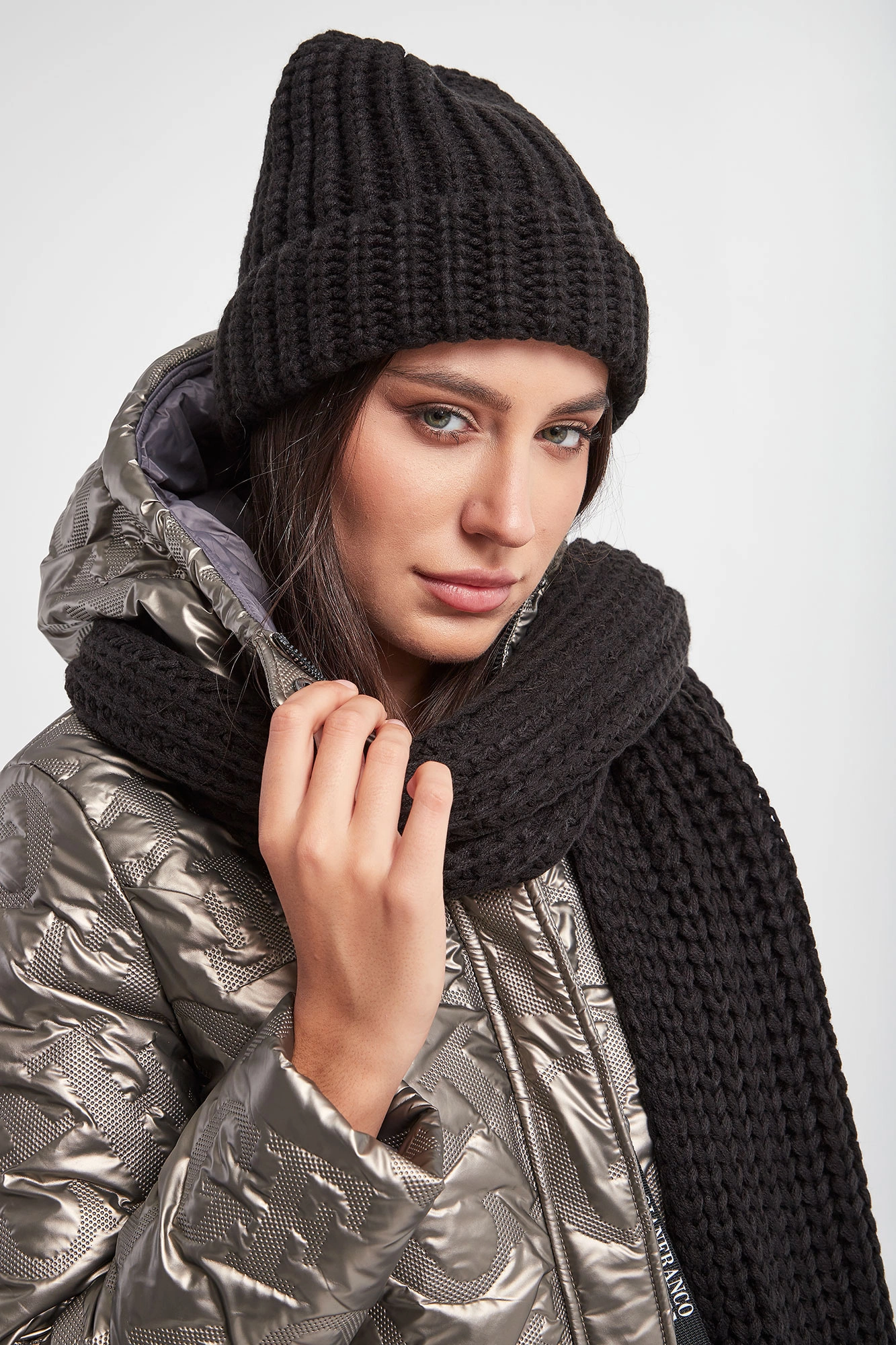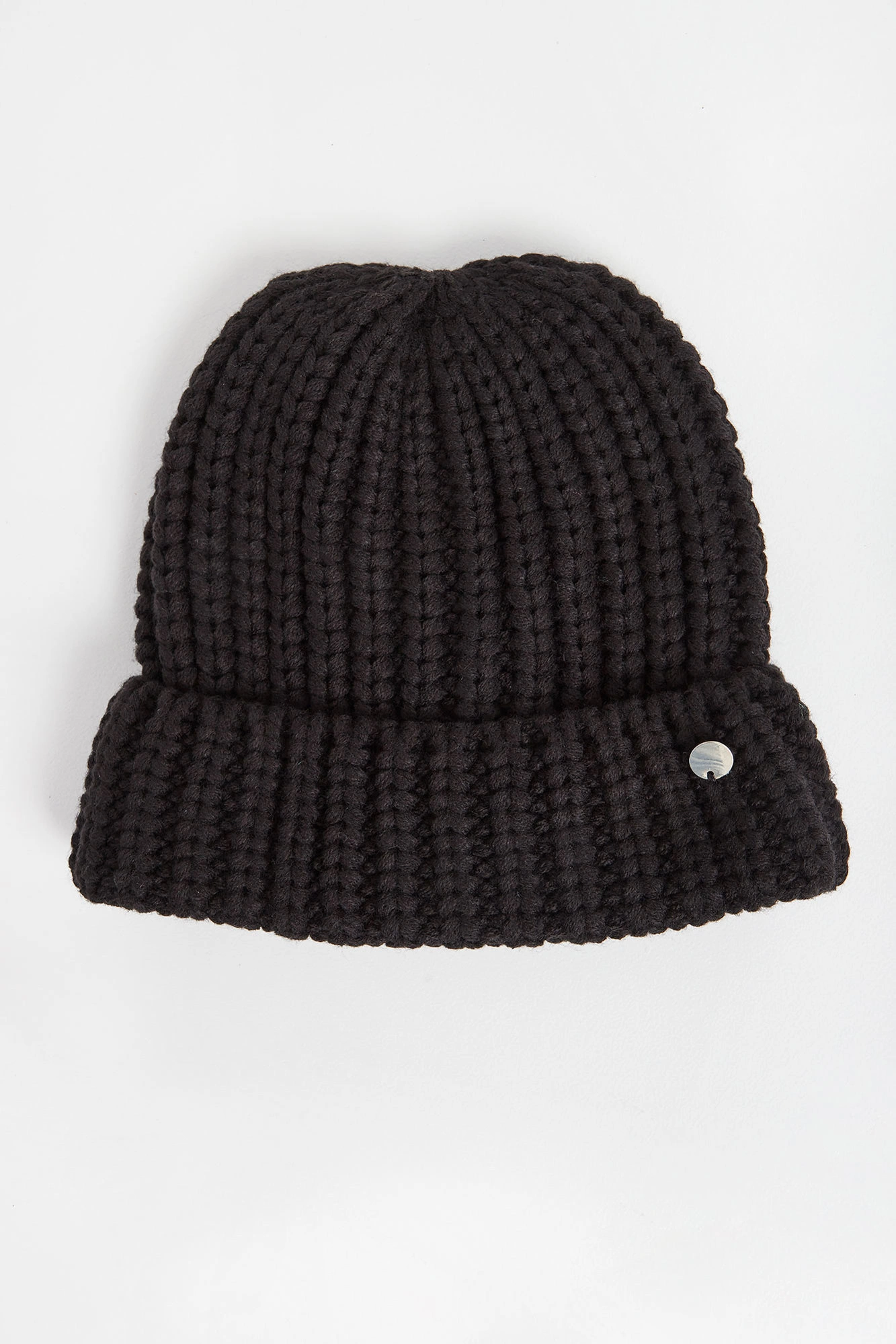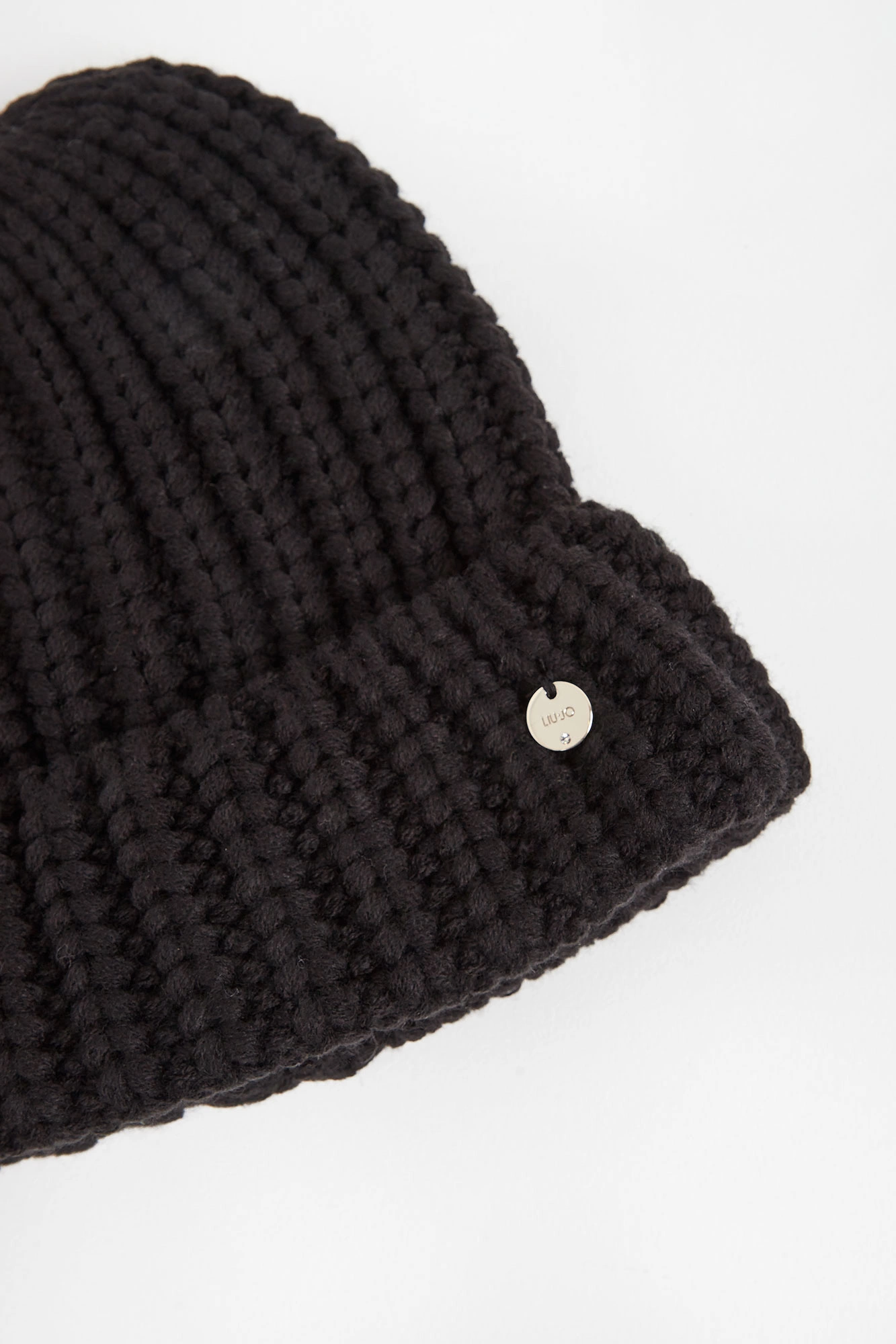 Czapka Liu Jo w czarnym kolorze. Na całości warkoczowy splot. Zakończona podwinięciem. Na nim złota, sygnowana zawieszka z kryształkiem. Miękka oraz ciepła.