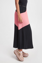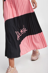 Plisowana spódnica marki Liu Jo Sport w różowo-czarnym kolorze. W pasie elastyczny, sygnowany ściągacz. Na środku napis z logo. Fason regular, o kroju litery A. Długość midi.