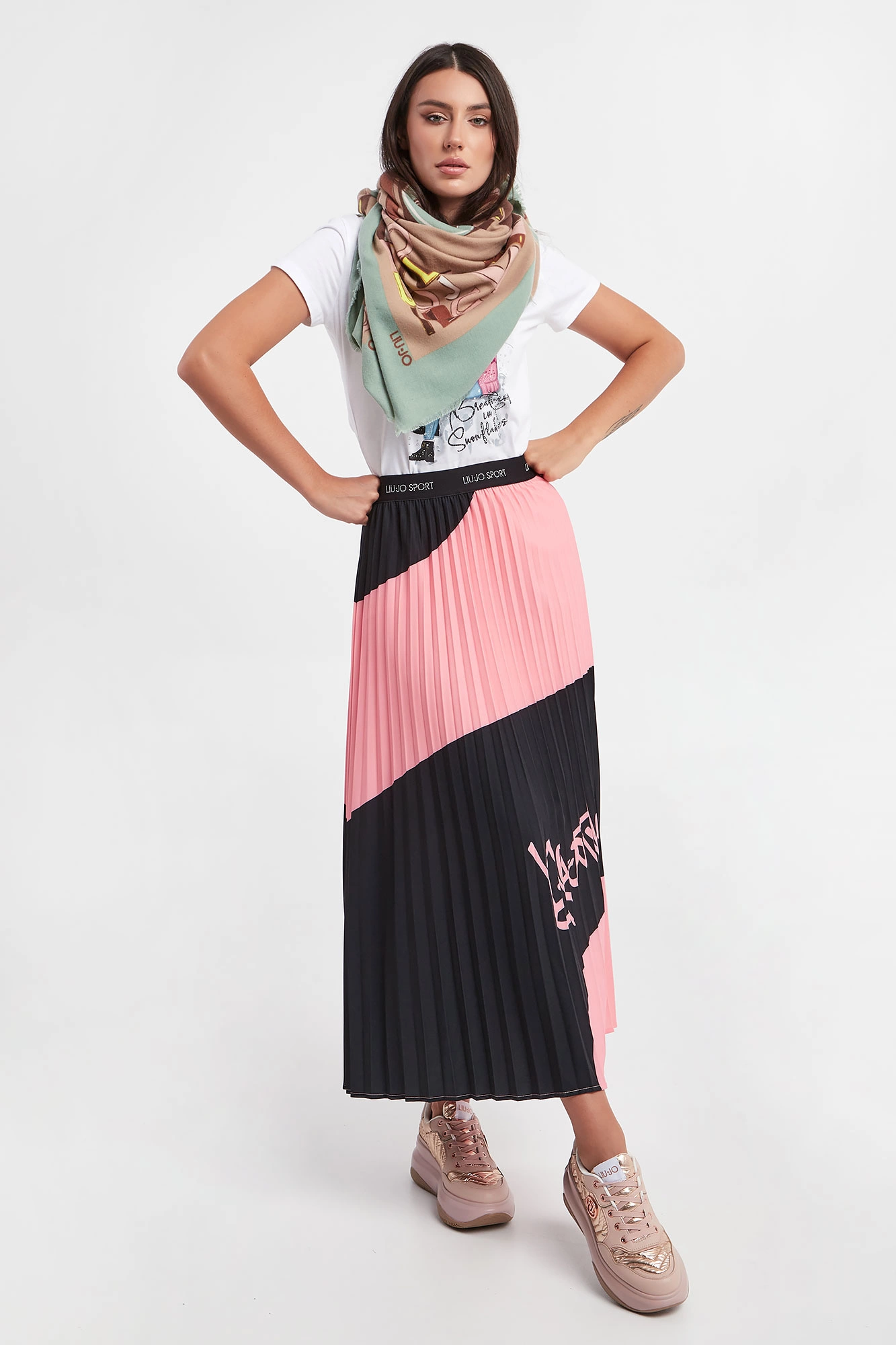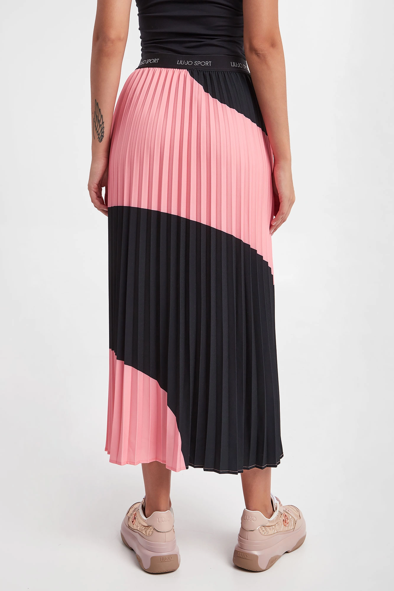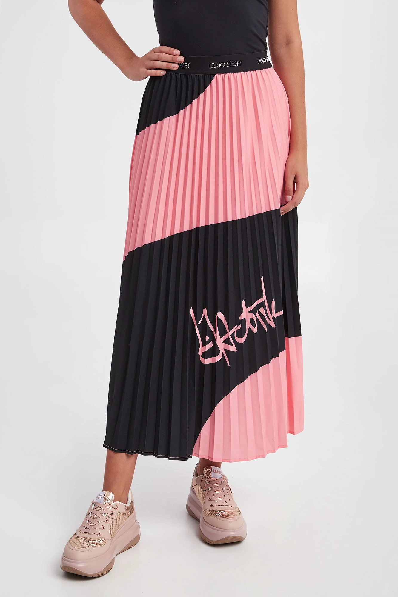 Plisowana spódnica marki Liu Jo Sport w różowo-czarnym kolorze. W pasie elastyczny, sygnowany ściągacz. Na środku napis z logo. Fason regular, o kroju litery A. Długość midi.