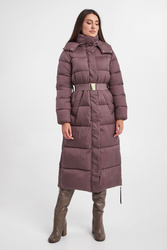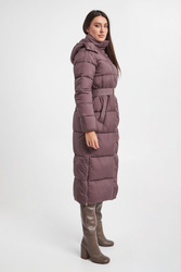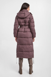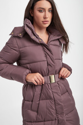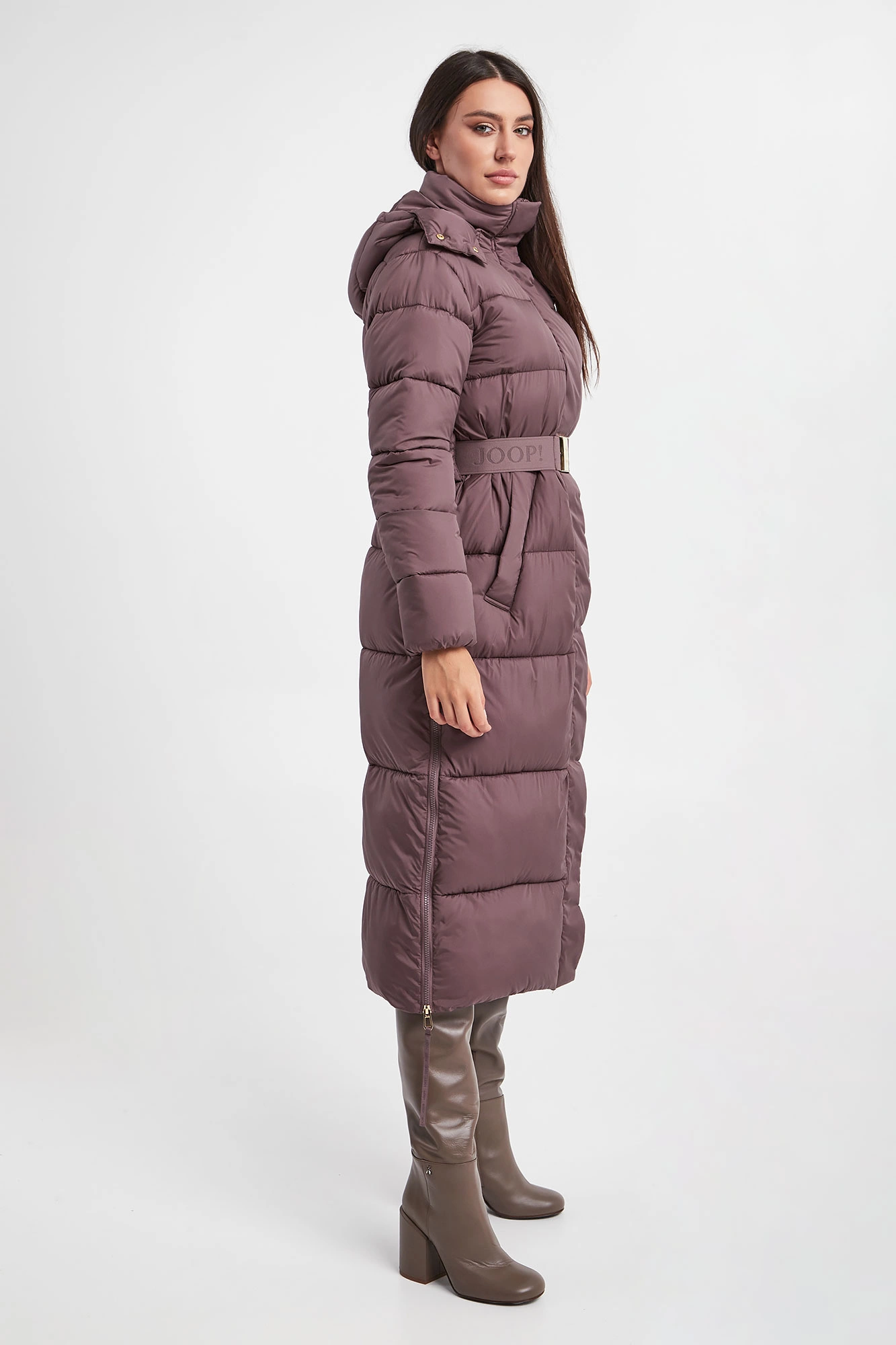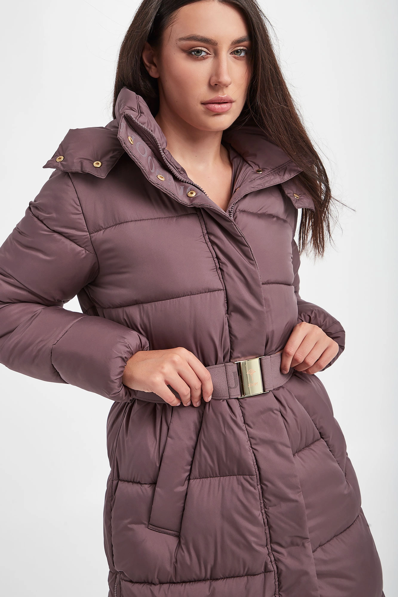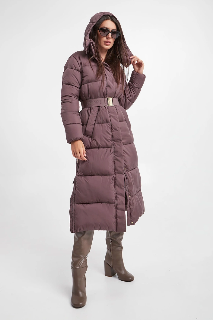 Pikowany płaszcz marki Joop! w kolorze brudnej lilii. Zapinany na sygnowany zamek i napy. Model ze stójką i odpinanym kapturem. W talii pasek z sygnowaniem i ozdobną klamrą. Po bokach rozcięcia zapinane na zamki. Na froncie dwie kieszenie. Na ramieniu naszywka z logo marki. Rękawy wykończone ściągaczem. Fason typu regular. Model z serii Joop! Sustainably Sexy, która wspiera pozyskiwanie surowców zgodnie z zasadą zrównoważonego rozwoju.