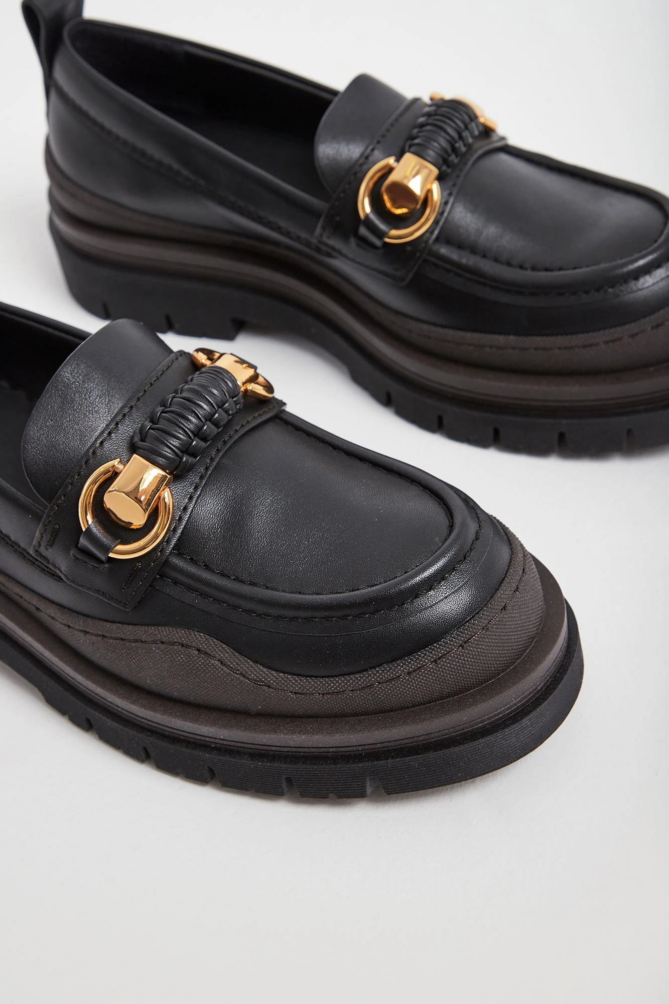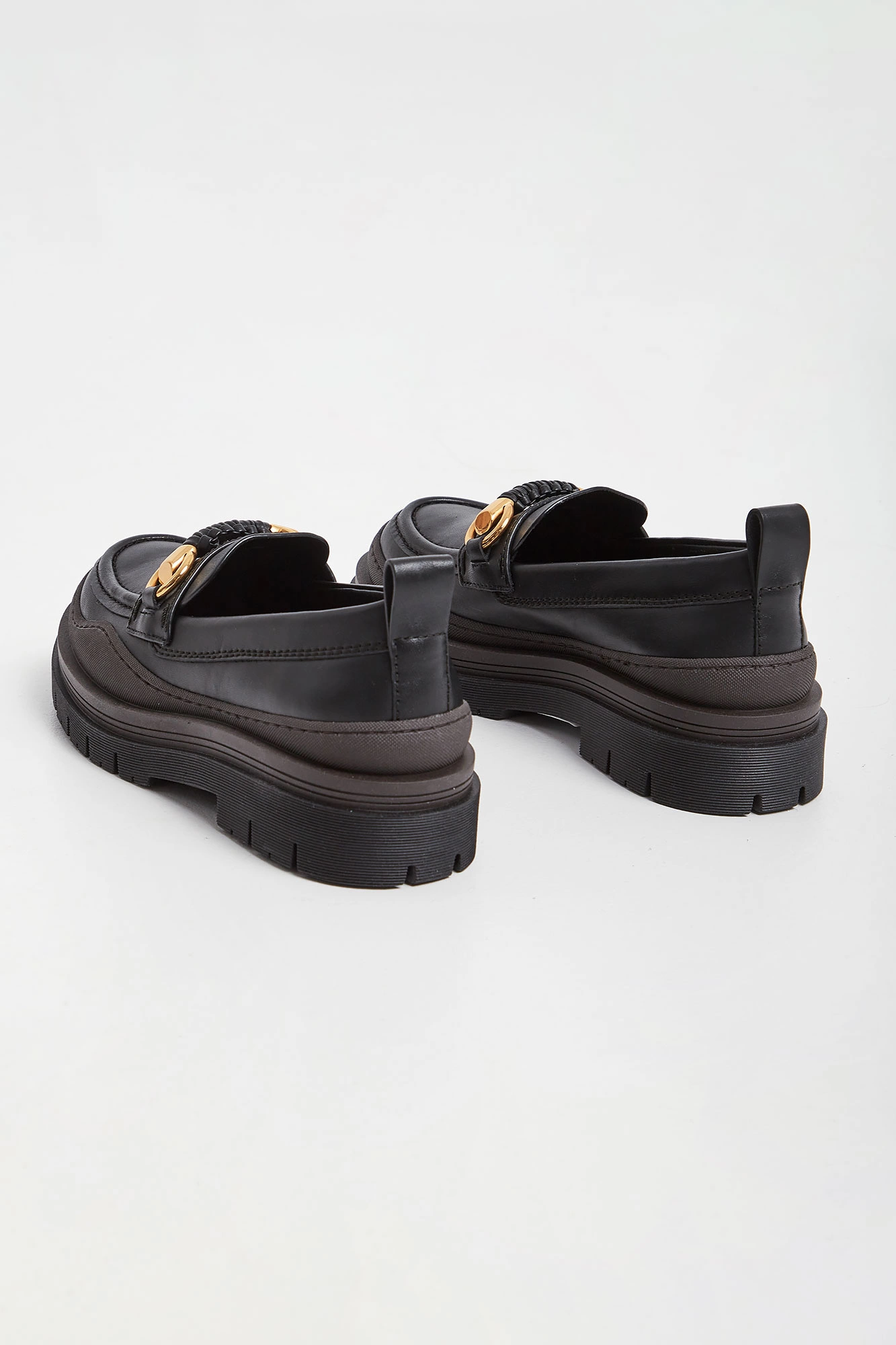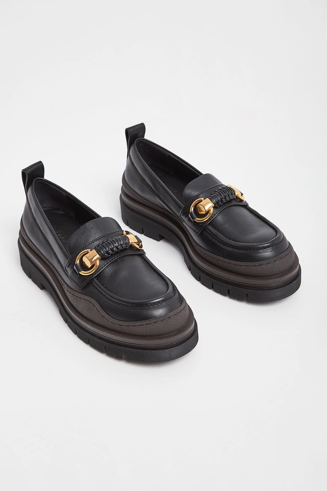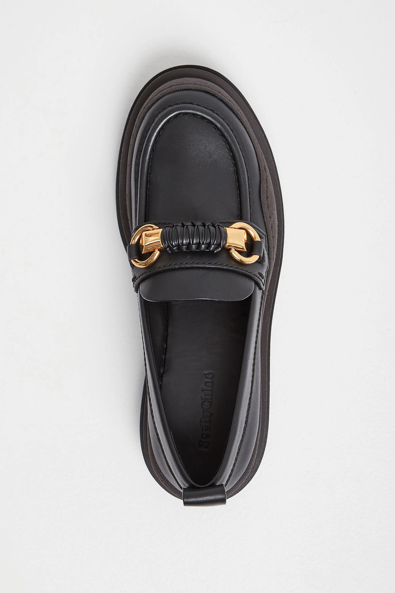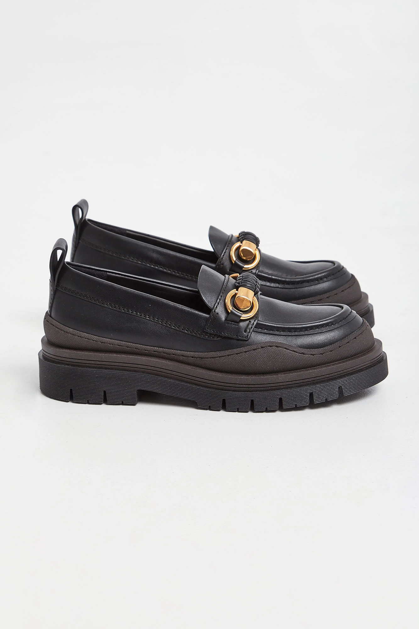 Skórzane półbuty marki See by Chloé w czarnym kolorze. Okrągły nosek. Na całości przeszycia. Na froncie ozdobny element ze złotą klamrą. U dołu materiałowe wstawki. Na wysokiej, profilowanej podeszwie. Z tyłu cholewki uchwyty ułatwiające zakładanie.