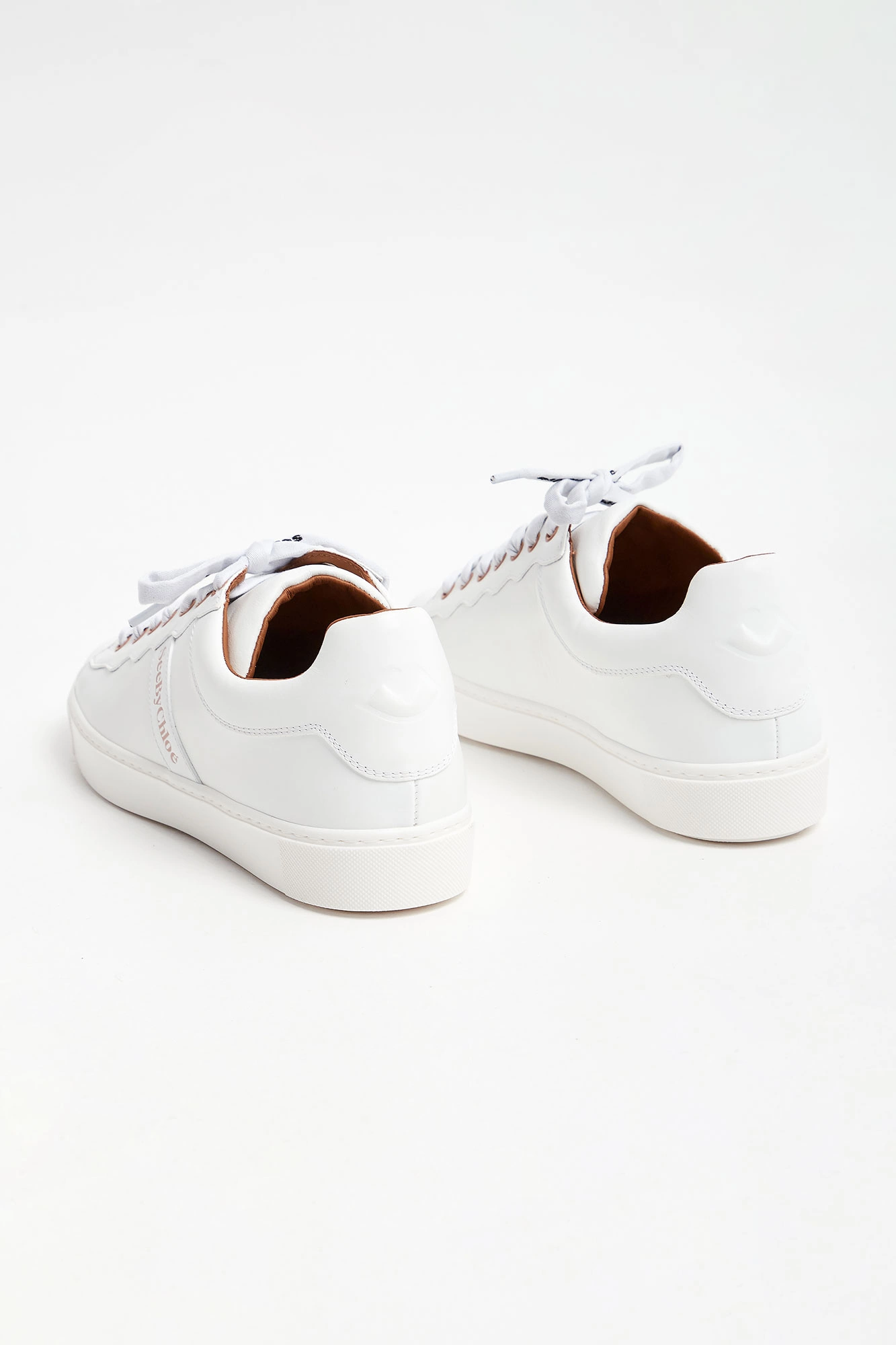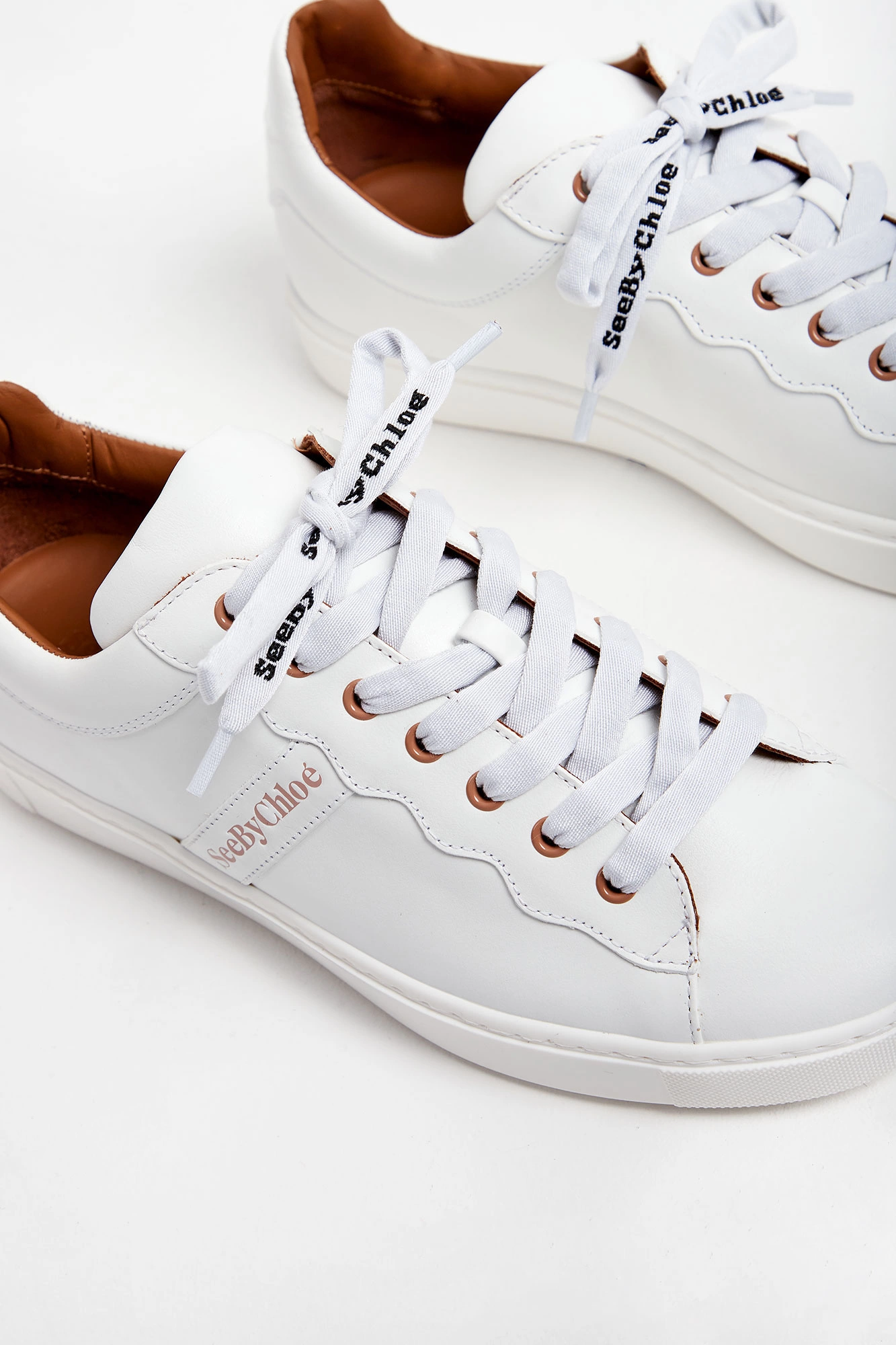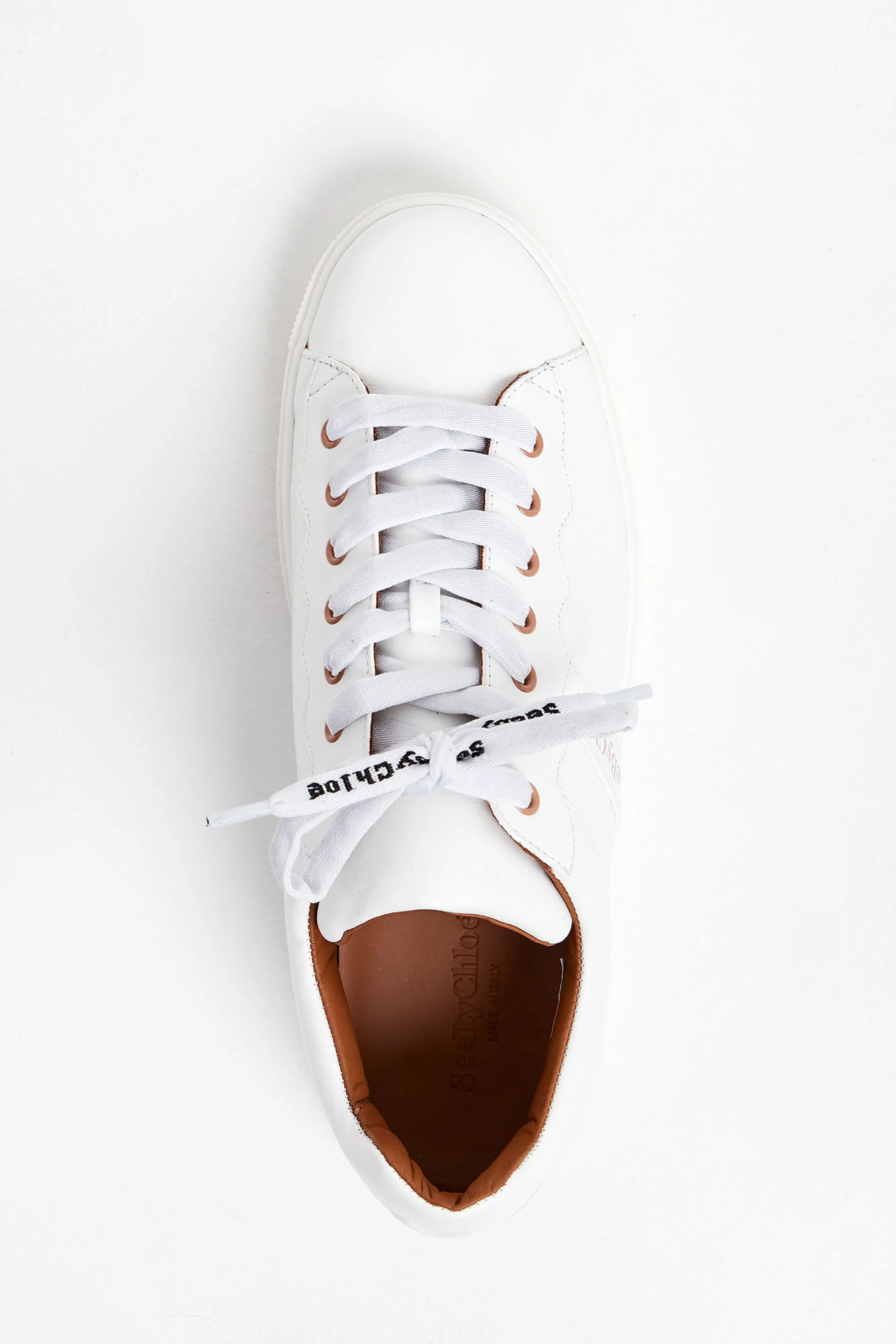 Sneakersy marki See by Chloé w kolorze białym. Wiązane za pomocą białych, sygnowanych sznurówek. Z boku beżowe logo. Zaokrąglone noski. Z tyłu ozdobne tłocznia. Wyściółka w beżowym kolorze. Wykonane ze skóry naturalnej.