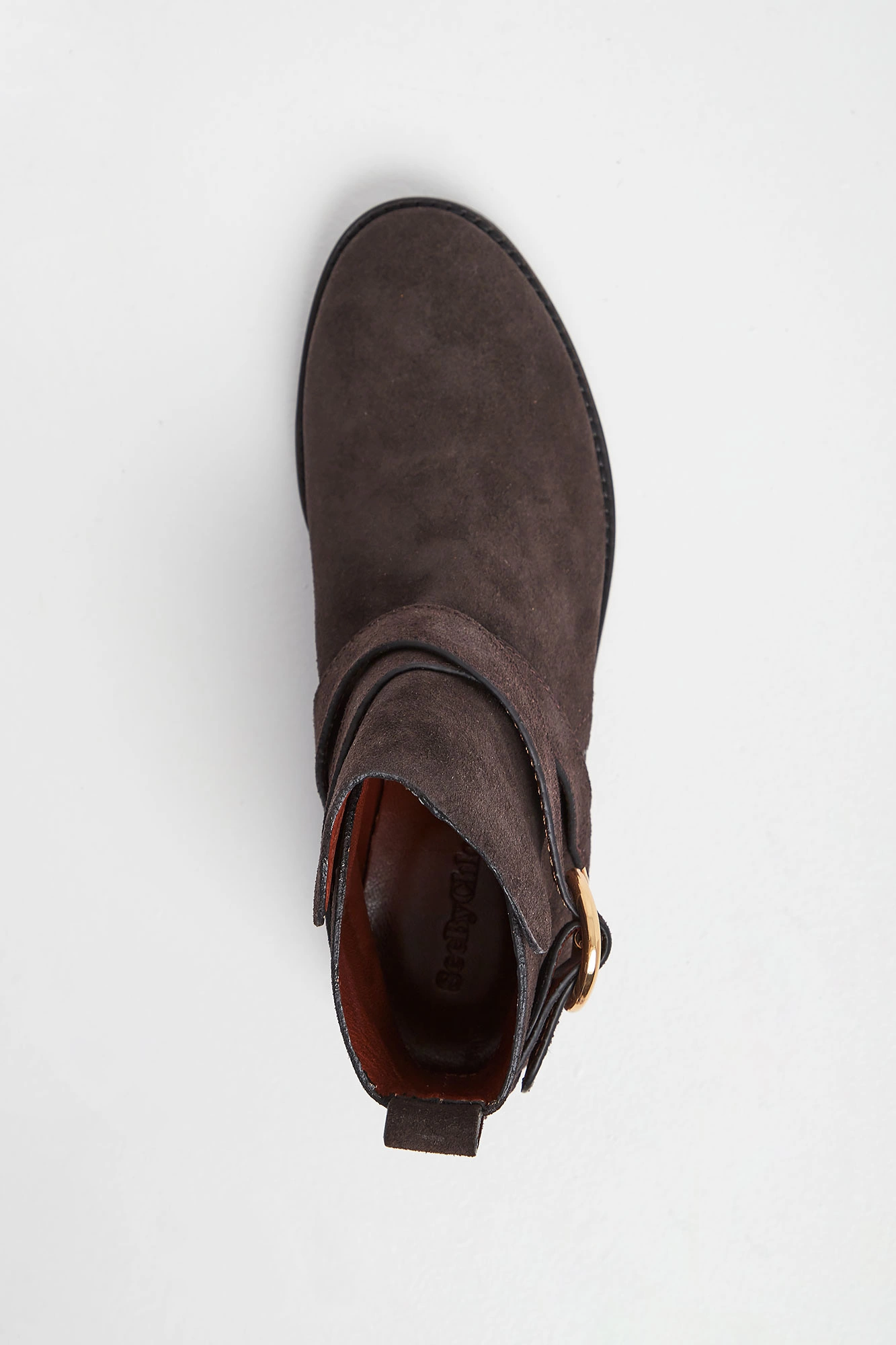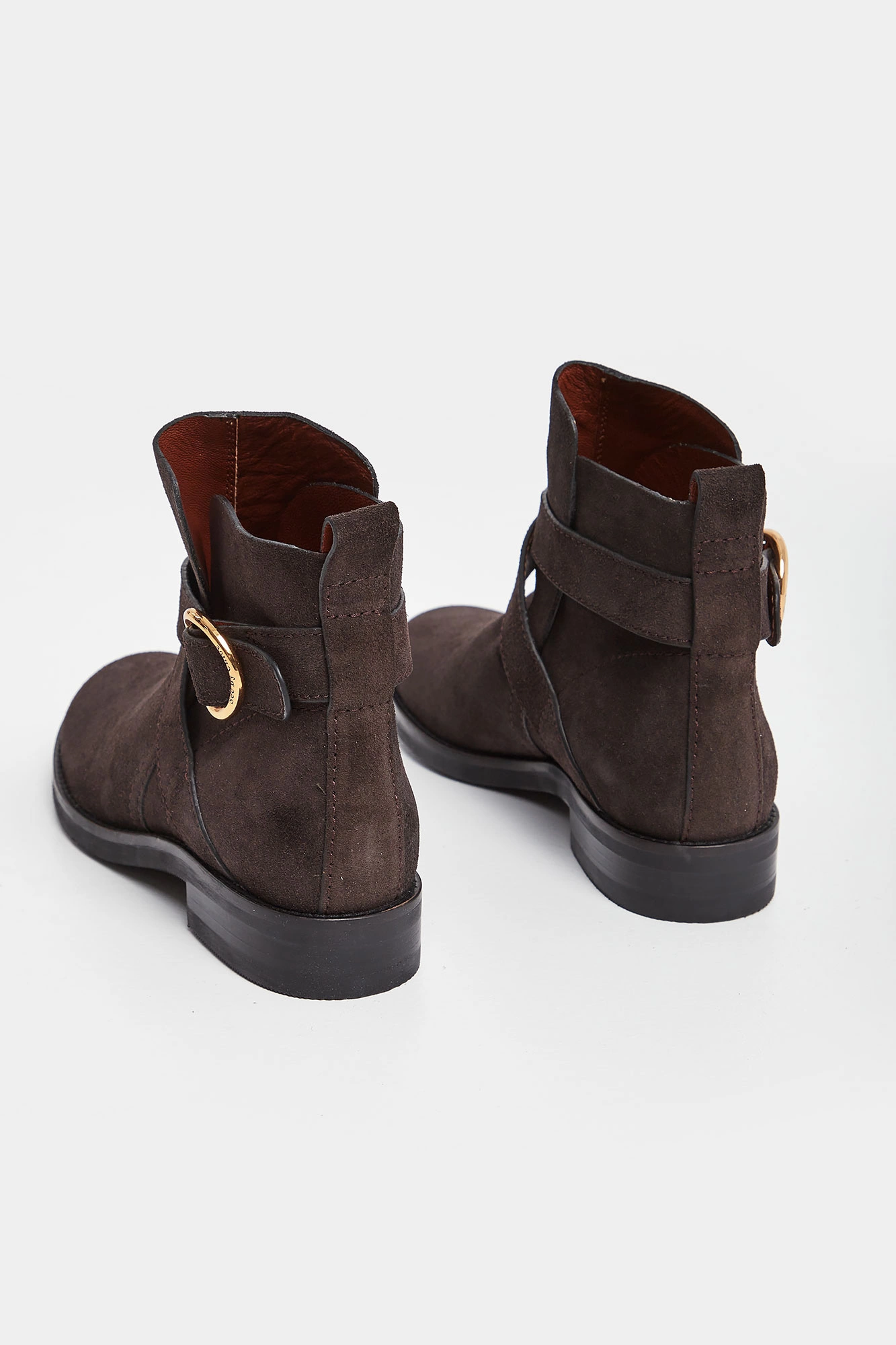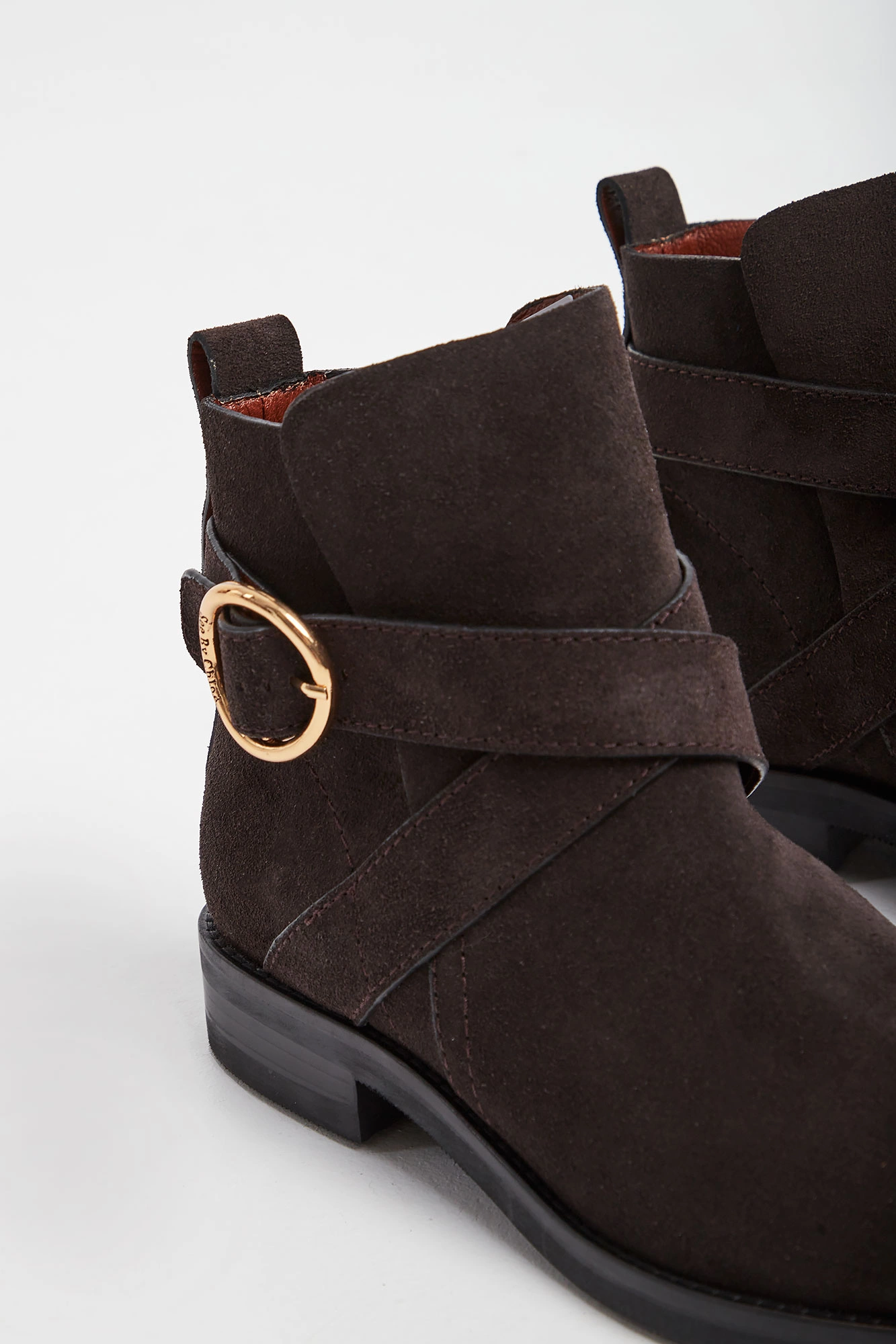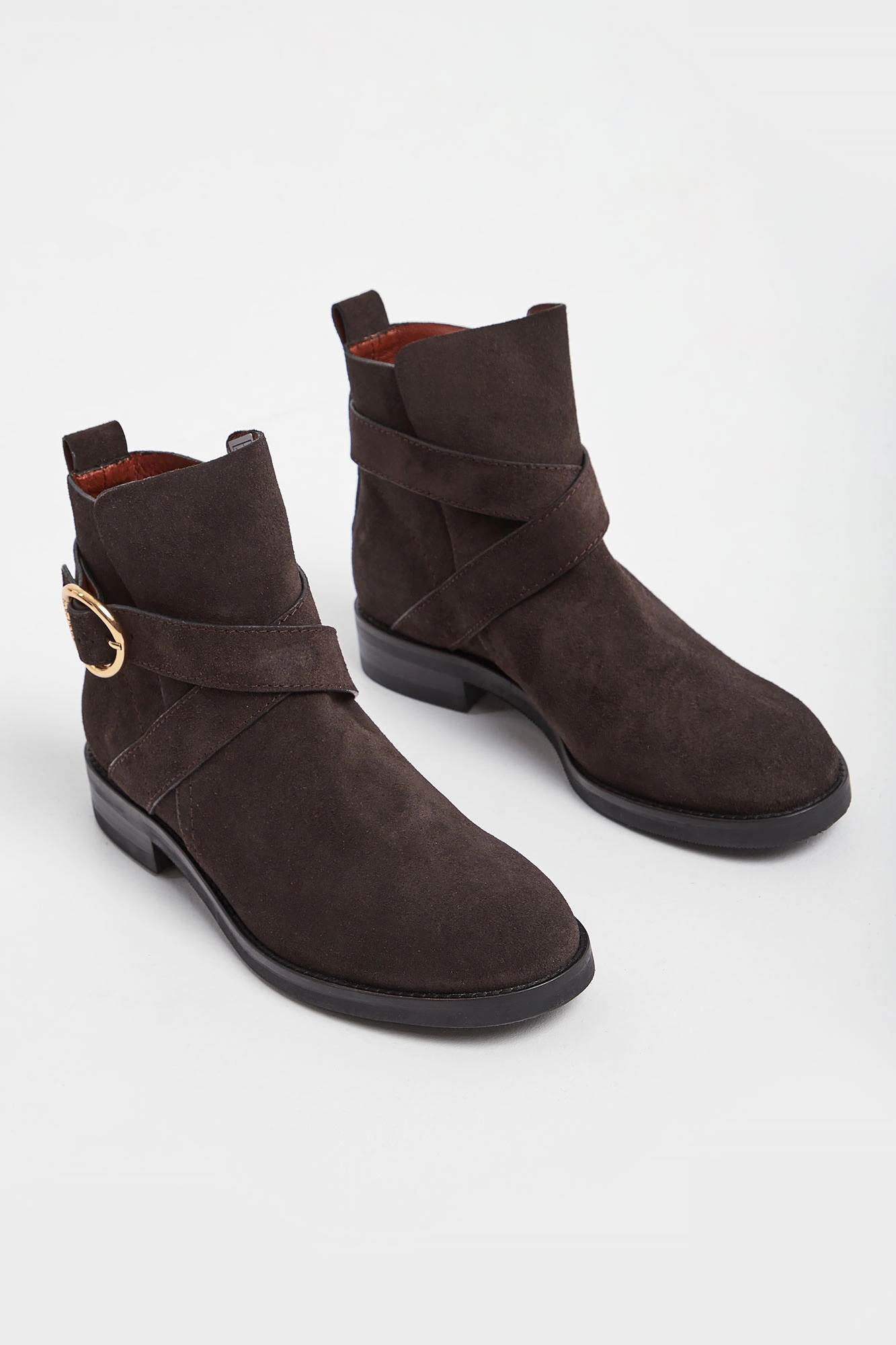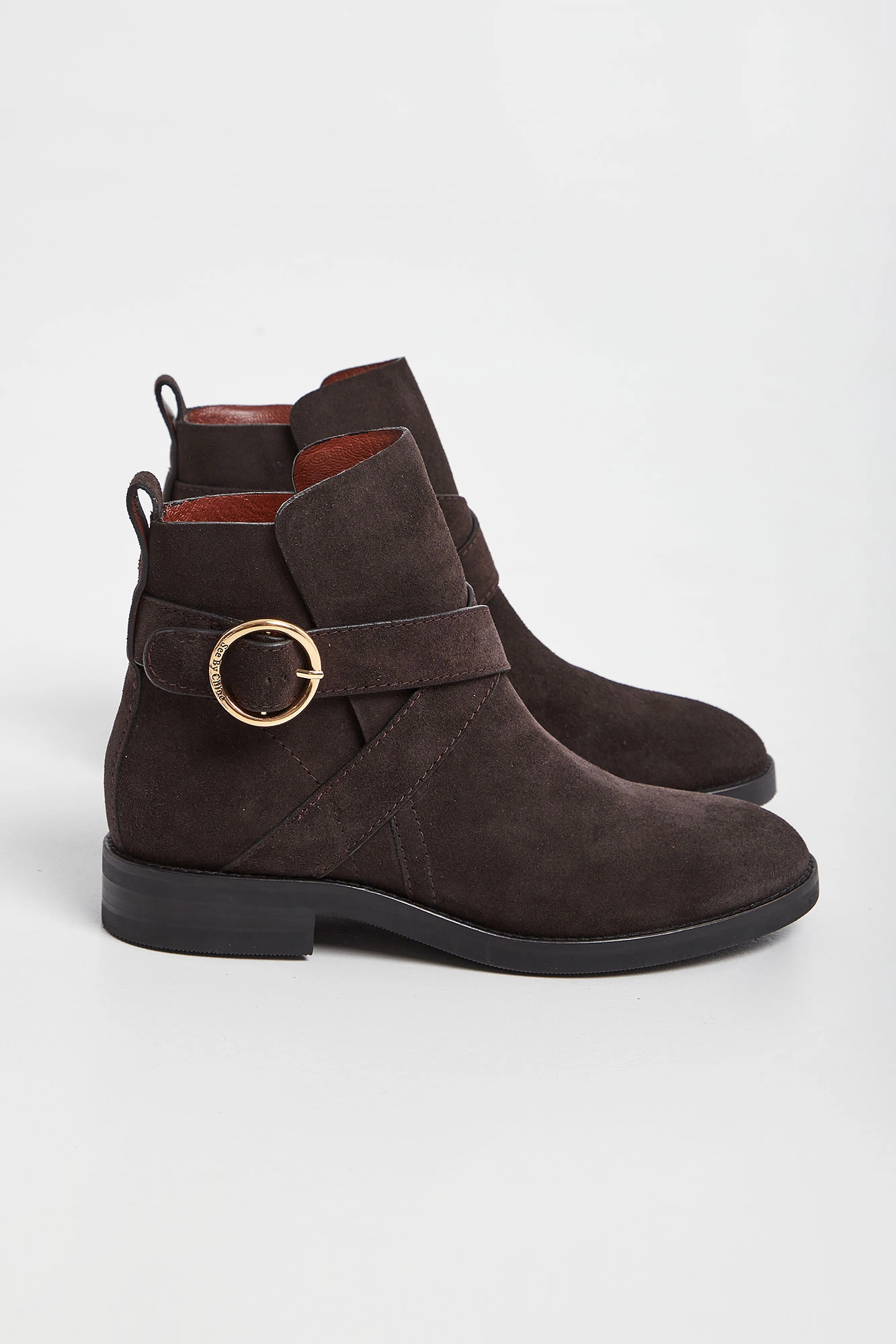 Skórzane botki marki See by Chloé w brązowym kolorze. Zaokrąglone noski. Na froncie skrzyżowane paski. Po bokach ozdobione złotymi, logowanymi sprzączkami. Z tyłu cholewki uchwyty ułatwiające zakładanie. Uniwersalna i ponadczasowa propozycja na jesień.
