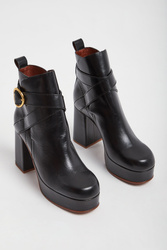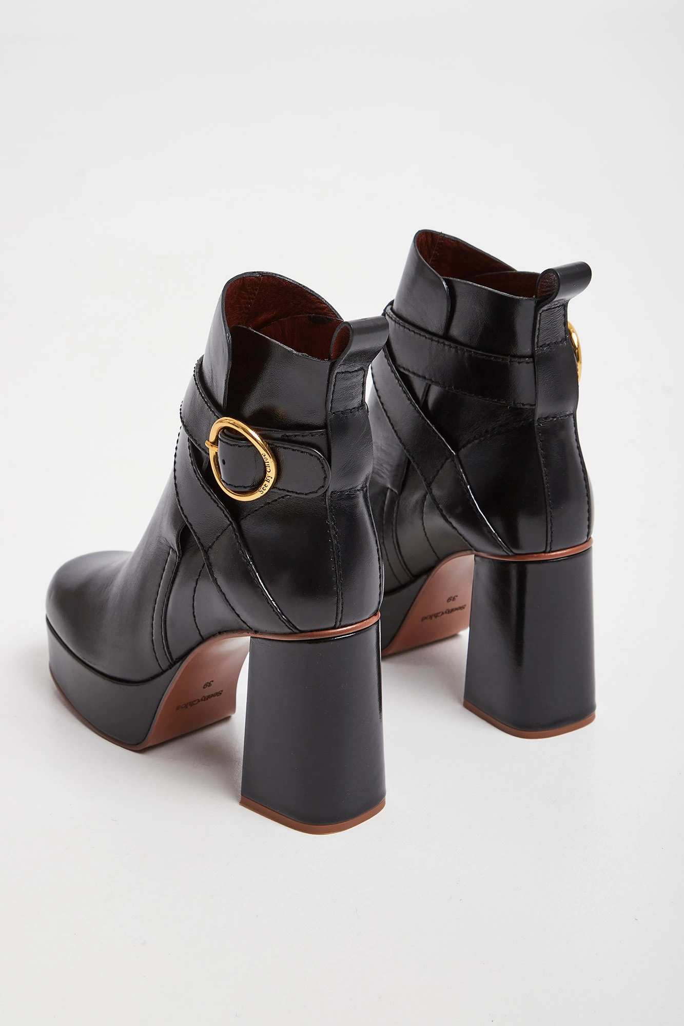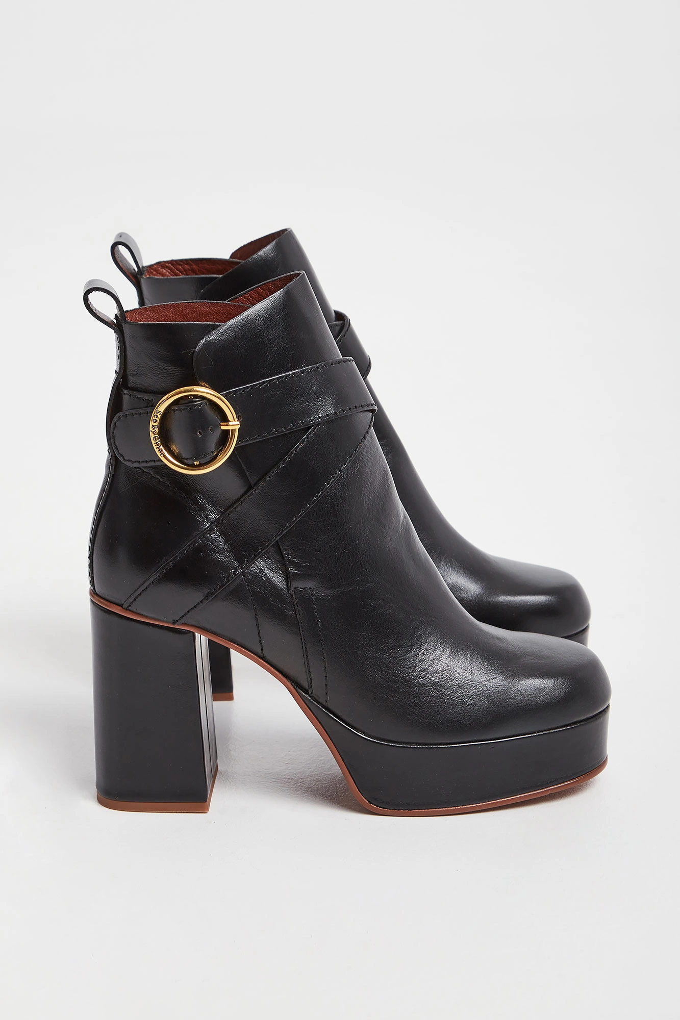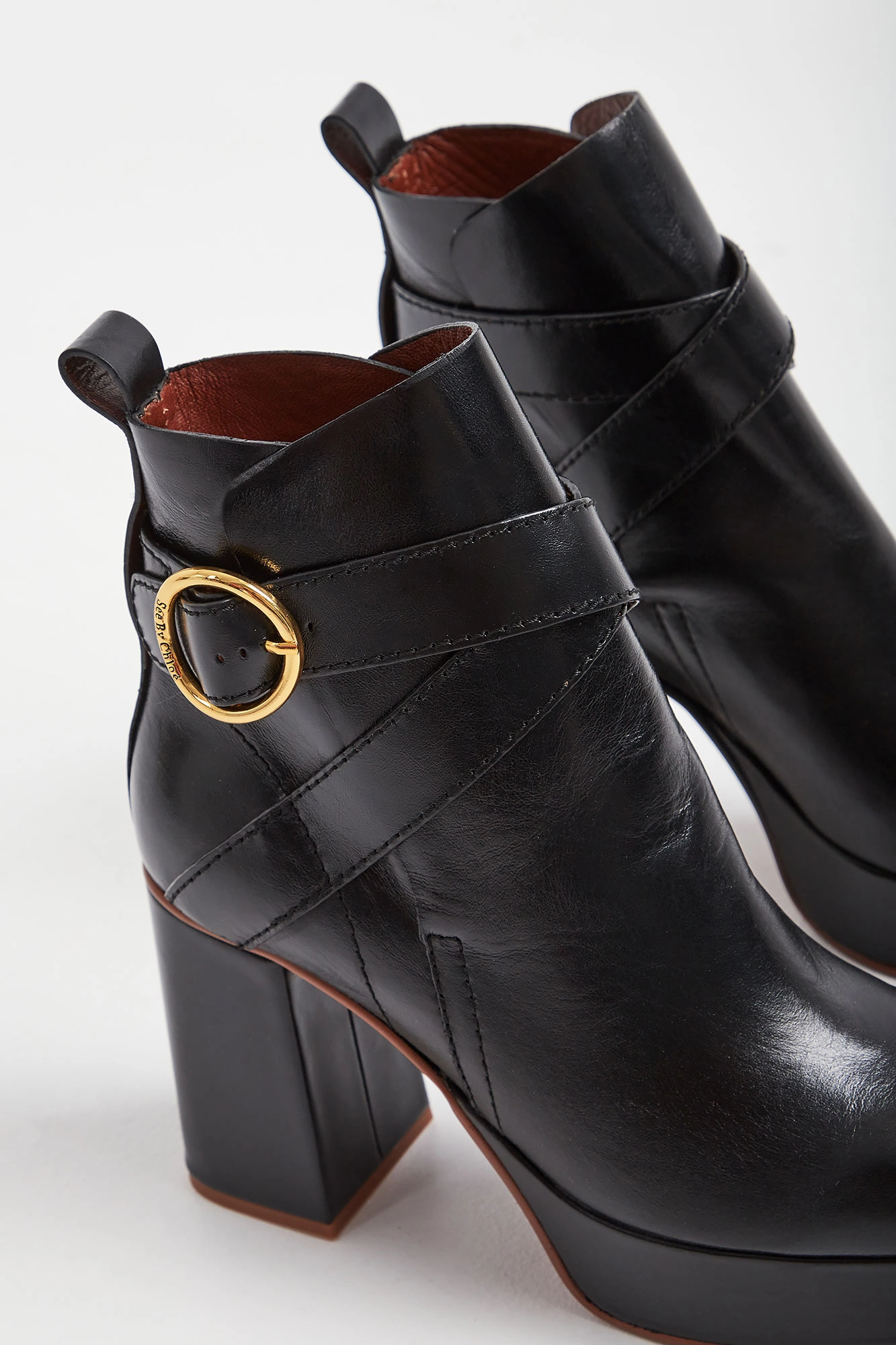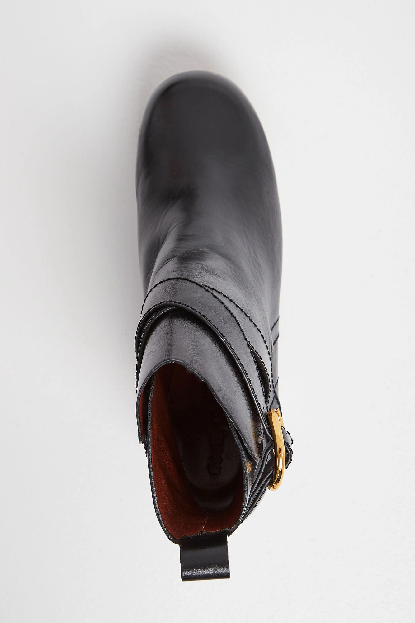 Skórzane botki marki See by Chloé w czarnym kolorze. Z zaokrąglonym noskiem, na słupku. Zapinane za pomocą paska ze złotą, sygnowaną klamrą. Na froncie krzyżujące się paski. Wnętrze i podeszwa w brązowym kolorze. Z tyłu cholewki uchwyty ułatwiające zakładanie.