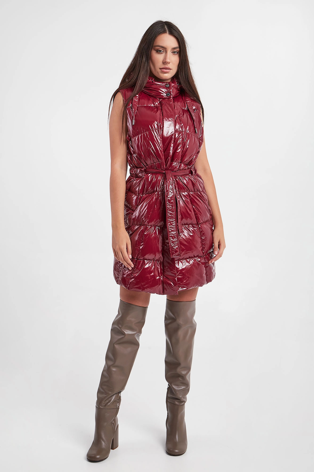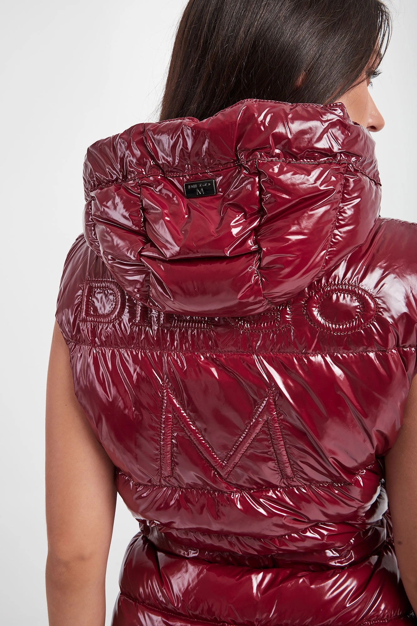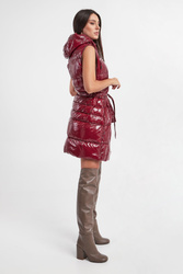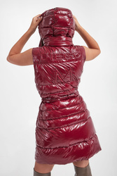 Kamizelka z kapturem marki Diego M w karminowym kolorze. Pikowana. Całość połyskująca. Zapinana za pomocą dwukierunkowego zamka z sygnowanymi zawieszkami i nap. Dwie boczne, zamykane kieszenie. Kołnierz ze stójką. Odpinany kaptur z troczkami i z dodatkową, zamykaną kieszonką. Z tyłu tłoczona nazwa. W talii szlufki i pasek. Fason regular.