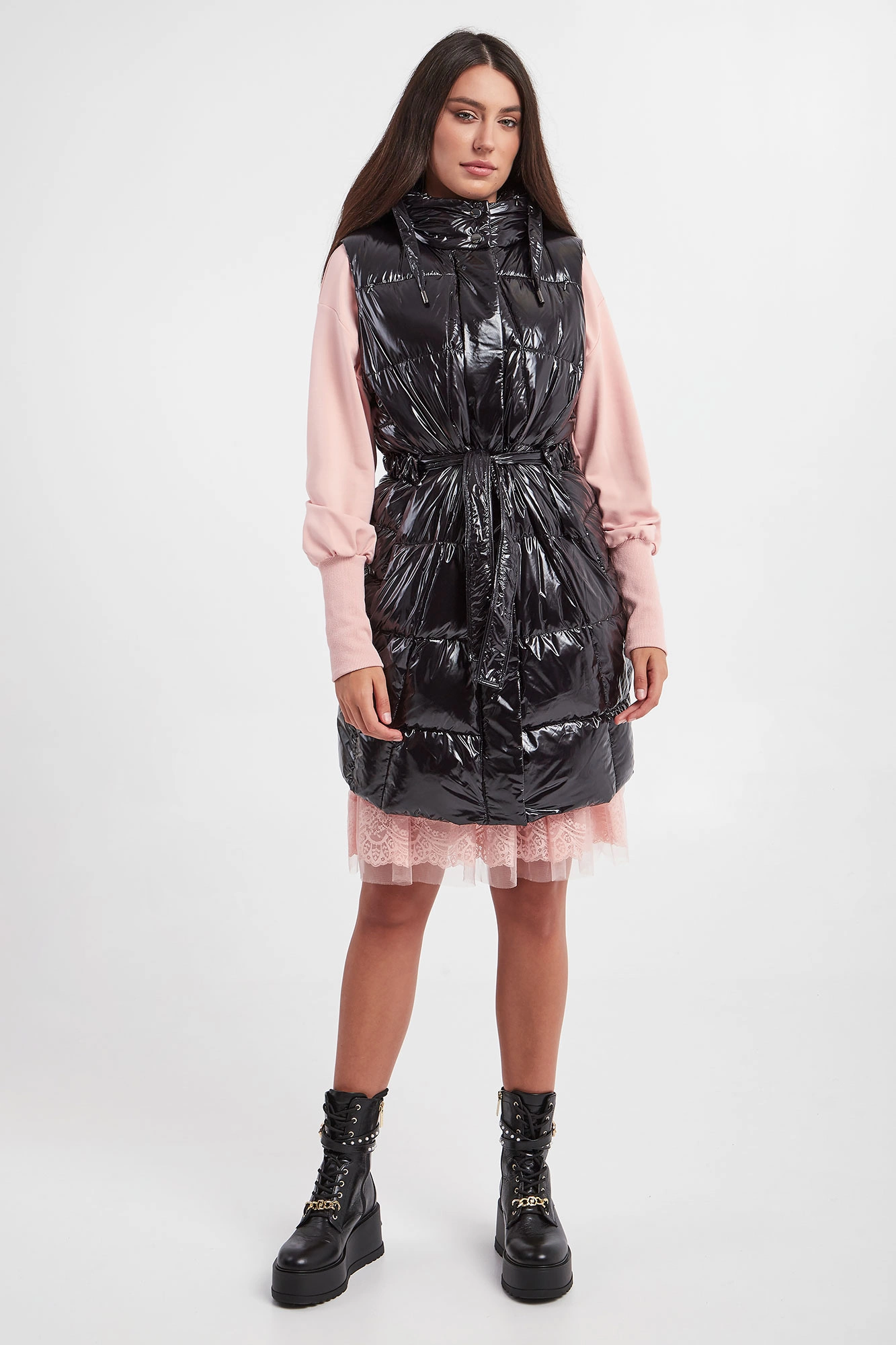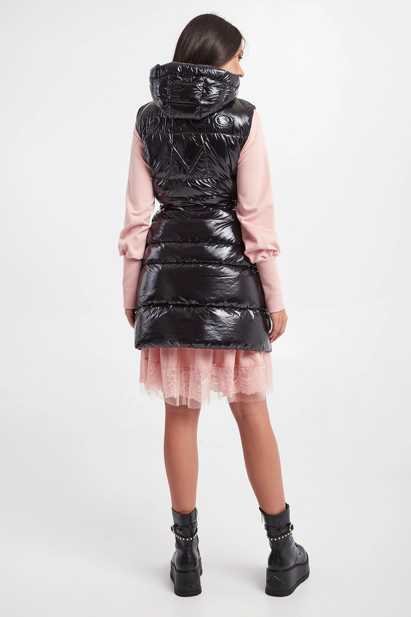 Kamizelka z kapturem marki Diego M w czarnym kolorze. Pikowana. Całość połyskująca. Zapinana za pomocą dwukierunkowego zamka z sygnowanymi zawieszkami i nap. Dwie boczne, zamykane kieszenie. Kołnierz ze stójką. Odpinany kaptur z troczkami i z dodatkową, zamykaną kieszonką. Z tyłu tłoczona nazwa. W talii szlufki i pasek. Fason regular.