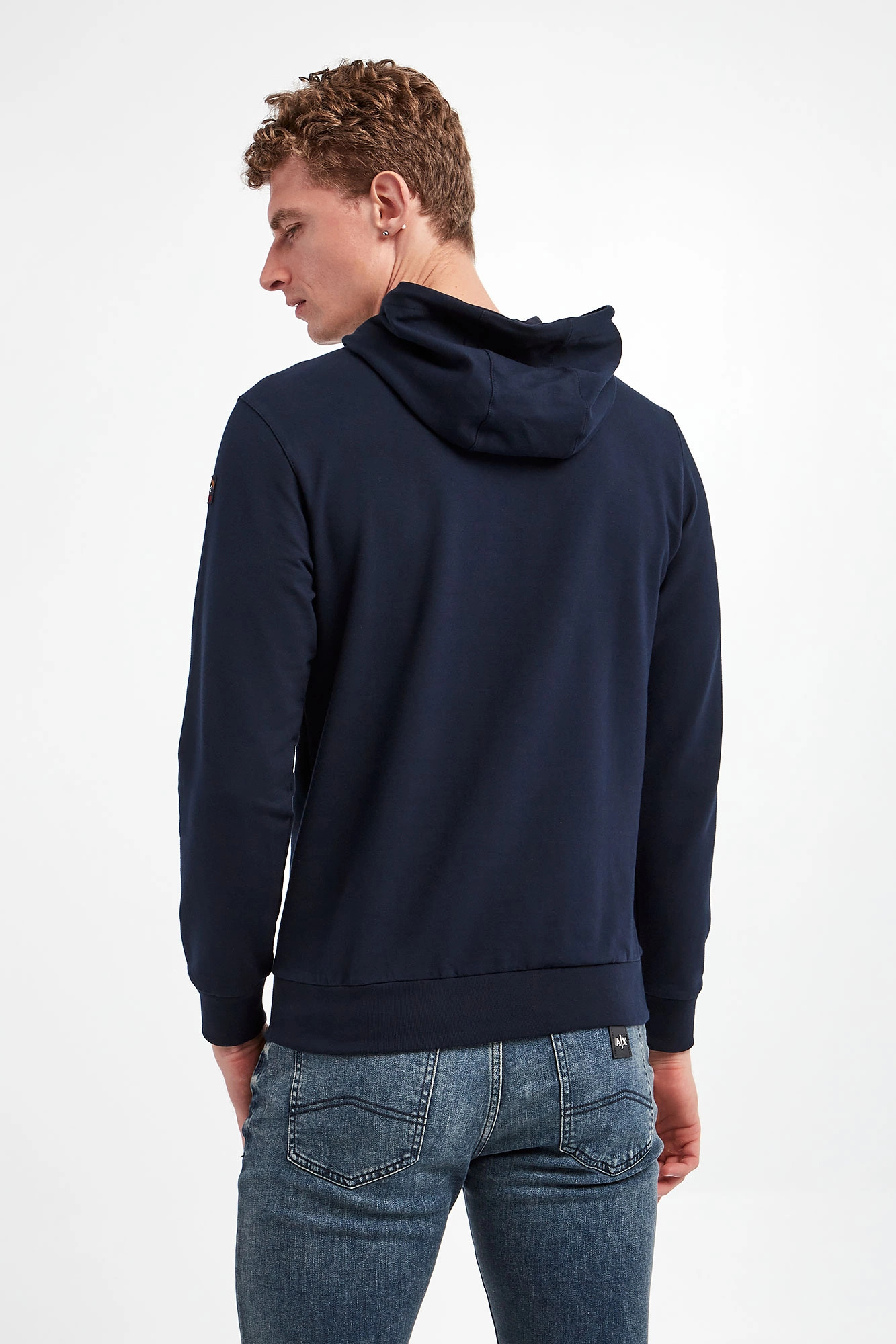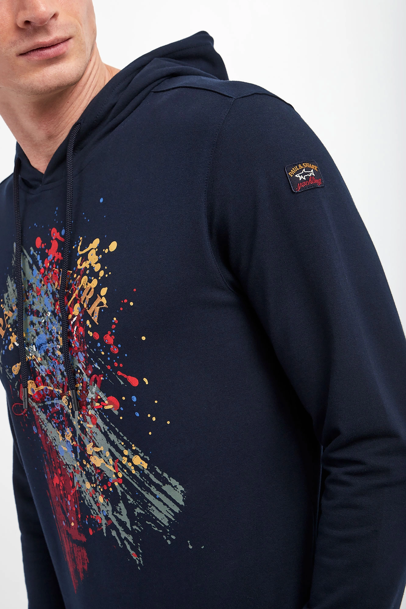 Bluza marki Paul&Shark w granatowym kolorze. Z kapturem regulowanym za pomocą troczków. Fason typu slim. Z przodu kangurkowa kieszeń i kolorowy nadruk z logo i nazwą marki. Długie rękawy i dół wykończone elastycznym ściągaczem. Wykonana z elastycznej bawełny.