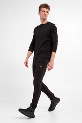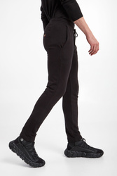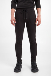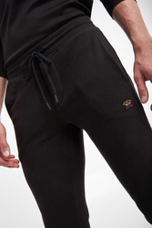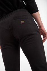Dzianinowe spodnie dresowe marki Paul&Shark w czarnym kolorze. Fason typu slim. Na froncie naszywka z logo marki. Dwie kieszenie z przodu i jedna z tyłu - tylna kieszeń zapinana na napę. W pasie ściągacz z sygnowanymi troczkami do regulacji. Wykonane z czystej bawełny.