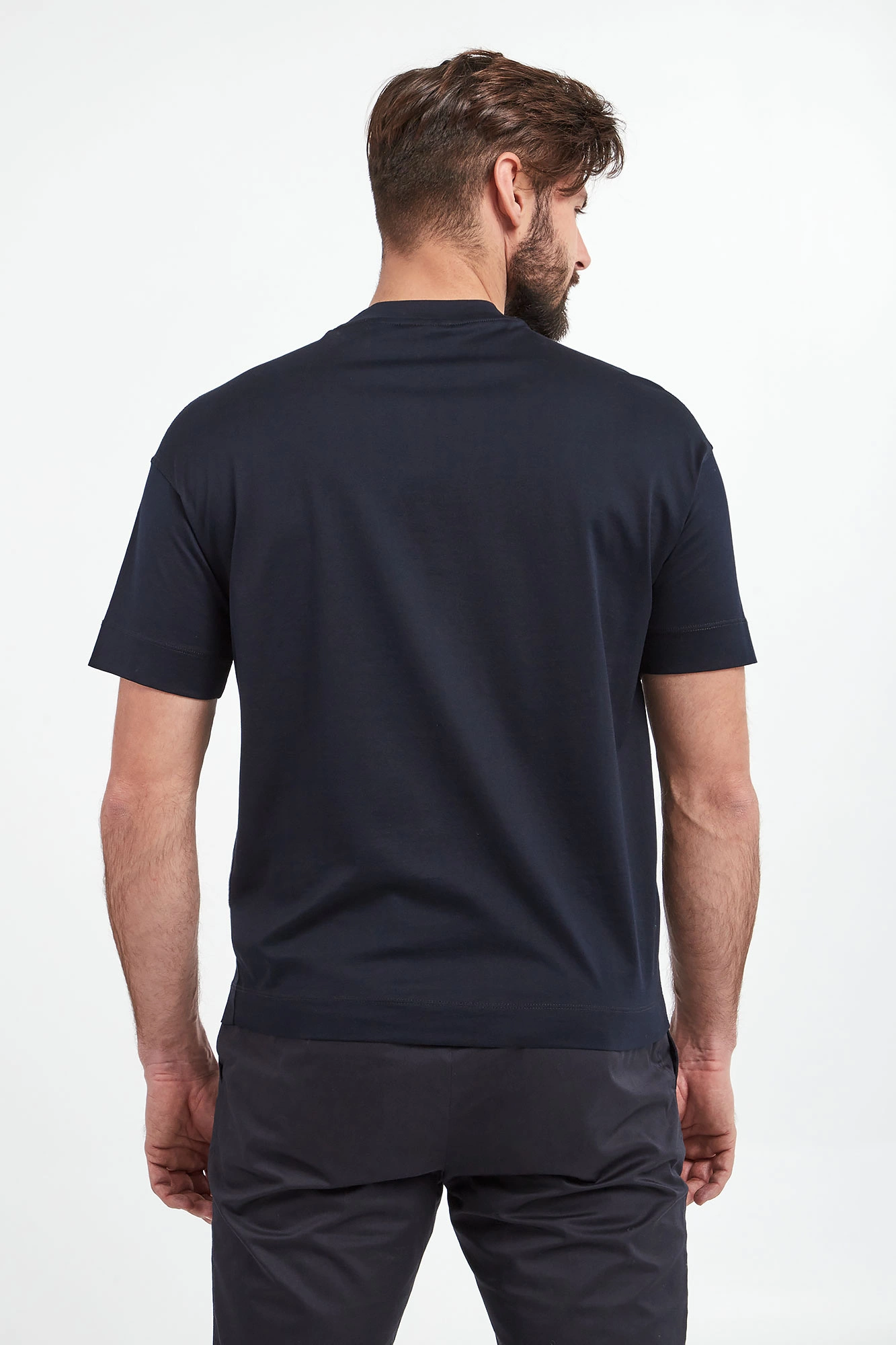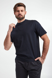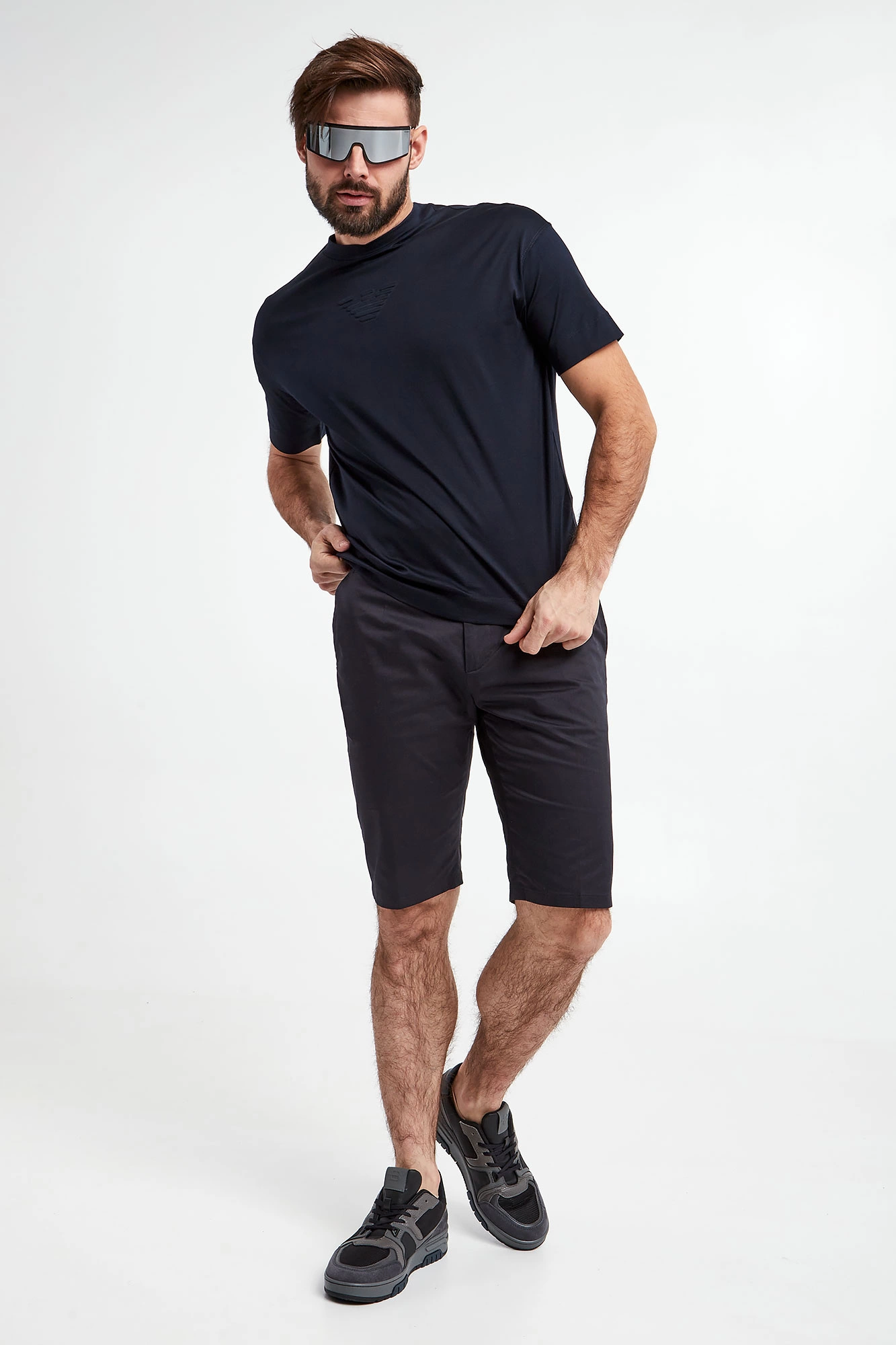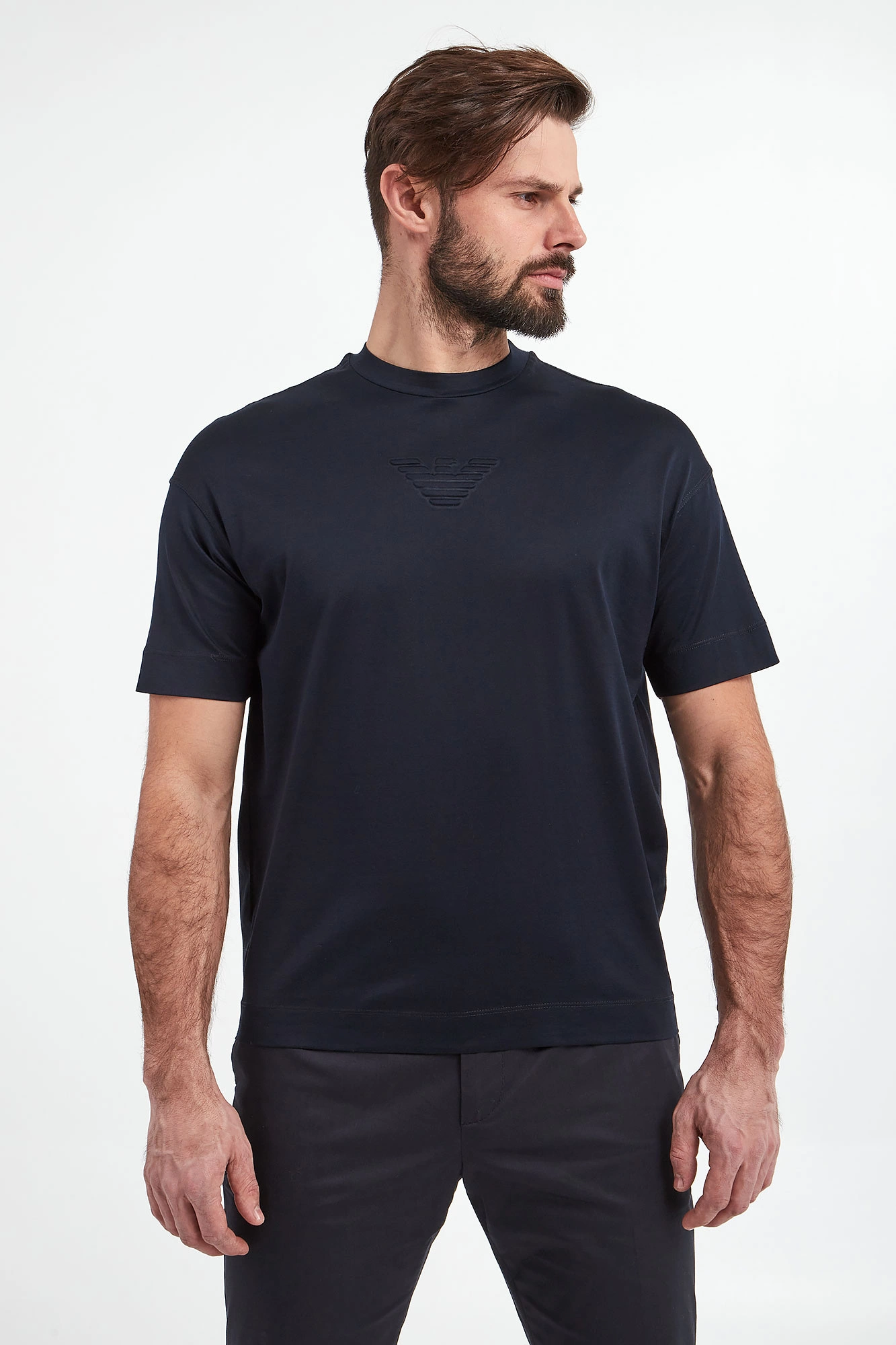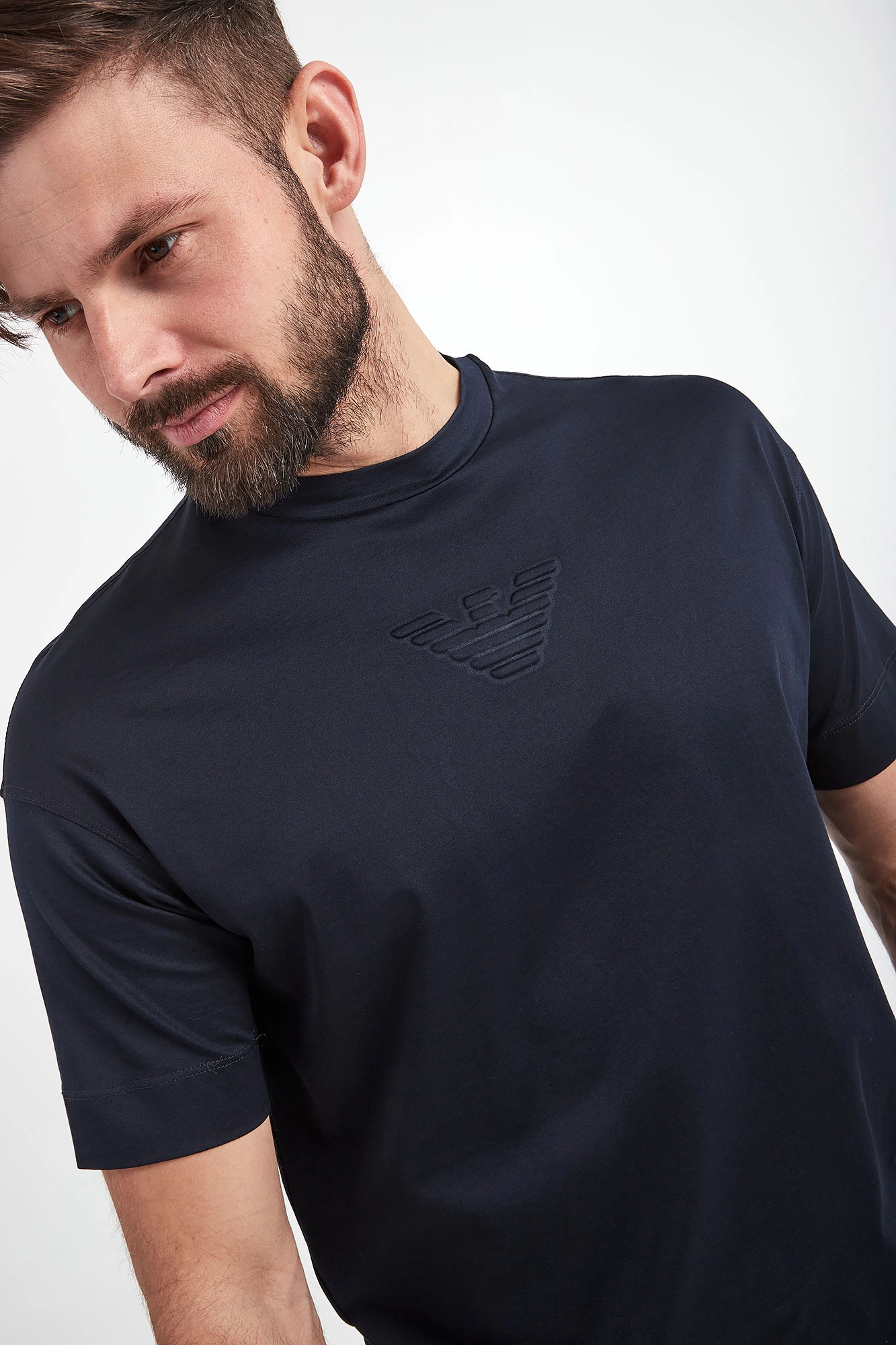 Bawełniany T-shirt marki Emporio Armani w grafitowym kolorze. Na froncie tłoczone logo marki. Dekolt o-neck wykończony gładkim ściągaczem. Fason typu regular.