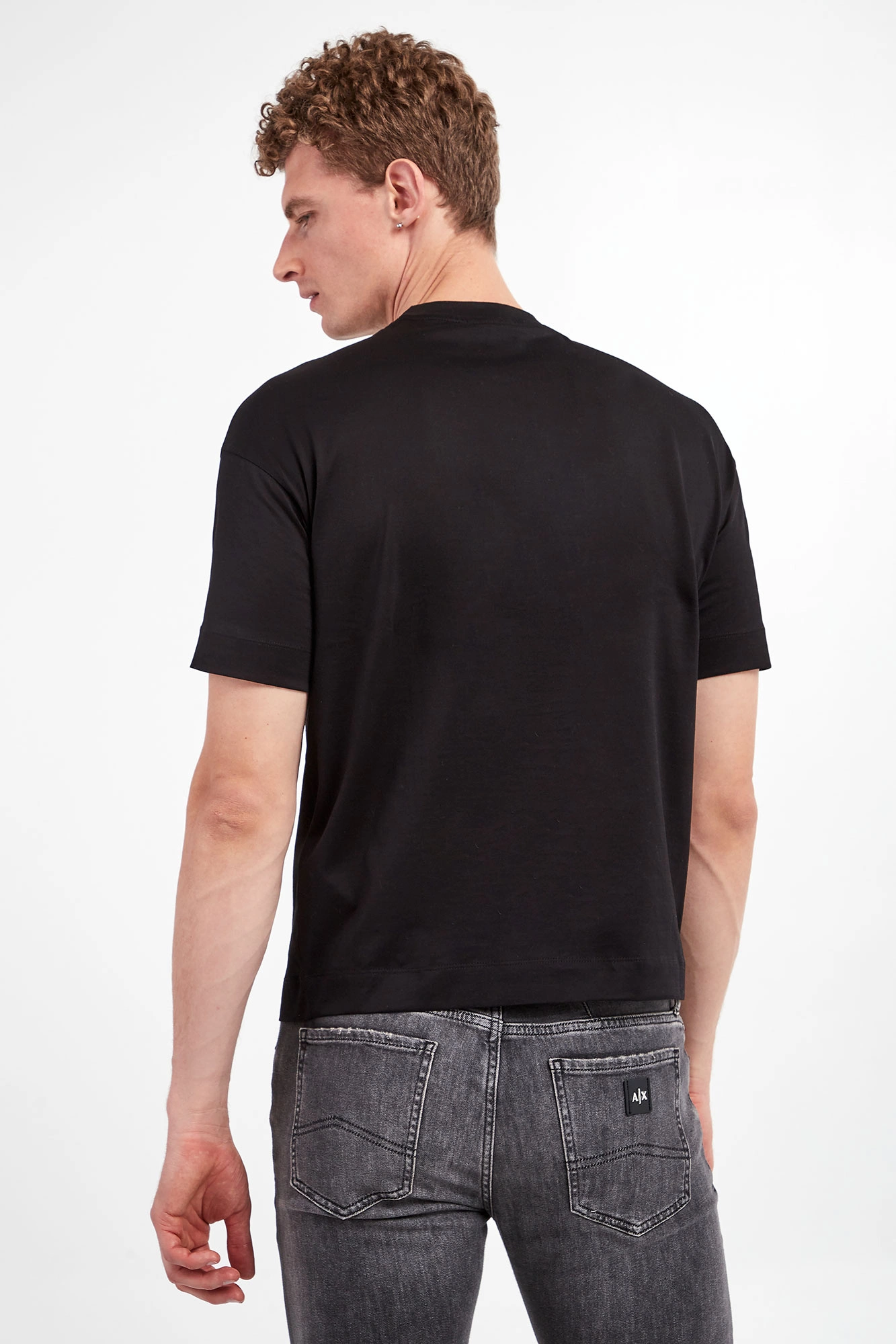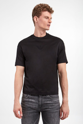 Bawełniany T-shirt marki Emporio Armani w czarnym kolorze. Na froncie tłoczone logo marki. Dekolt o-neck wykończony gładkim ściągaczem. Fason typu regular.