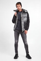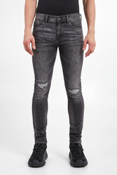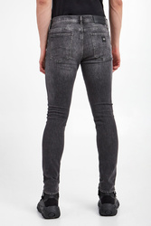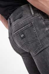 Jeansy marki Armani Exchange w szarym kolorze. Fason typu slim. Na całości ozdobne przetarcia. Model z pięcioma kieszeniami. Z przodu i z tyłu niewielka aplikacja z logo marki w srebrnym kolorze. W pasie szlufki. Zapinane za pomocą sygnowanego guzika i zamka. Z tyłu skórzana naszywka z tłoczoną nazwą i logo marki w czarnym kolorze. Wykonane z nieco elastycznej bawełny.