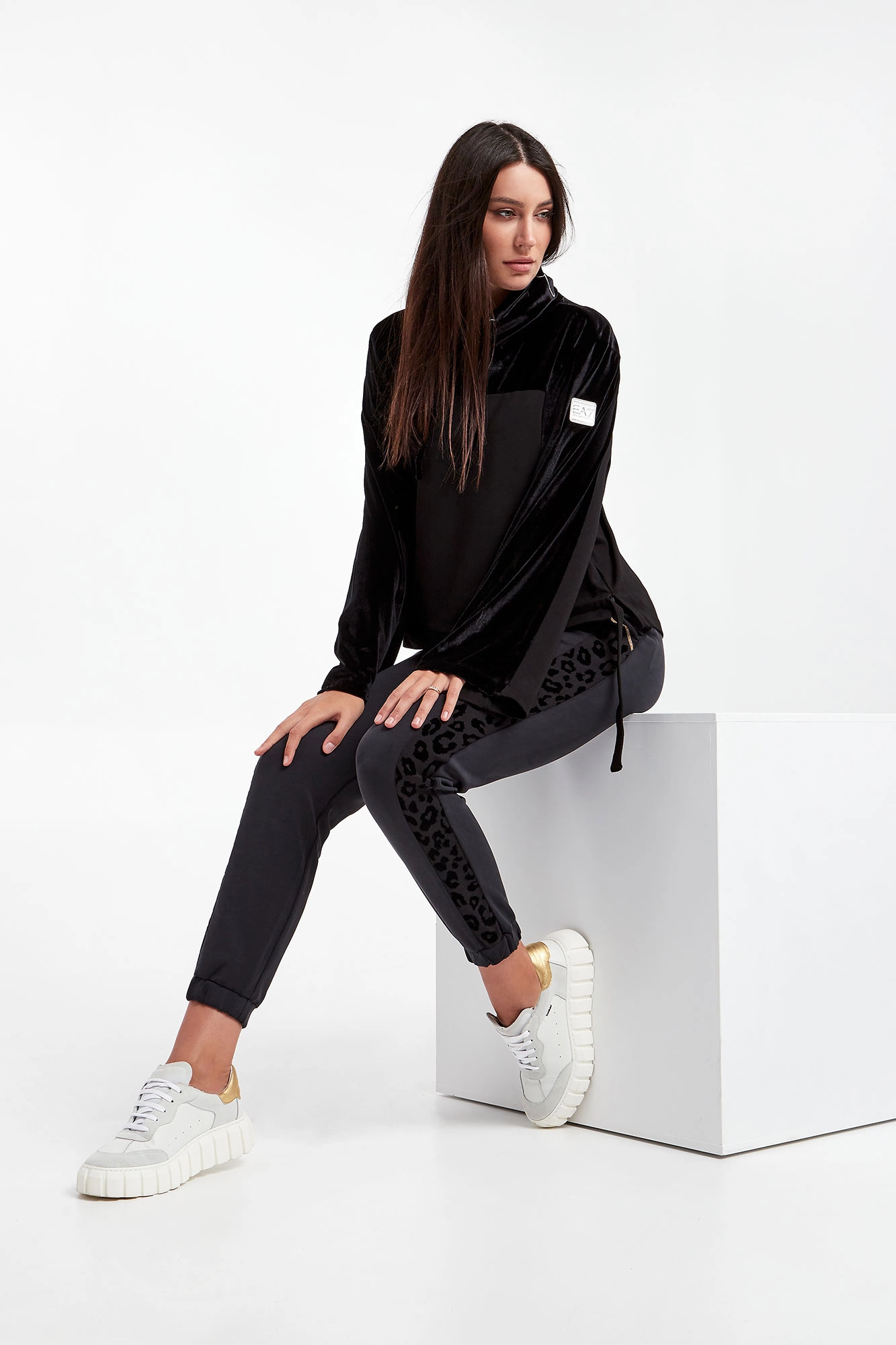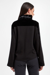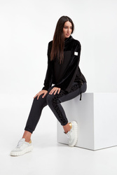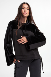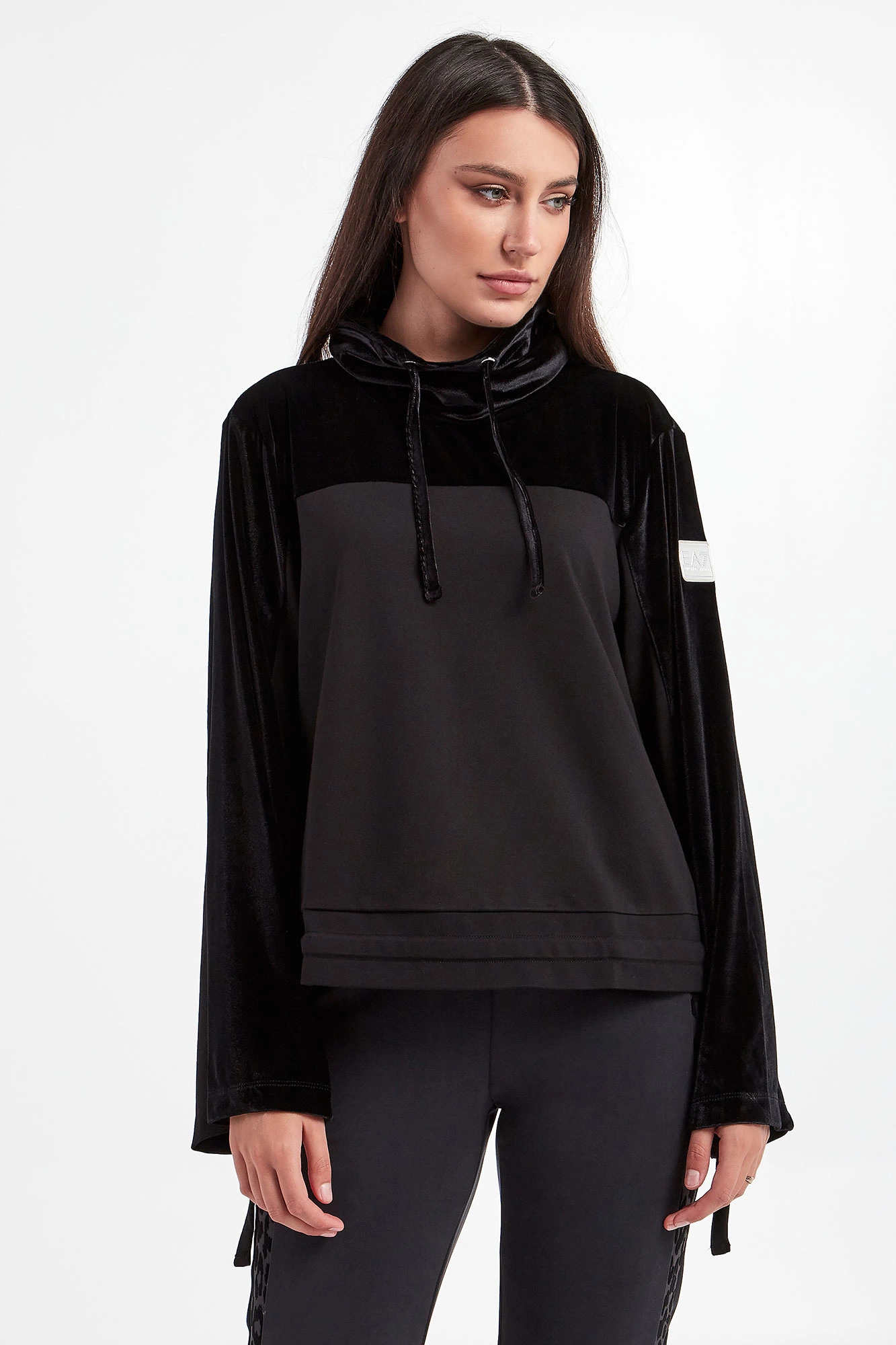Bluza marki EA7 Emporio Armani w czarnym kolorze. Dekolt z luźnym golfem, zakończonym troczkami oraz z sygnowaniem. Góra oraz część rękawów z welurowym wykończeniem. Po bokach niewielkie rozcięcia. U dołu ściągacz z troczkami do regulacji. Rękawy szerokie, na jednym ramieniu plakietka z nazwą marki. Fason typu relaxed.