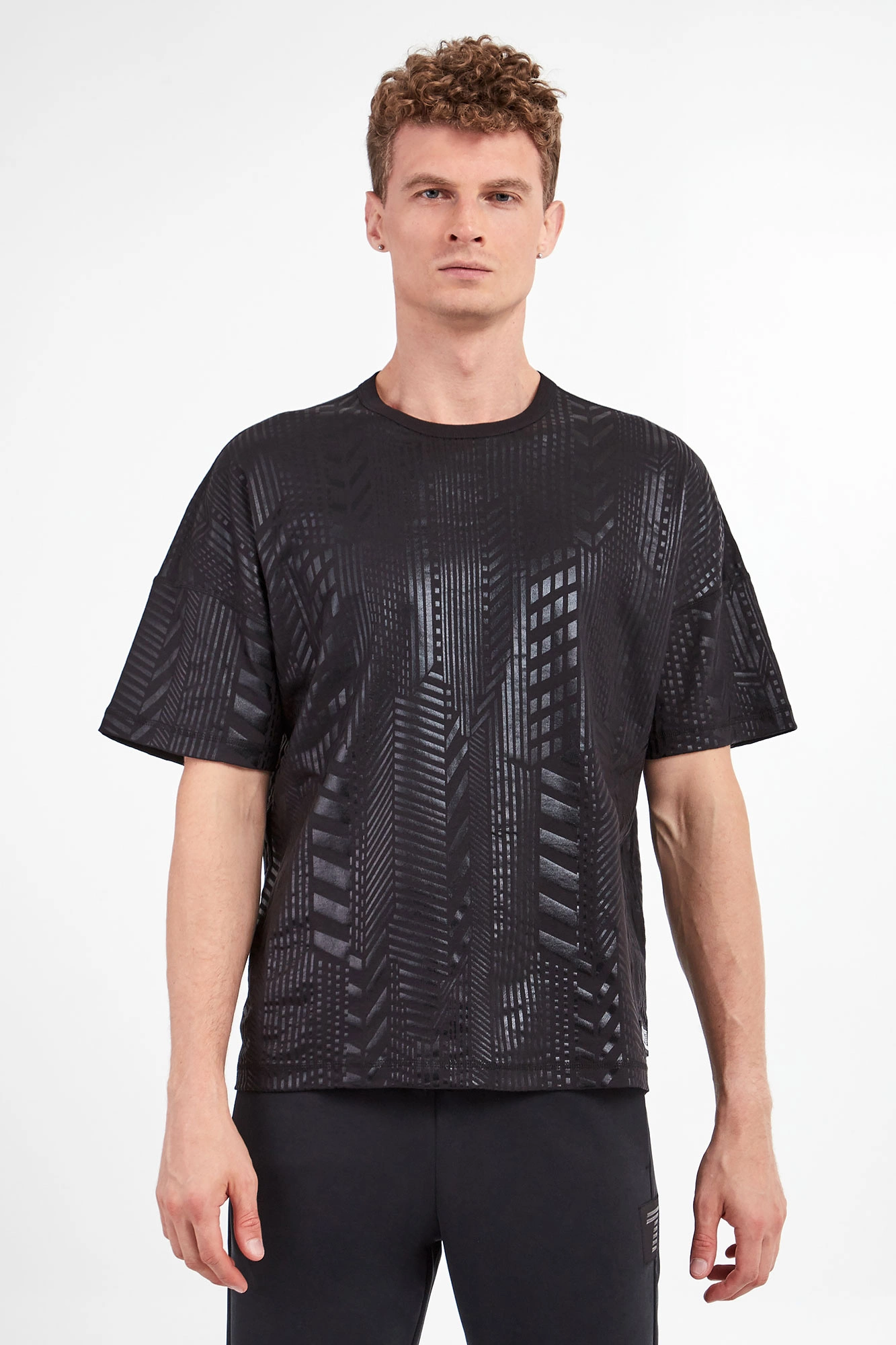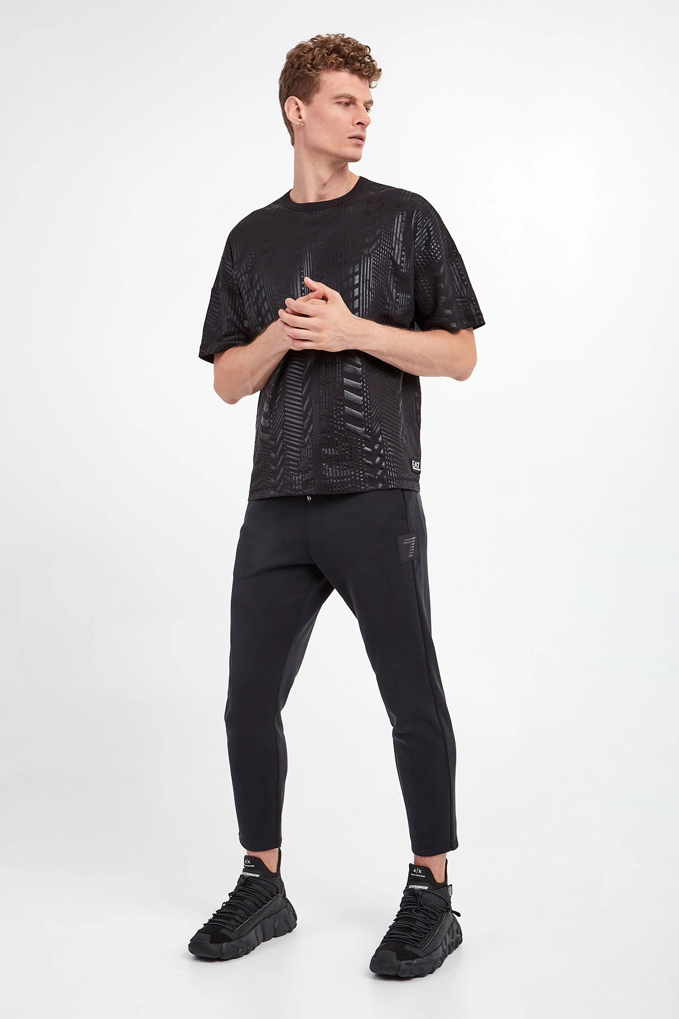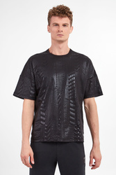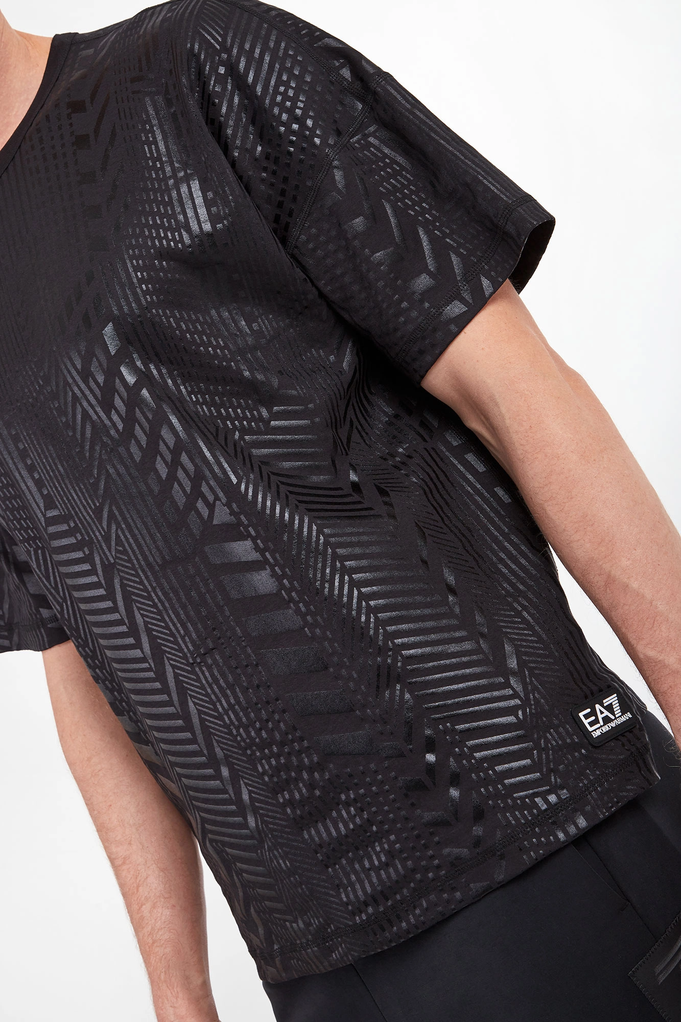 Bawełniany T-shirt marki EA7 Emporio Armani w kolorze czarnym. Na całości połyskujący nadruk. U dołu gumowana plakietka z logo marki. Dekolt o-neck wykończony gładkim ściągaczem. Fason typu relaxed.