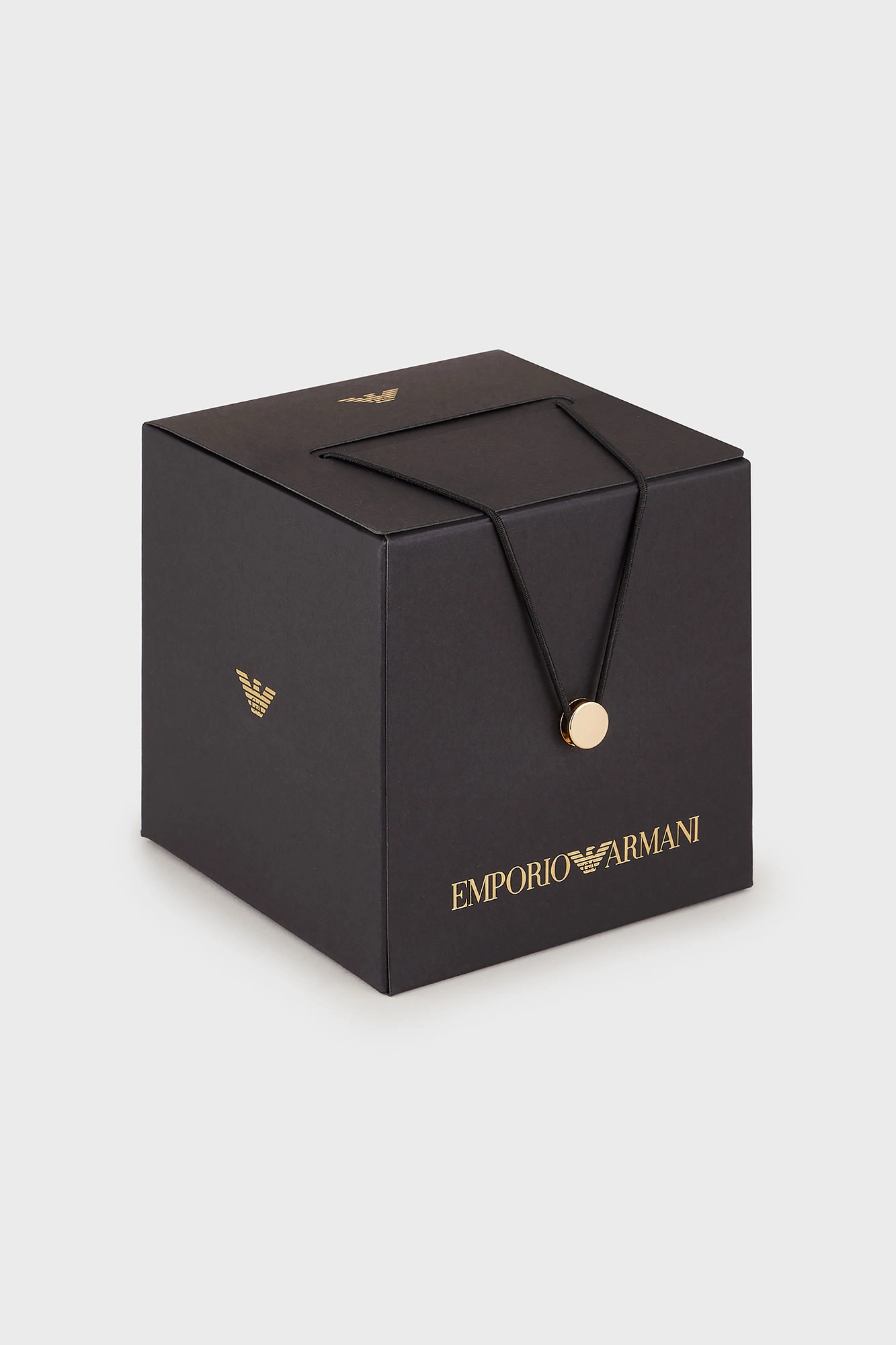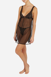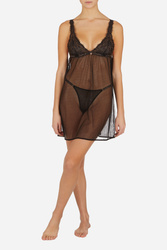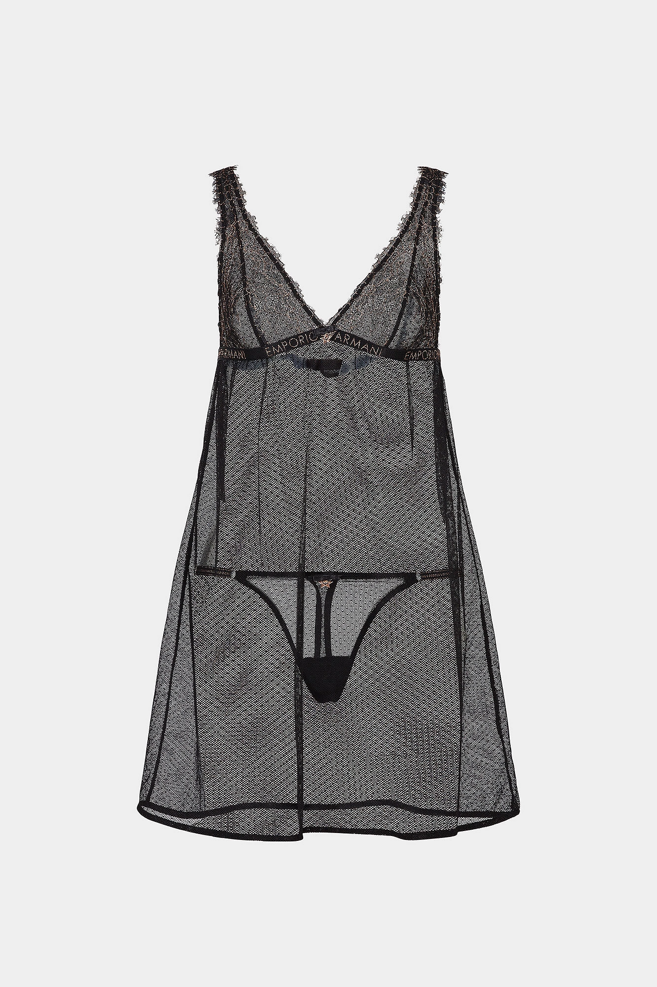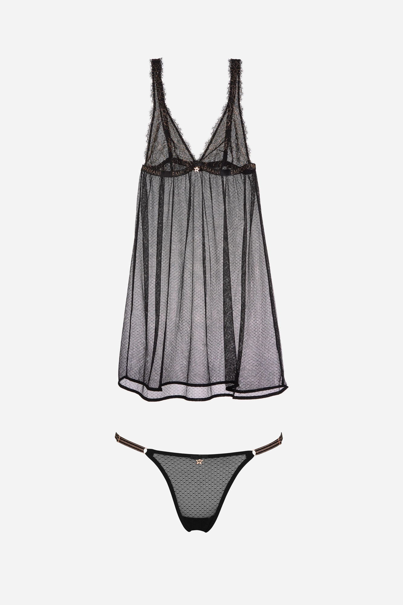 Koronkowy komplet bielizny EMPORIO ARMANI w kolorze czarnym. Koszula nocna wzorzysta, na biuście ozdobiona złotą nitką. Pod biustem tasiemka z nazwą marki i metalową aplikacją. Tył regulowany. Majtki mają fason stringów. Po bokach regulowane ściągacze ze złotą nitką. Do kompletu dołączone jest sygnowane pudełko, idealne na prezent.