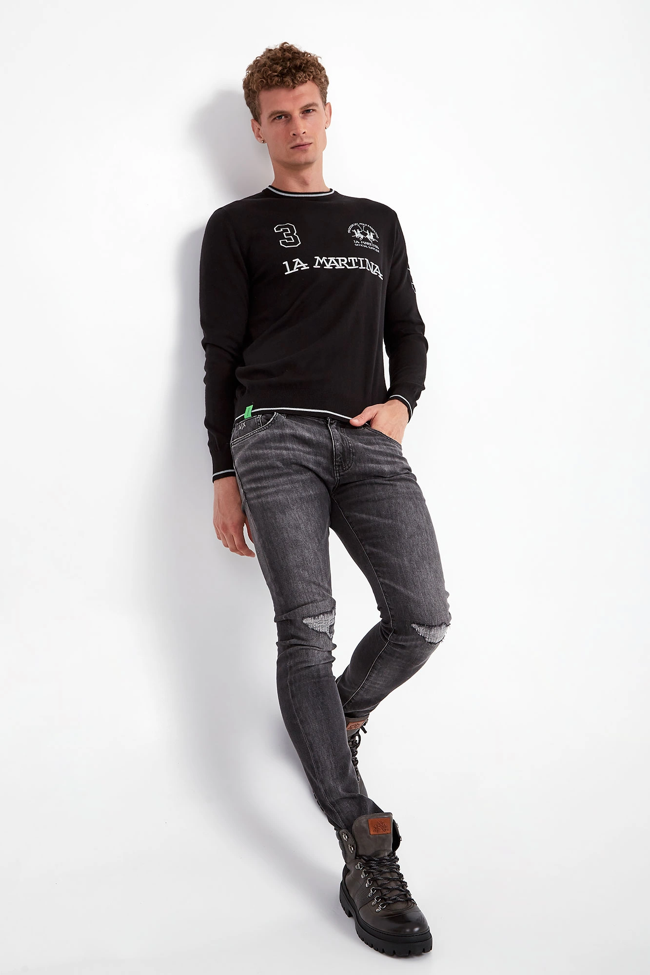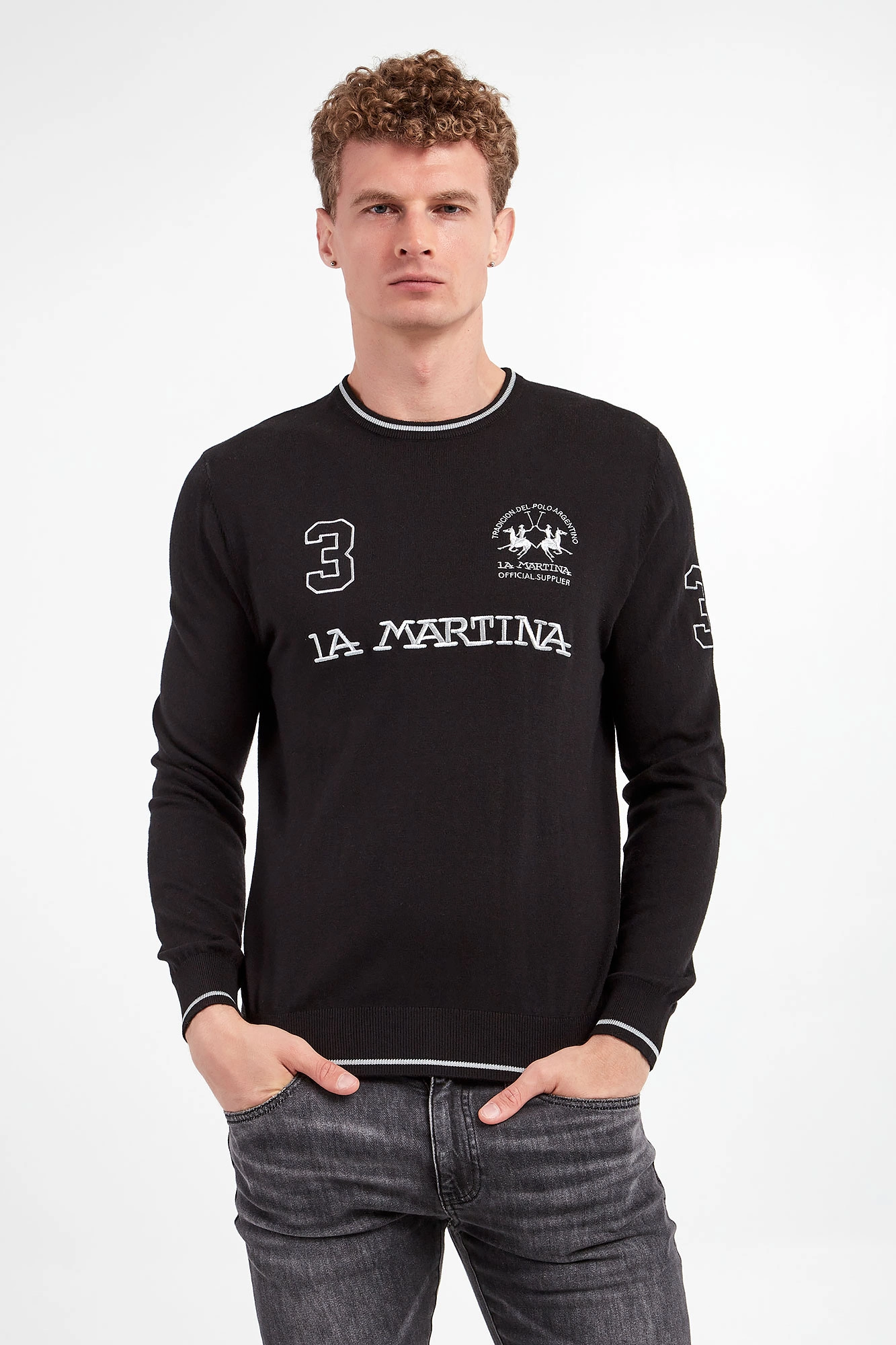 Wełniany sweter marki La Martina w czarnym kolorze. Z przodu duży haft w postaci logo i nazwy marki w szarym kolorze. Dekolt typu o-neck, długie rękawy i dół wykończone elastycznym ściągaczem szarym lampasem. Fason typu regular. Wykonany z elastycznej mieszanki wełny i bawełny.