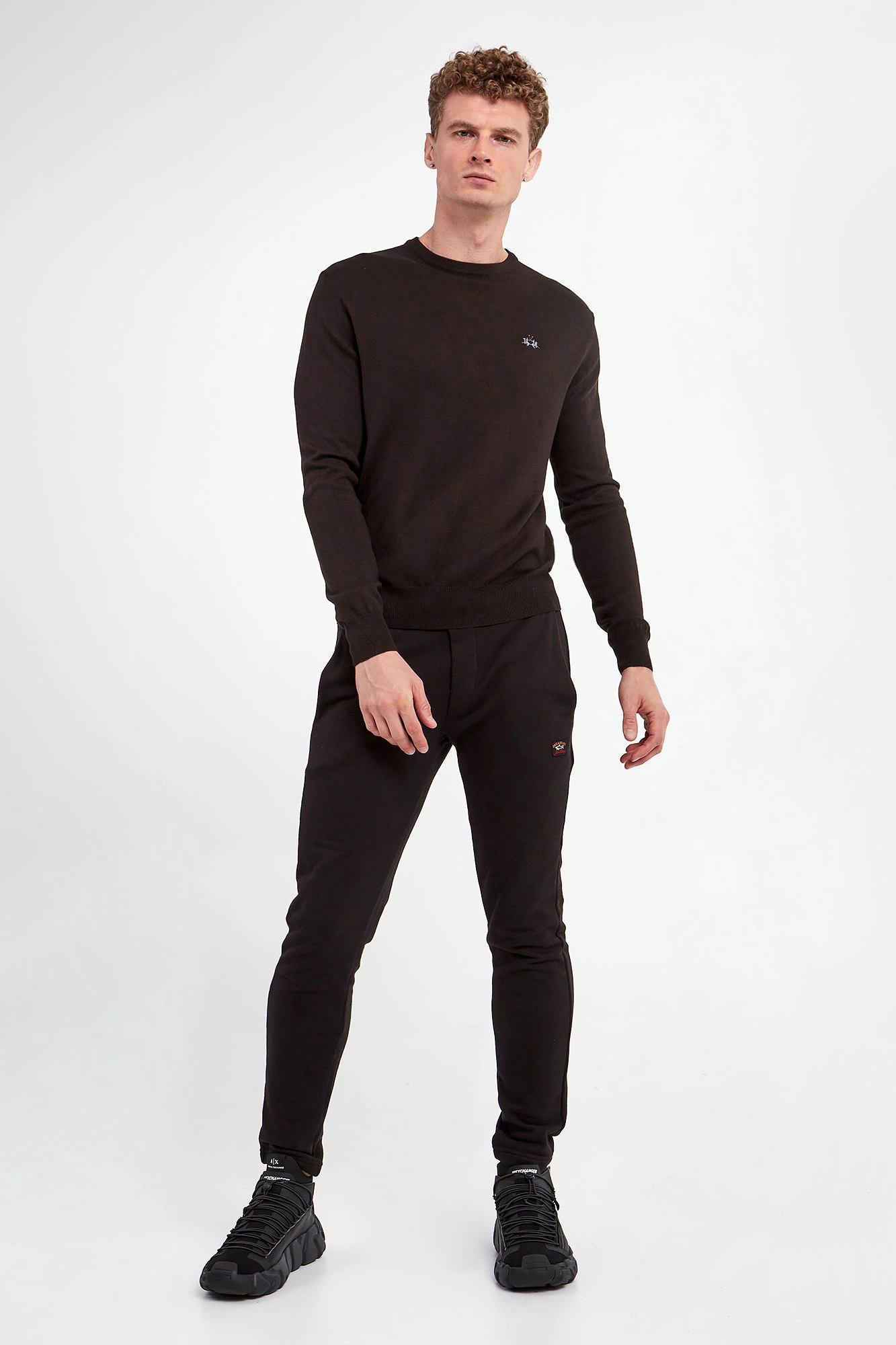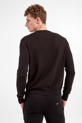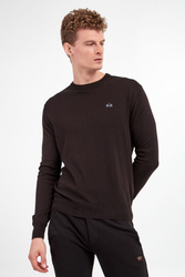 Sweter marki La Martina w ciemnym, brązowym kolorze. Z przodu haft w postaci logo marki w szarym kolorze. Dekolt typu o-neck, długie rękawy i dół wykończone elastycznym ściągaczem. Fason typu regular. Wykonany z elastycznej mieszanki wełny i bawełny.