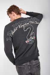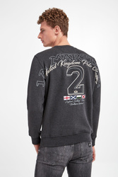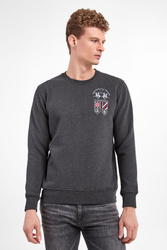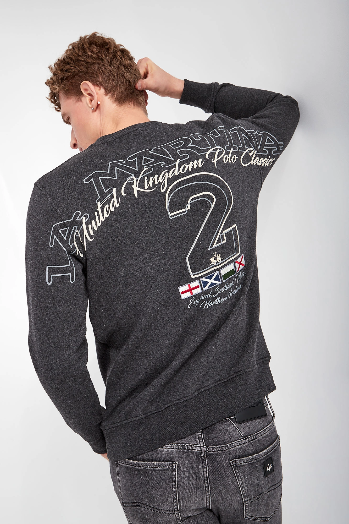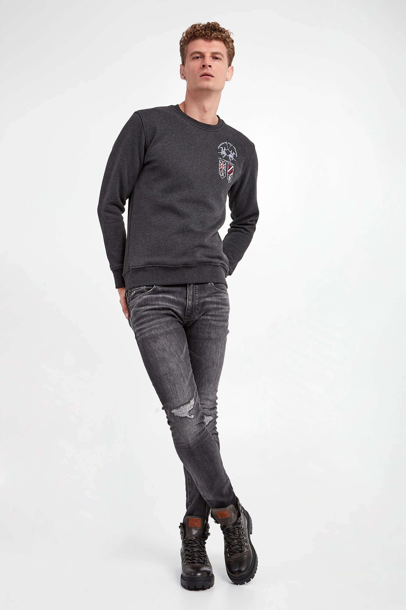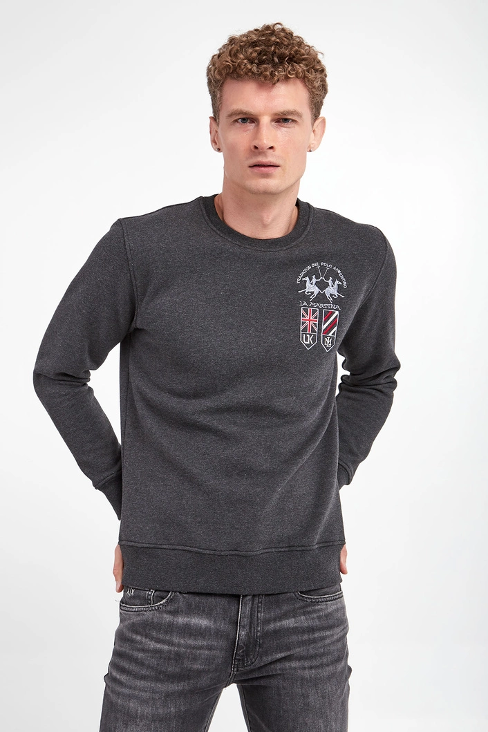 Dzianinowa bluza marki La Martina w kolorze szarego melanżu. Z przodu i z tyłu haft z logo i nazwą marki. Dekolt typu o-neck, długie rękawy i dół wykończone elastycznym ściągaczem. Wykonana z czystej, mięsistej bawełny. Fason typu regular.