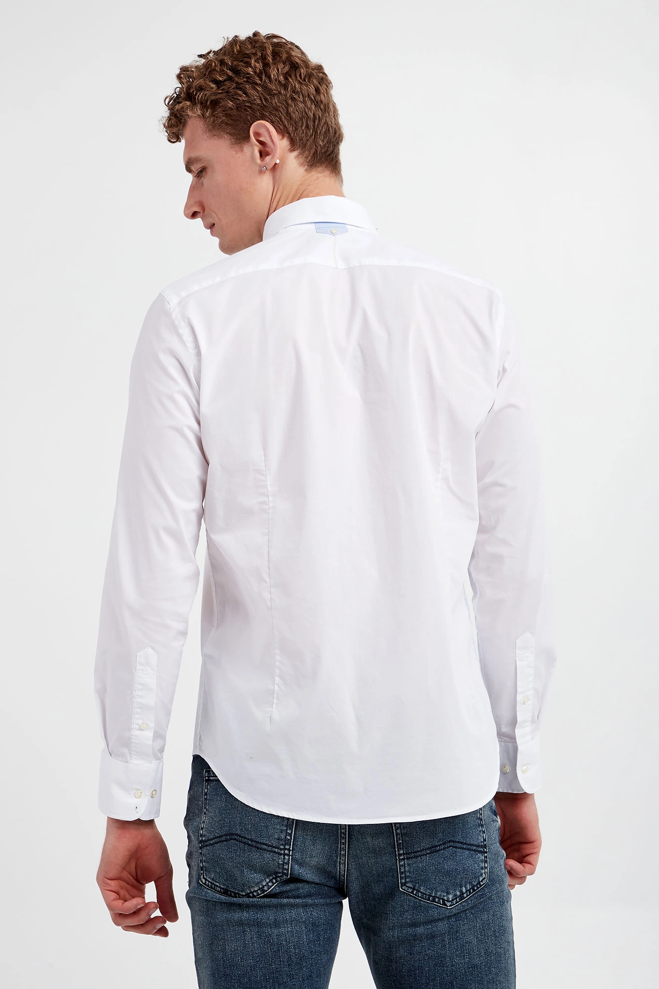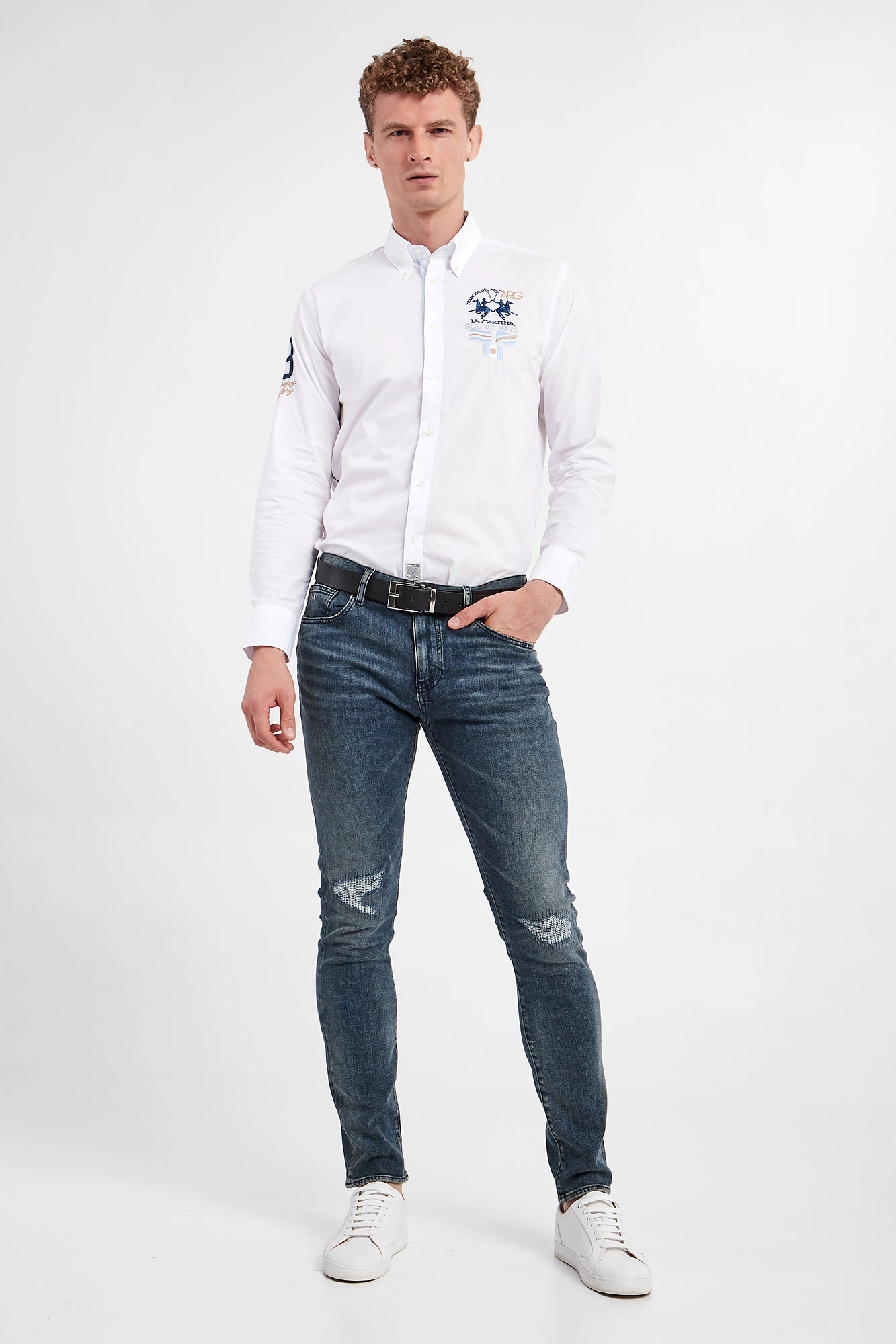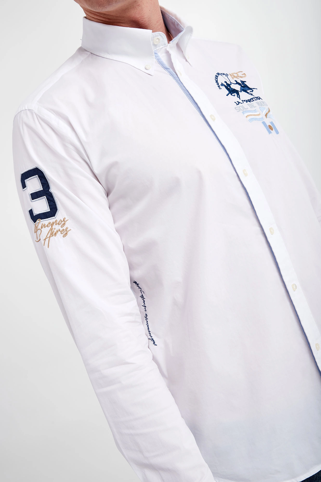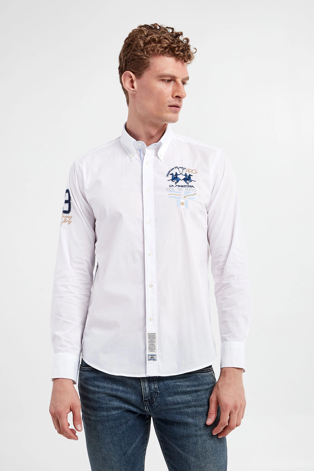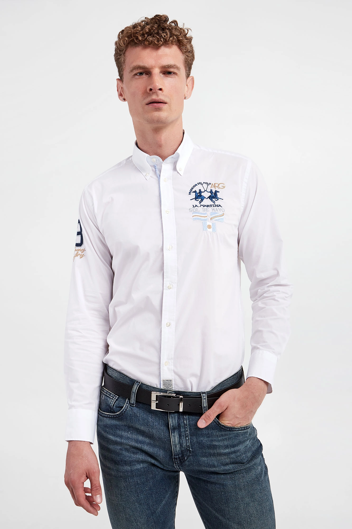 Popelinowa koszula marki La Martina w białym kolorze. Fason typu slim fit. Zapinana za pomocą perłowych guzików. Z klasycznym kołnierzem. Na piersi i lewym rękawie kolorowe hafty. Długie rękawy zakończone mankietami zapinanymi za pomocą guzików. Po boku dwukolorowy lampas. Wykonana z nieco elastycznej bawełny.