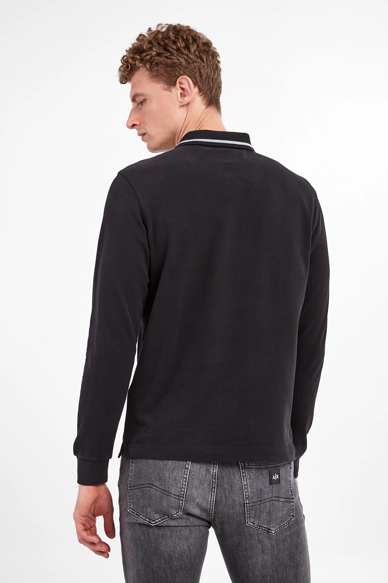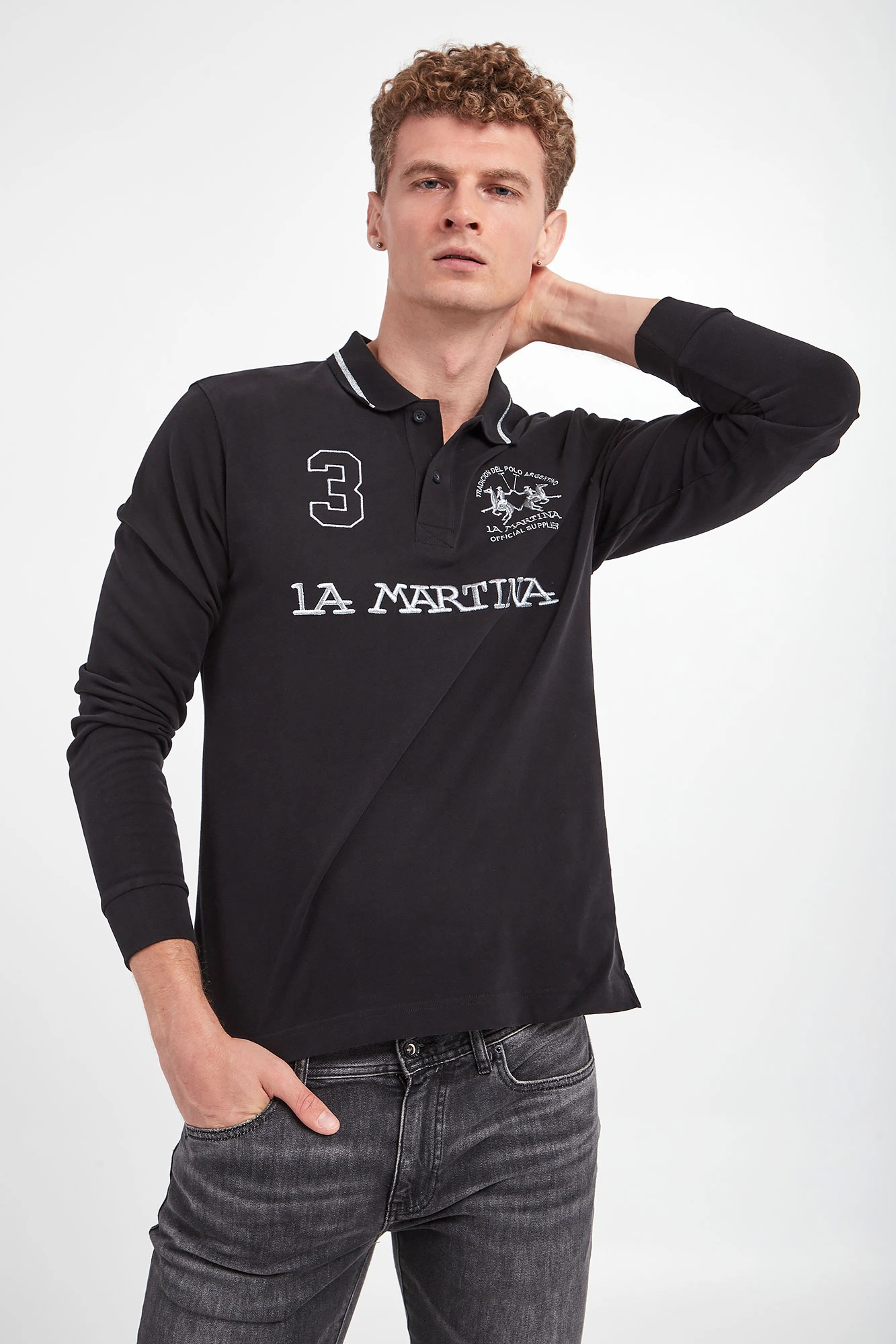 Bluza marki La Martina w czarnym kolorze. Z kołnierzem wykończonym połyskującym lampasem w srebrnym kolorze. Długie rękawy zakończone ściągaczem. Zapinana za pomocą sygnowanych guzików. Z przodu haft z logo i nazwą marki w szarym kolorze. Fason typu regular. Wykonana z czystej, bawełny.