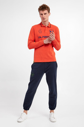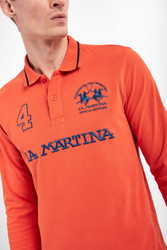 Bluza marki La Martina w pomarańczowym kolorze. Z kołnierzem wykończonym połyskującym lampasem w granatowym kolorze. Długie rękawy zakończone ściągaczem. Zapinana za pomocą sygnowanych guzików. Z przodu haft z logo i nazwą marki w granatowym kolorze. Fason typu regular. Wykonana z czystej, bawełny.