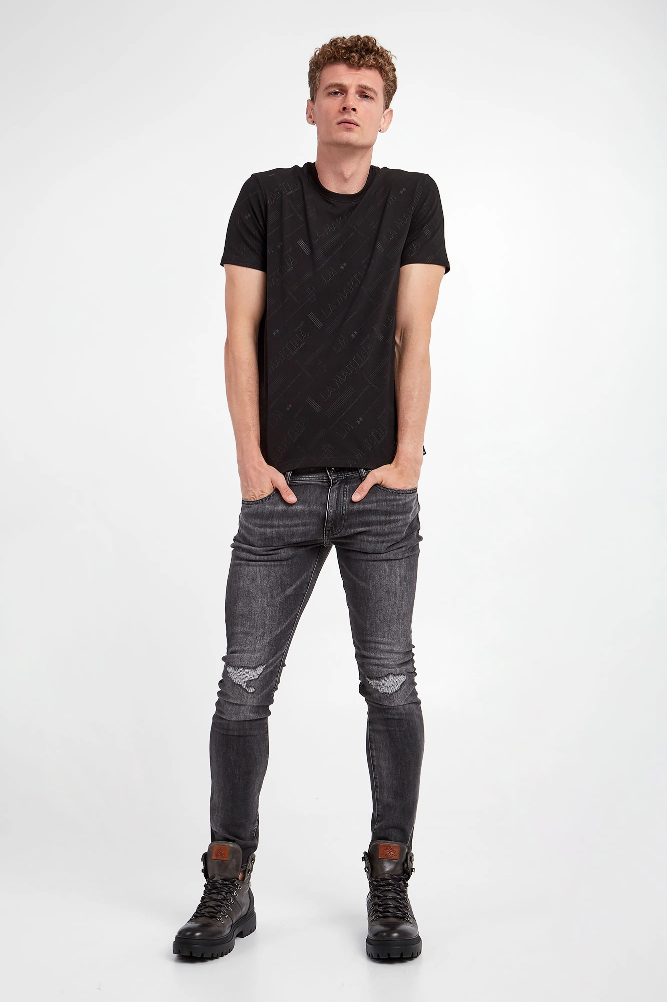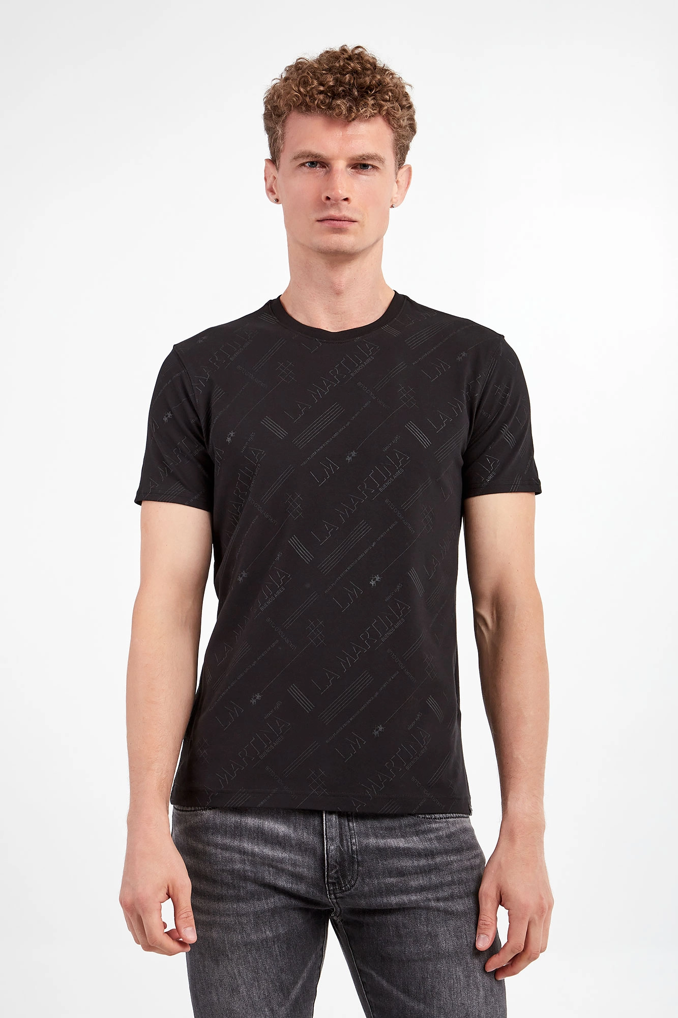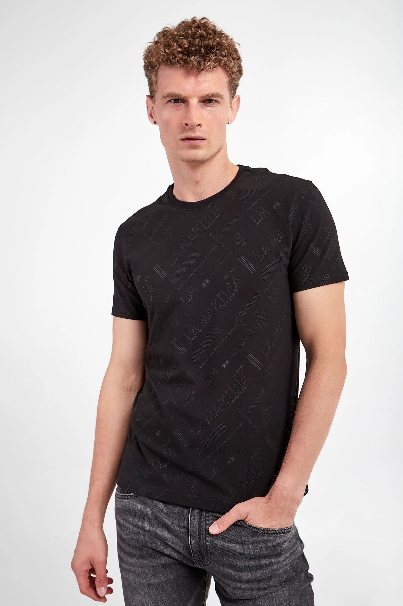 T-shirt marki La Martina w czarnym kolorze. Krótkie rękawy i dół wykończone przeszyciem. Okrągły dekolt typu o-neck zakończony ściągaczem. Na całości nadruk z nazwą i logo marki. Wykonana z nieco elastycznej bawełny. Fason slim.